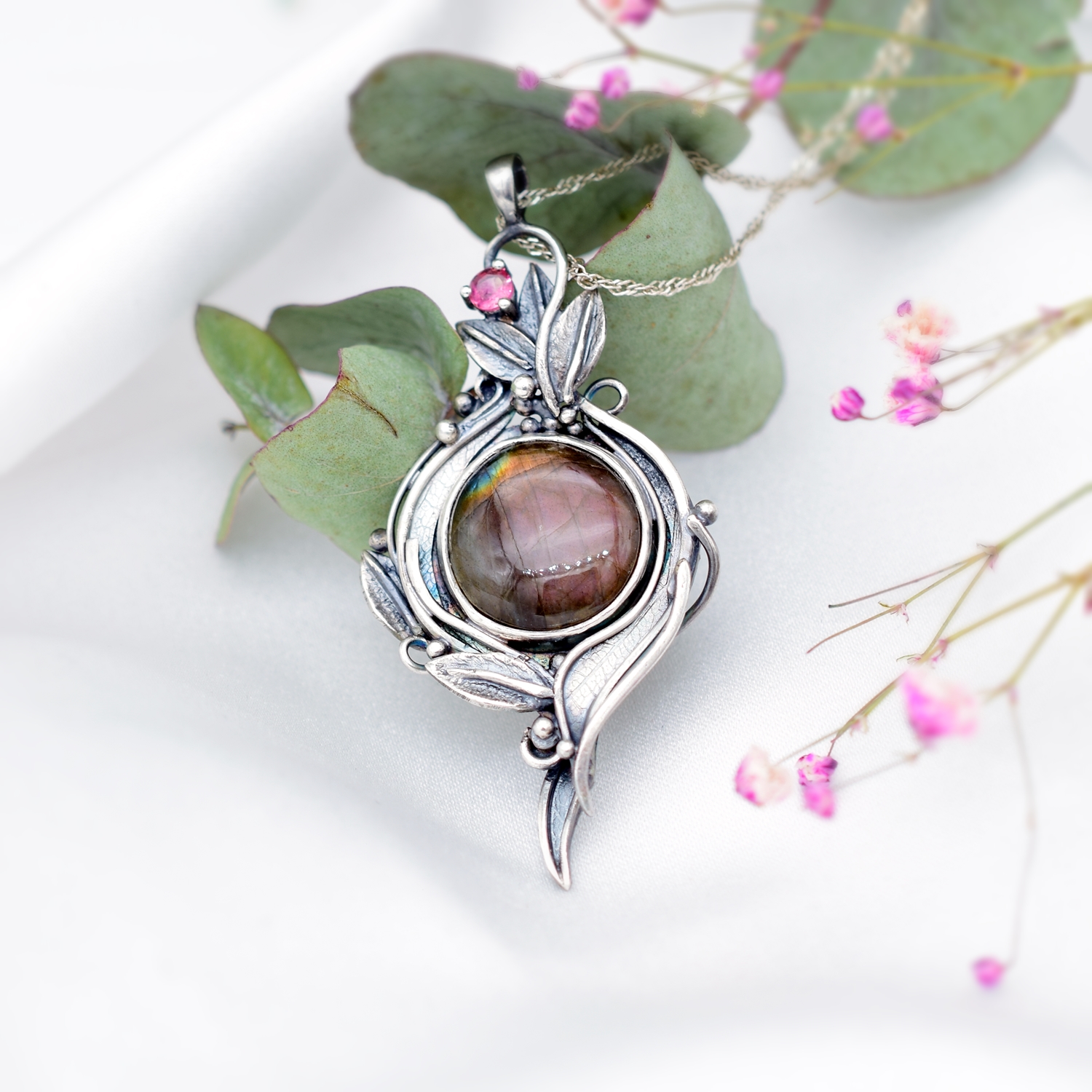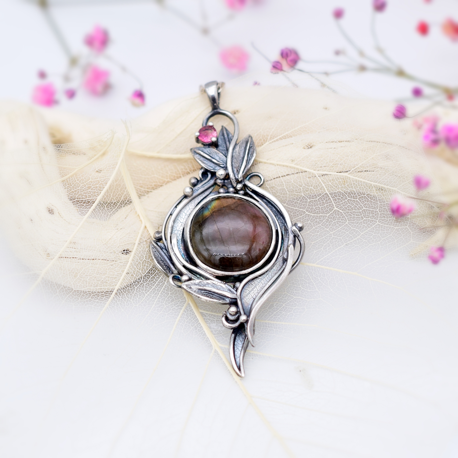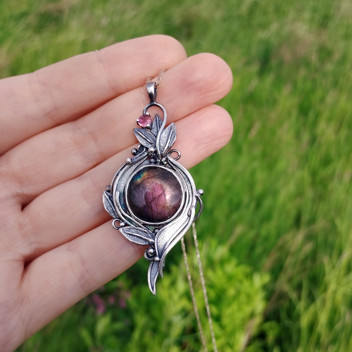 Wisiorek emanujący magicznym nastrojem i baśniową harmonią, z wielobarwnym labradorytem i różowym turmalinem.