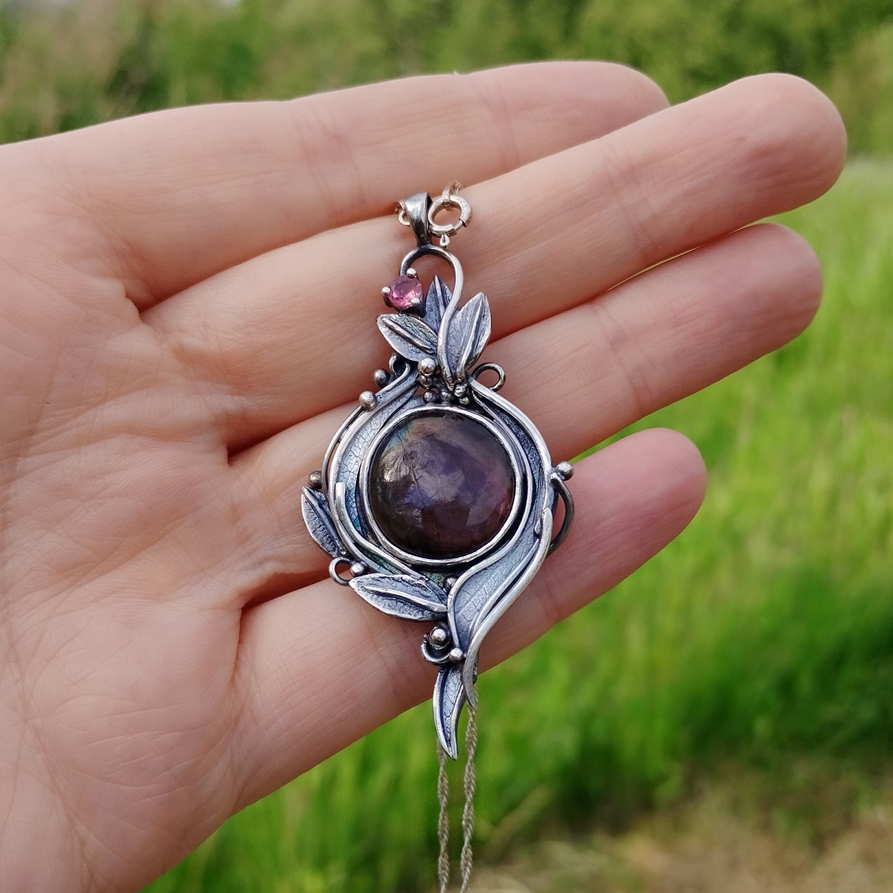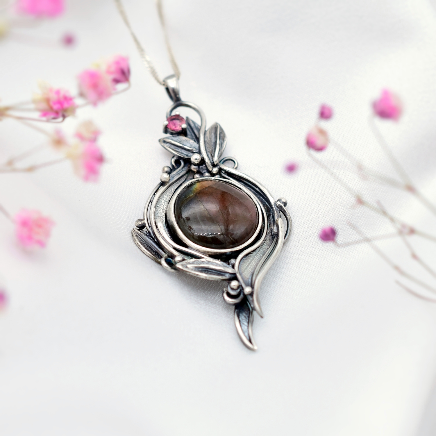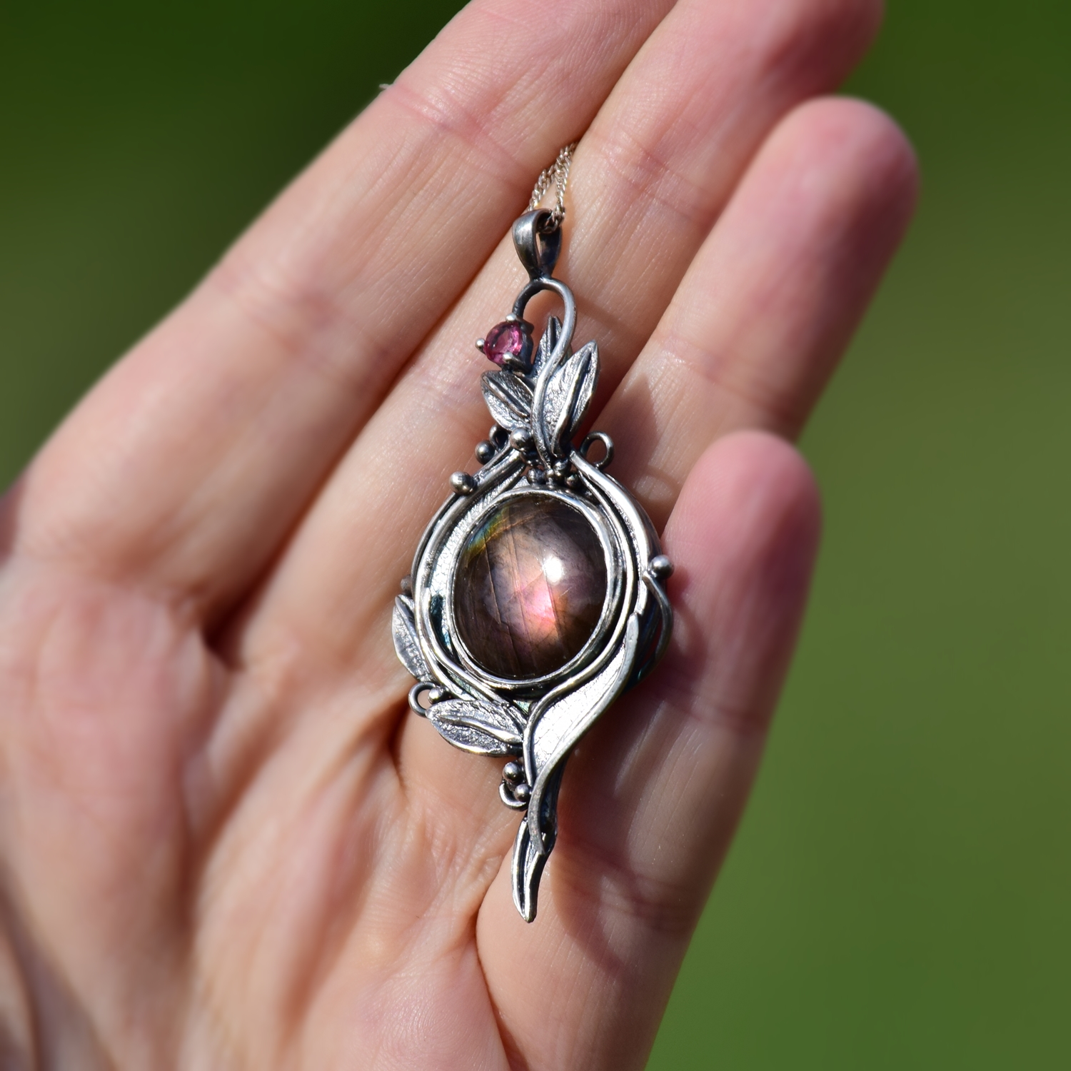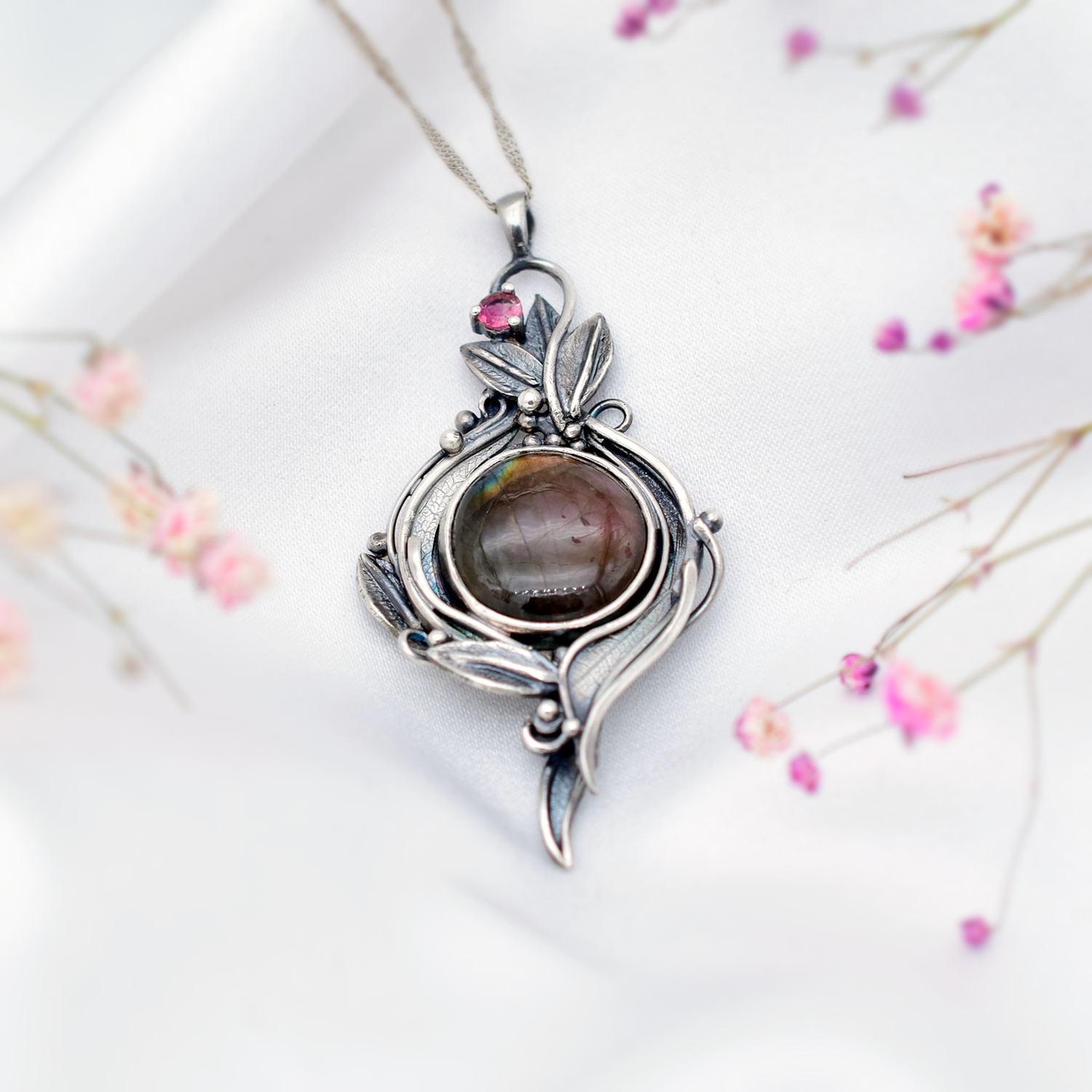 Wisiorek emanujący magicznym nastrojem i baśniową harmonią, z wielobarwnym labradorytem i różowym turmalinem.