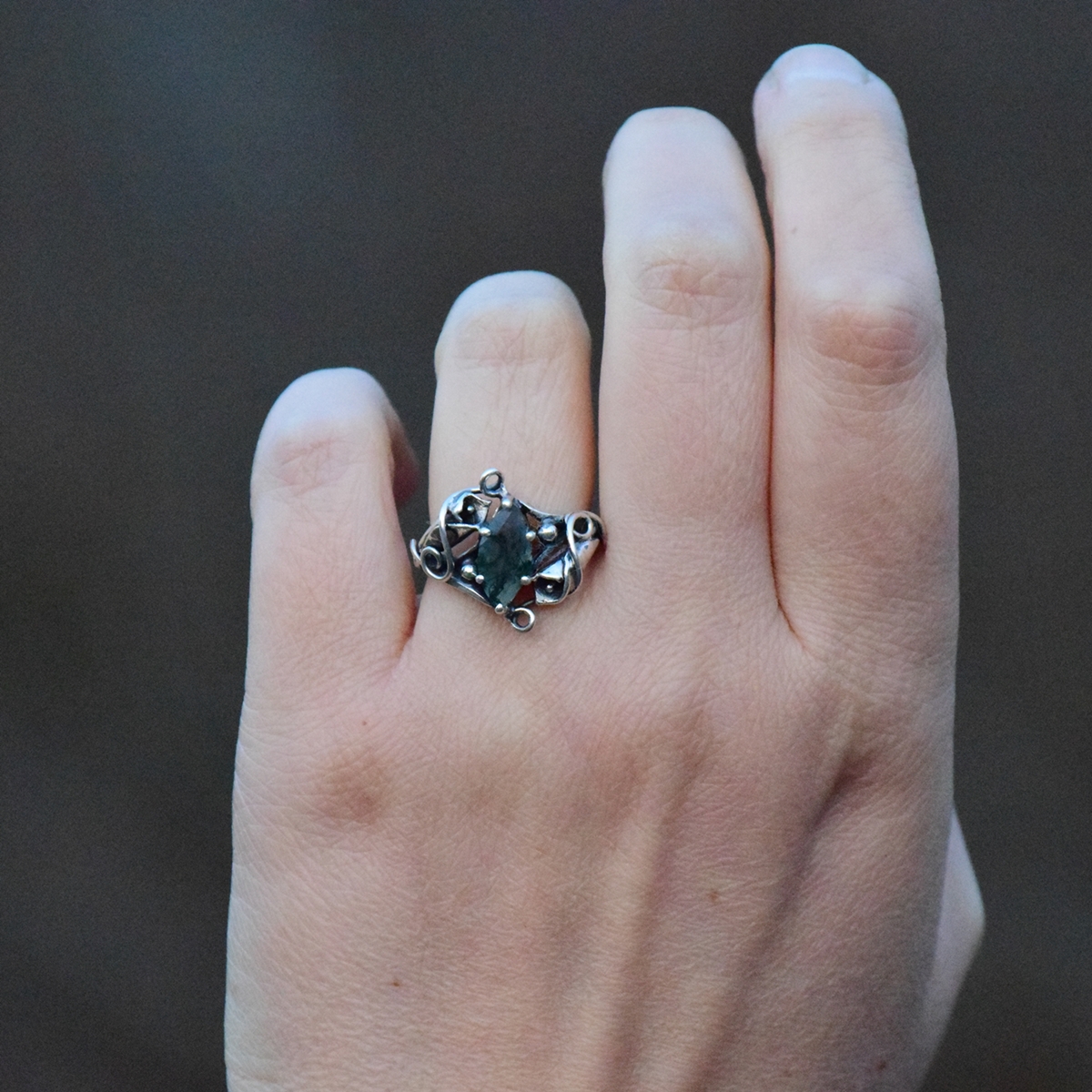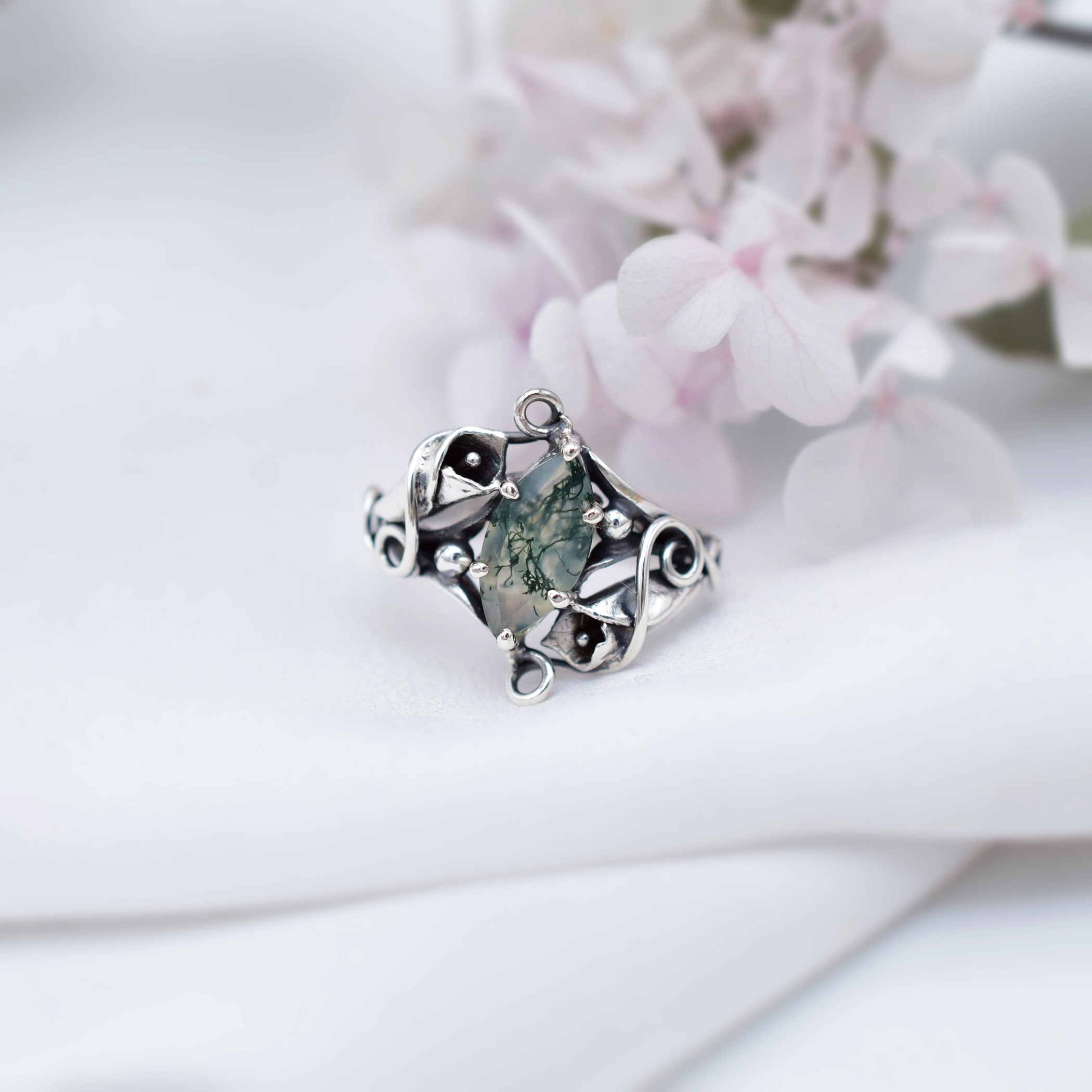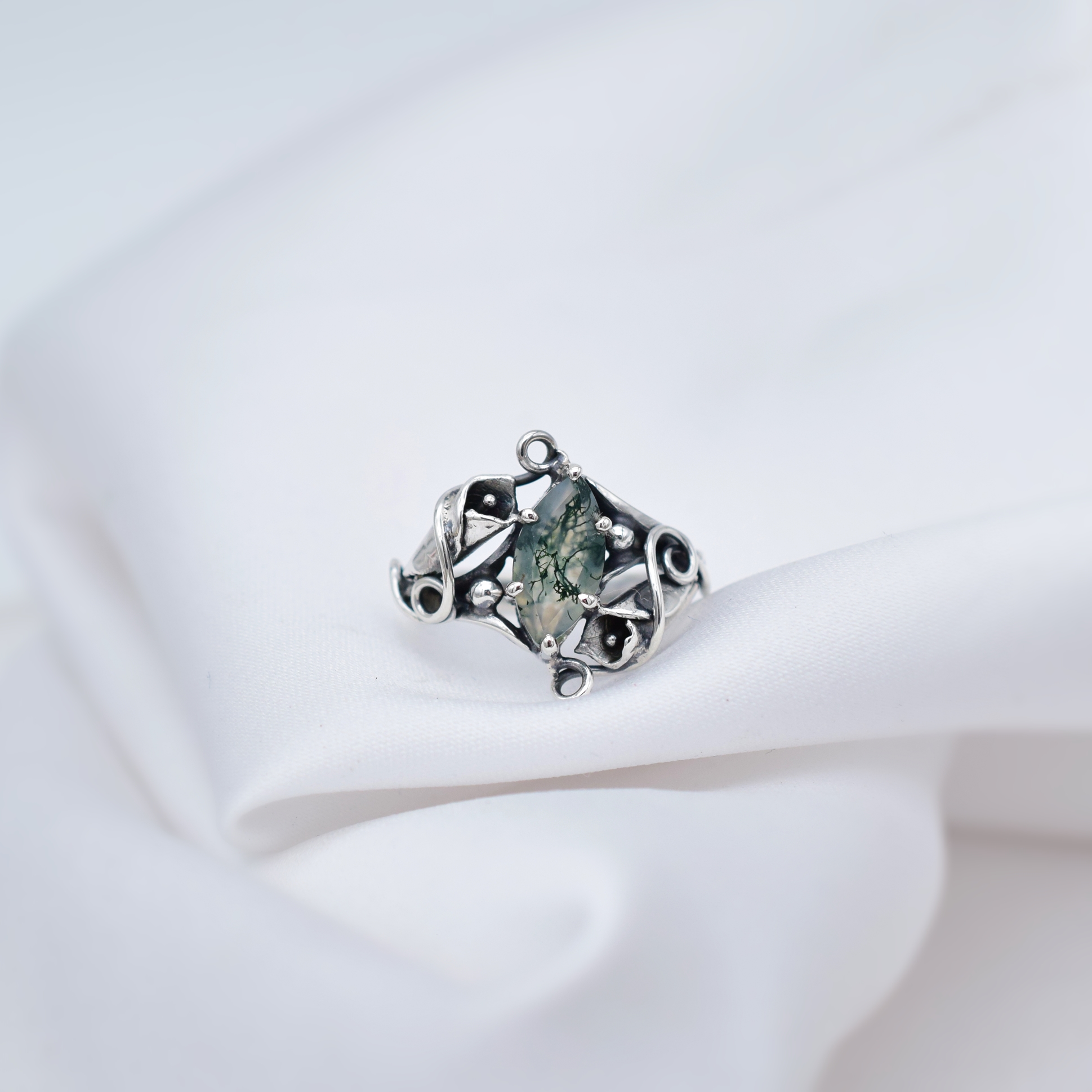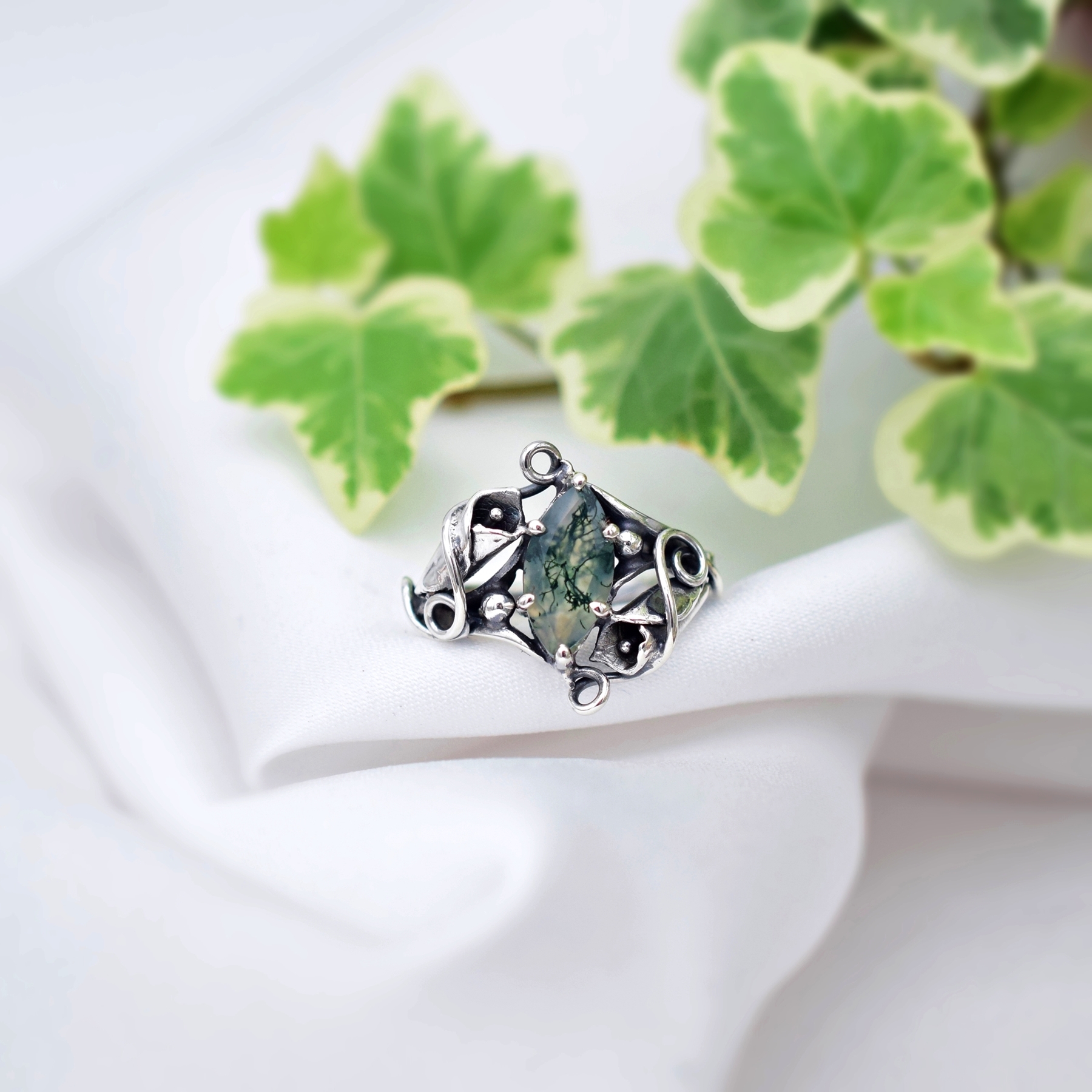 W sercu pierścionka osadzona jest markiza agatu mszystego - kamienia z unikalnym, „leśnym” wzorem, przypominającym mchy ukryte w cieniu drzew.