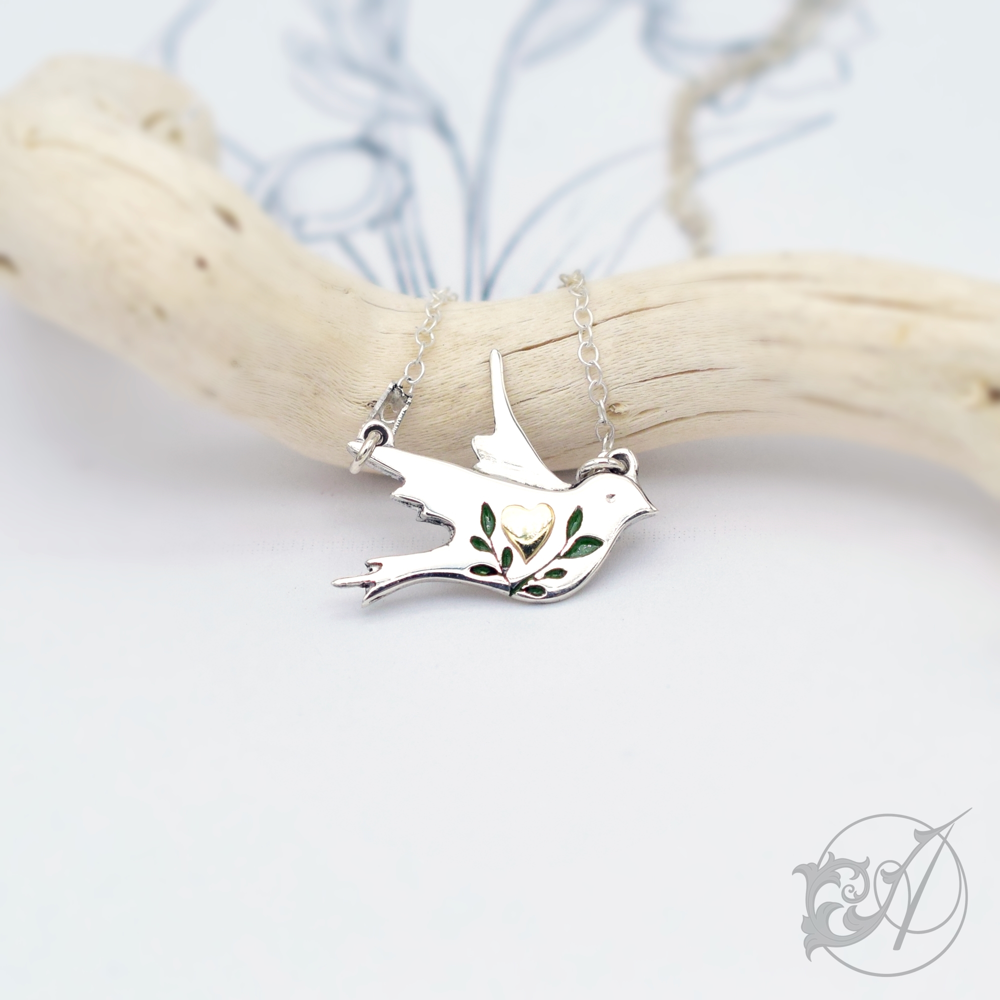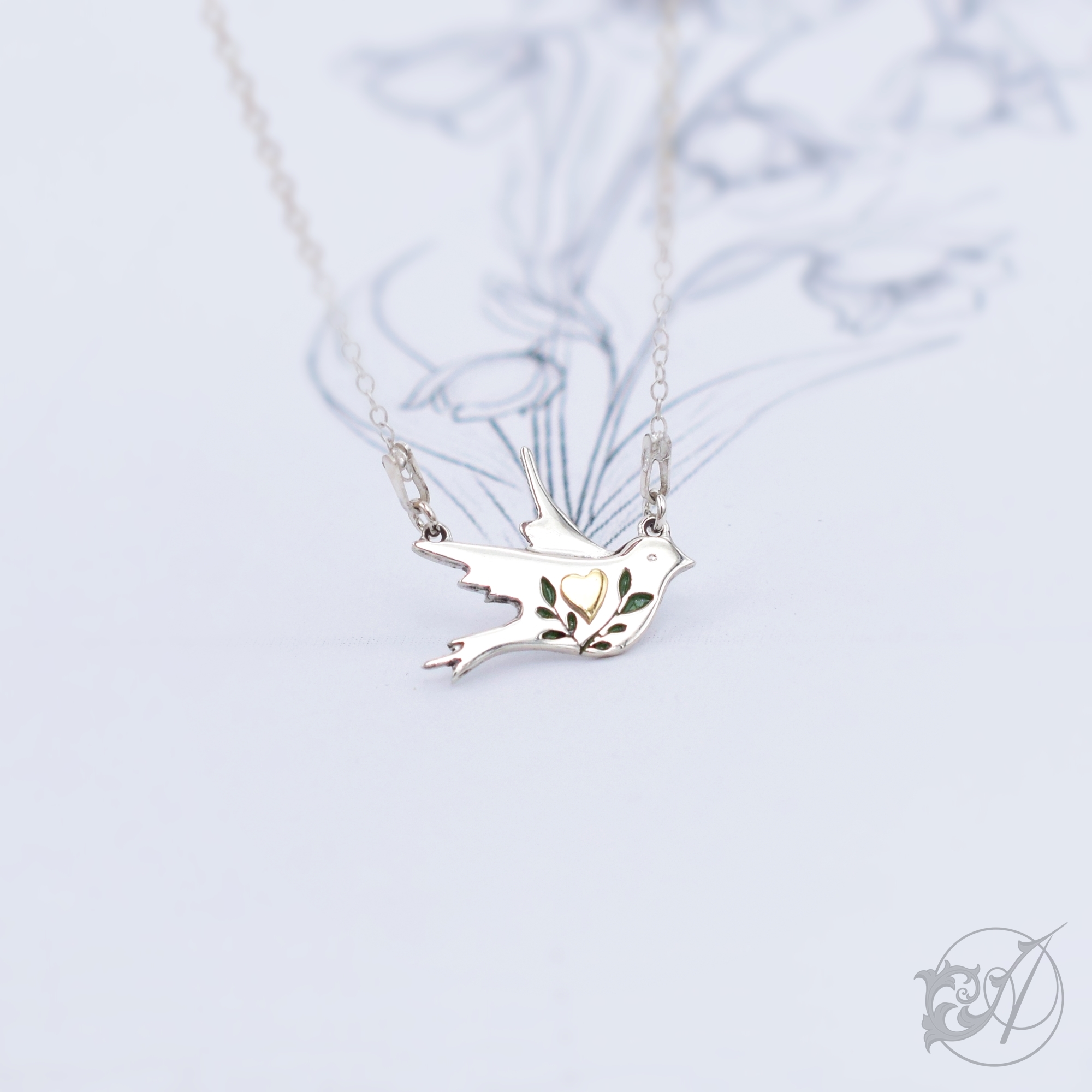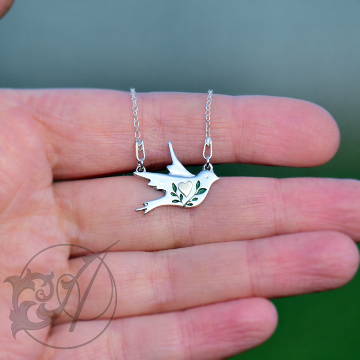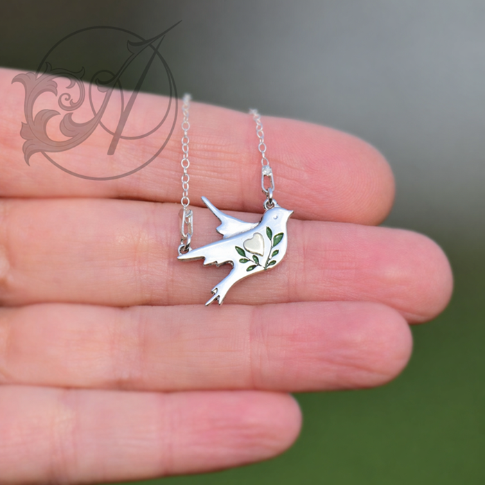 Wykonany ze srebra ptaszek ozdobiony jest sercem oraz emaliowanymi, zielonymi gałązkami.