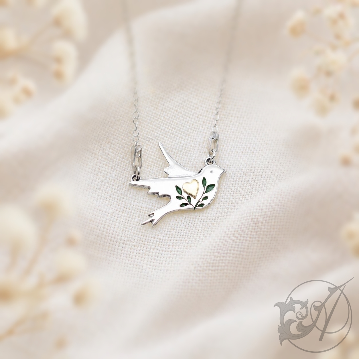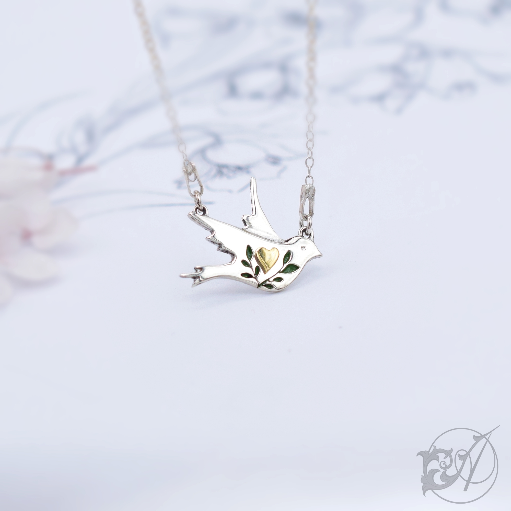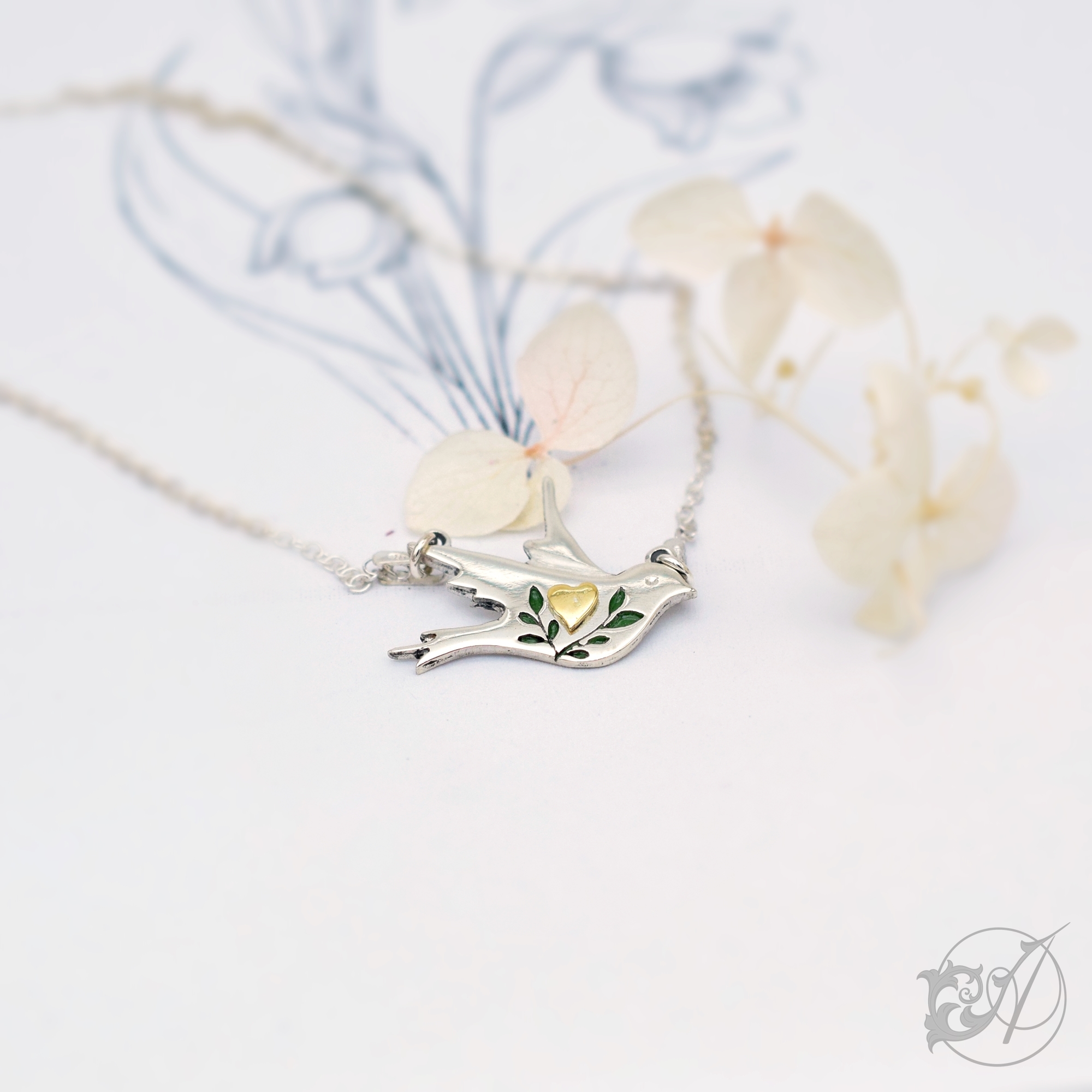 Wykonany ze srebra ptaszek ozdobiony jest sercem oraz emaliowanymi, zielonymi gałązkami.