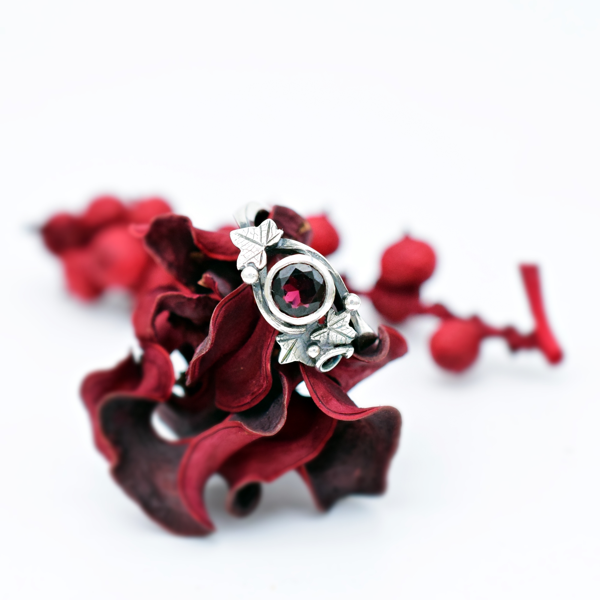 Dystyngowana kompozycja karminowego granatu rodolit i oksydowanego srebra. Kamień otula asymetryczna, inspirowana naturą oprawa, w której motyw bluszczu oplata granat, który dzięki nasyconej, szlachetnej barwie czerwieni mocno przyciąga wzrok.
