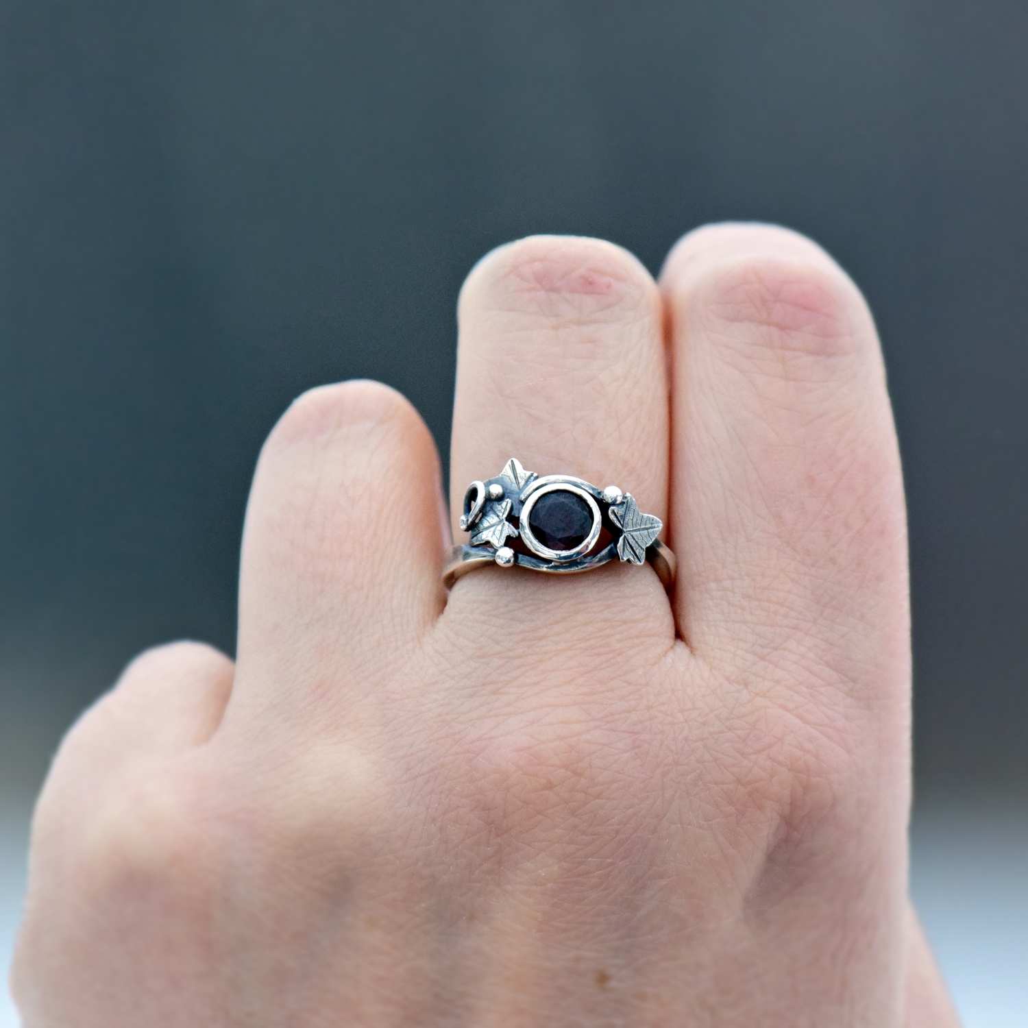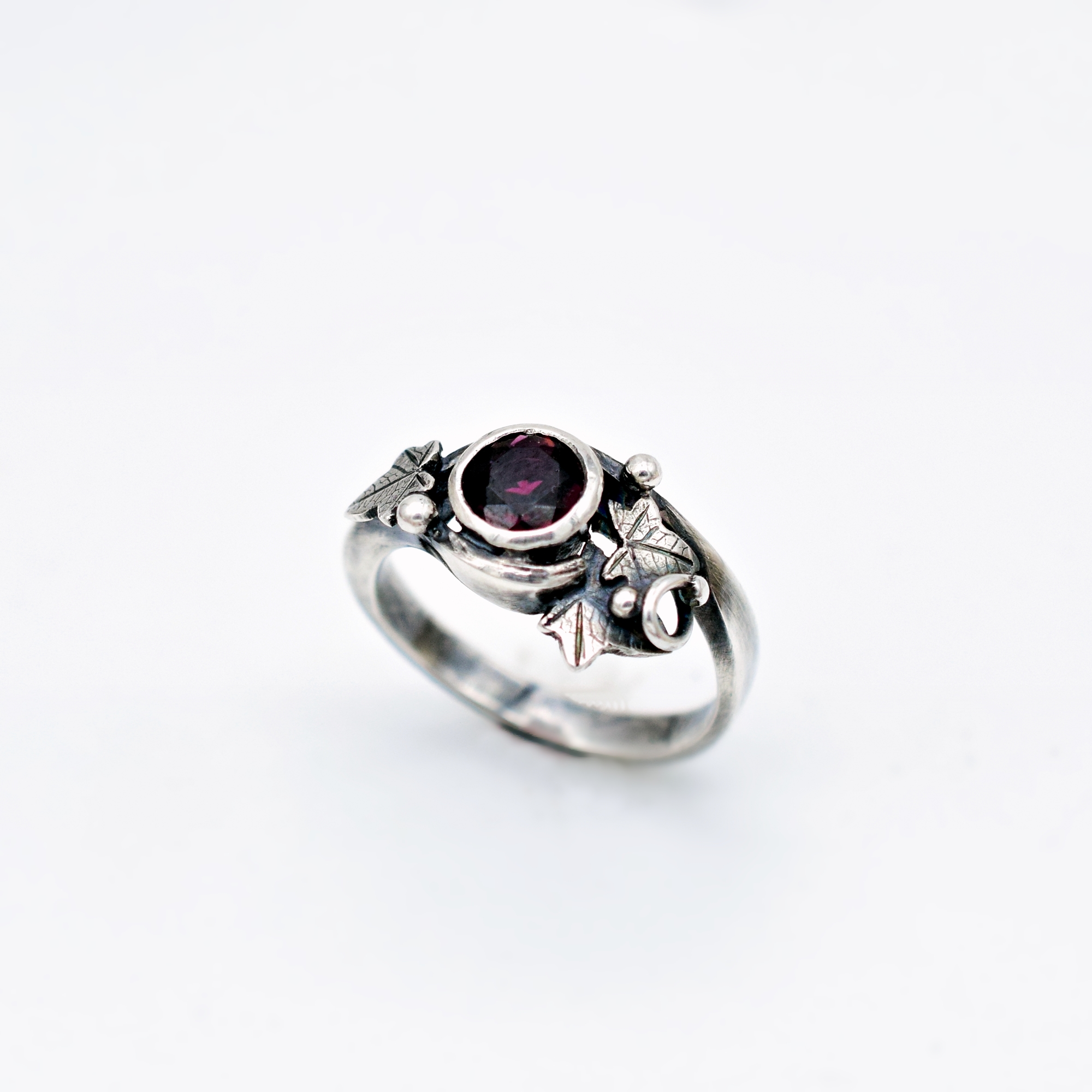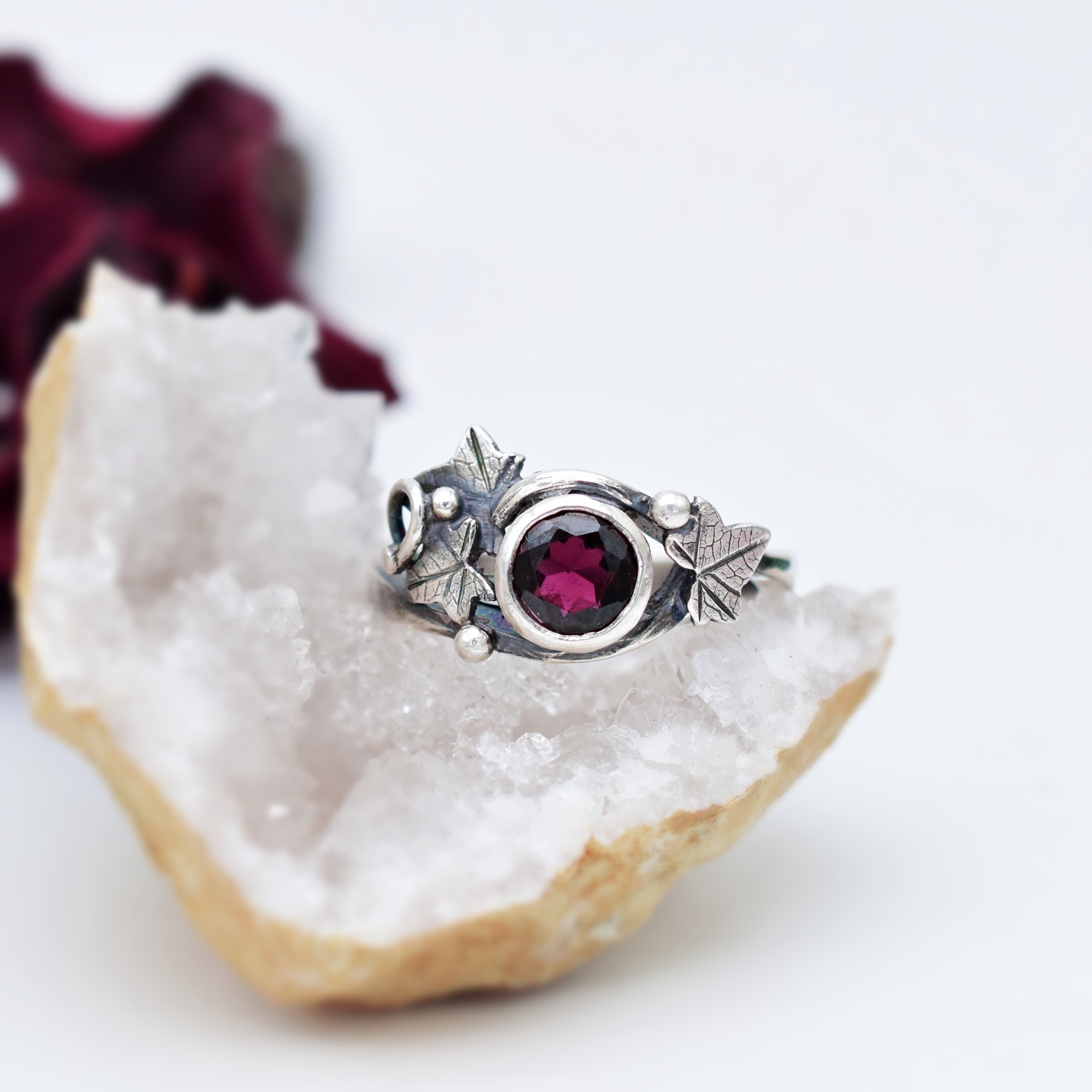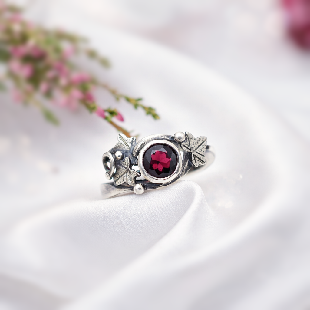 Leśny Pierścionek z Bluszczem i Granatem Rodolit