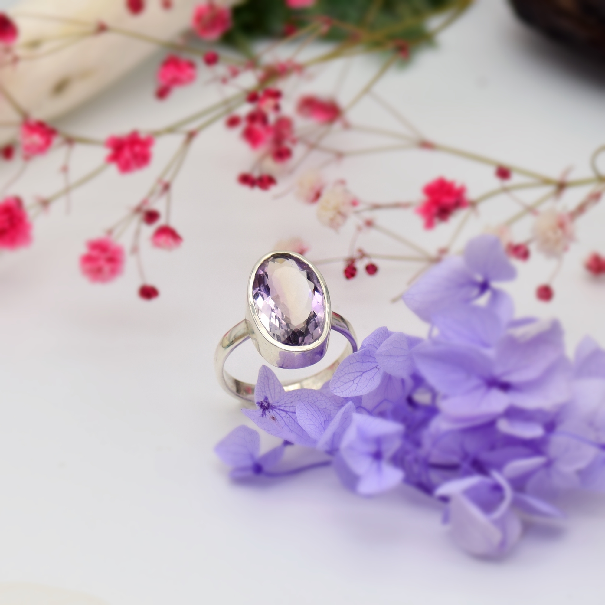 Kobiecy pierścionek w klasycznej formie dla miłośniczki ponadczasowej elegancji. Pierścionek zdobi fasetowany ametryn o subtelnych barwach.