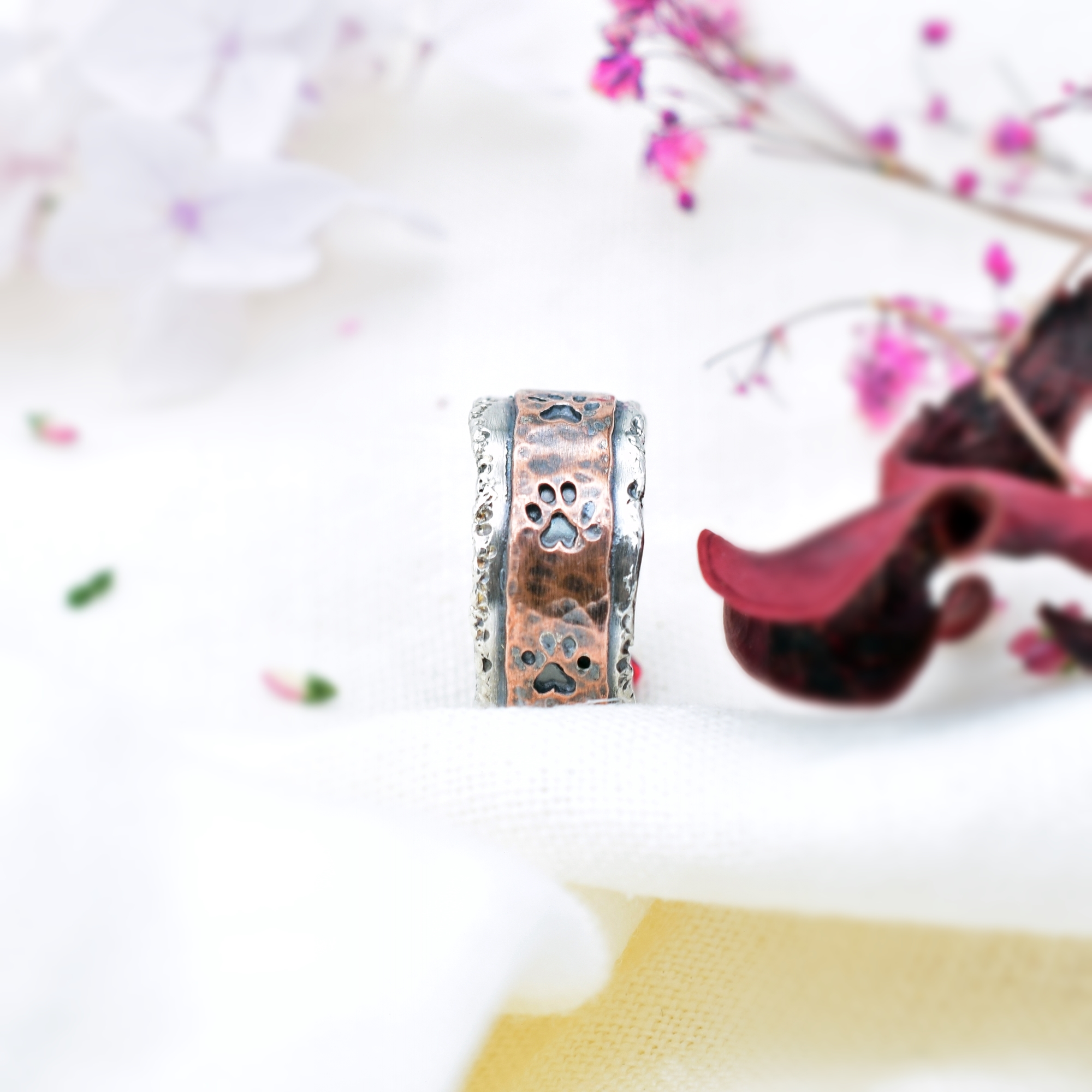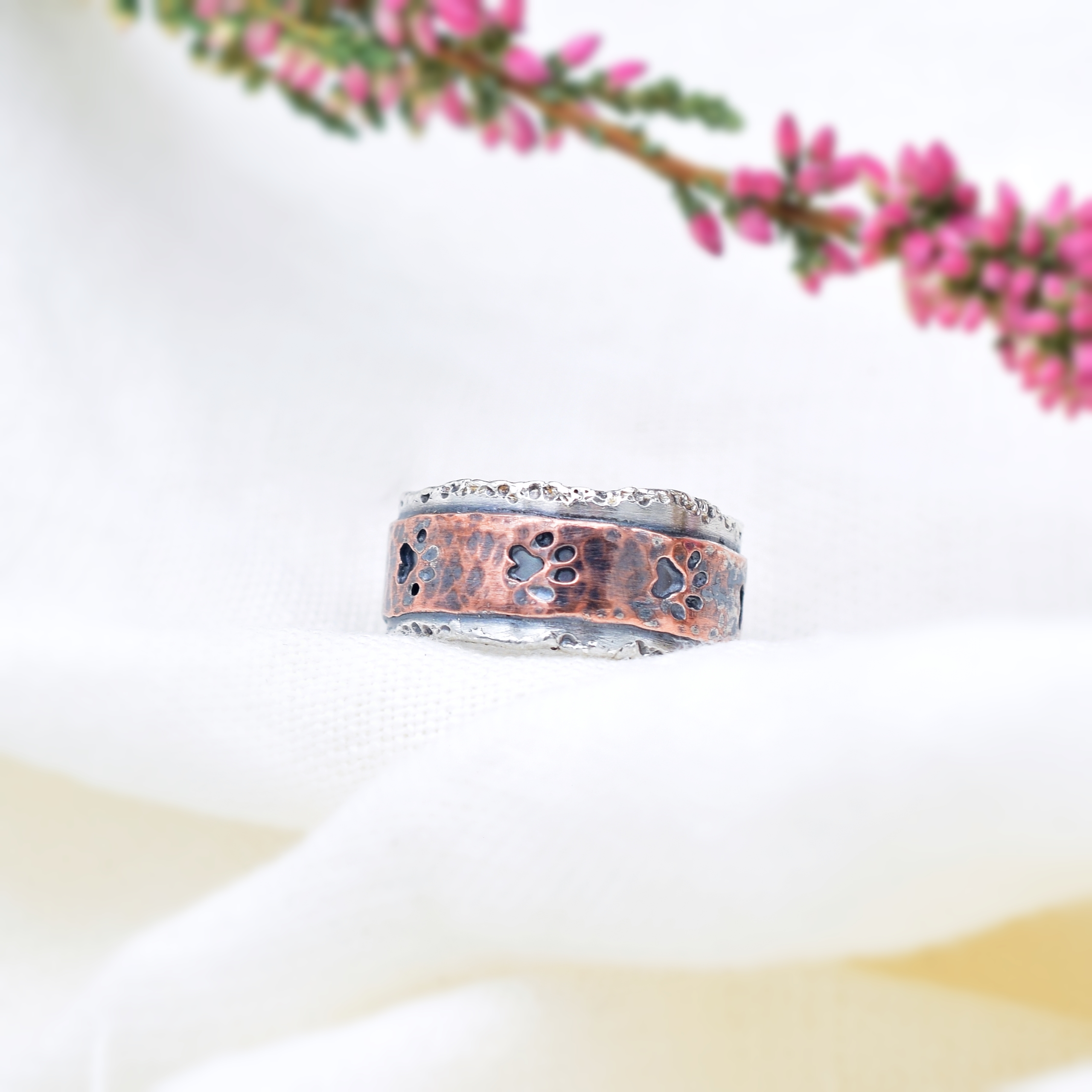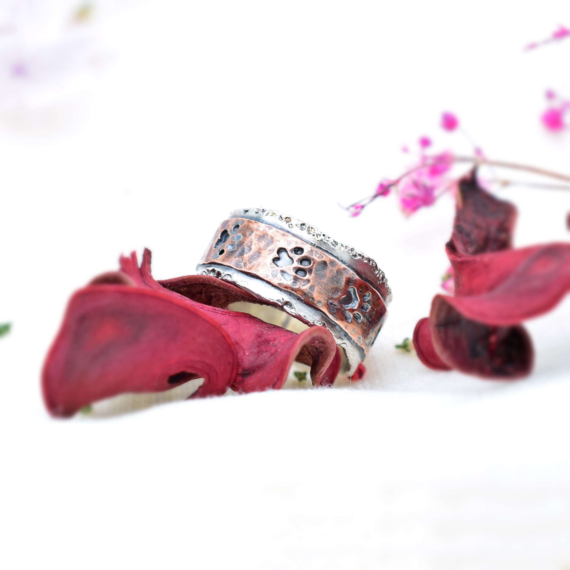 Unikatowy pierścionek o artystycznym charakterze z motywem kocich łapek, stworzony ze zgranego połączenia srebra i miedzi. Miedziany pasek ozdobiony jest wyciętymi śladami kocich łapek, który nadają pierścionkowi symboliczny wymiar – idealny dla miłośniczki tych wyjątkowych stworzeń.