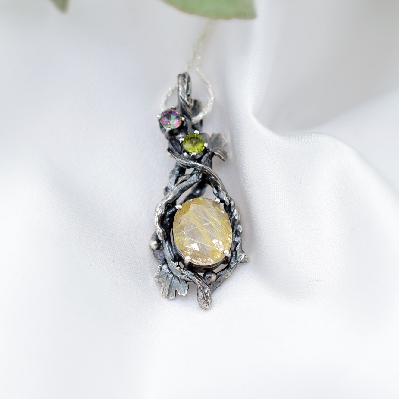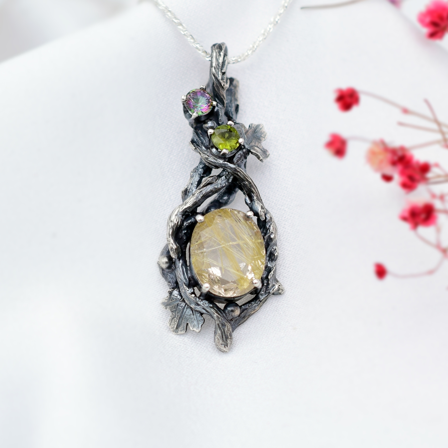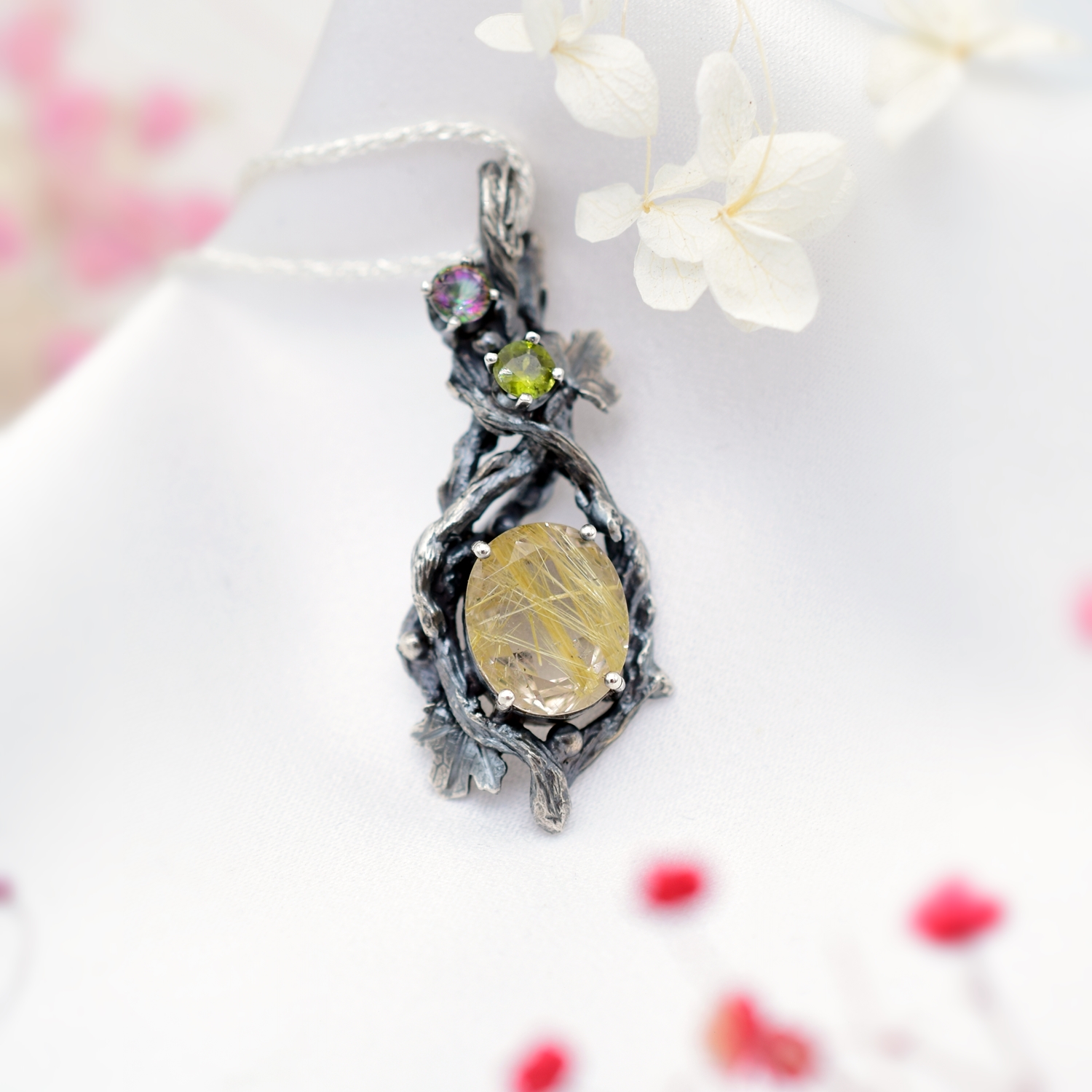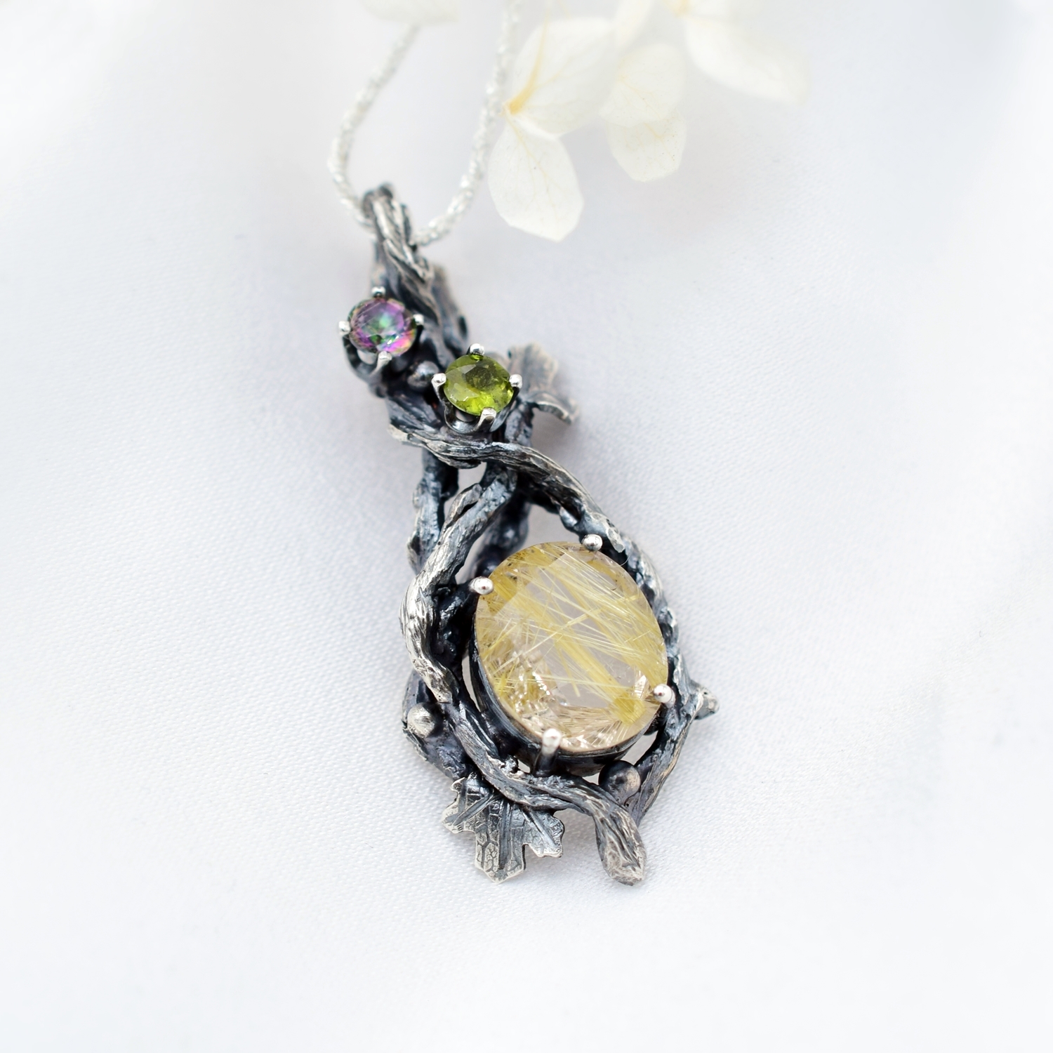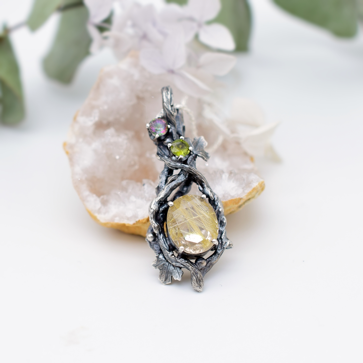 Wisiorek z naturalnym kwarcem z rutylem wykonany został w całości ręcznie ze srebra w naszej pracowni.
