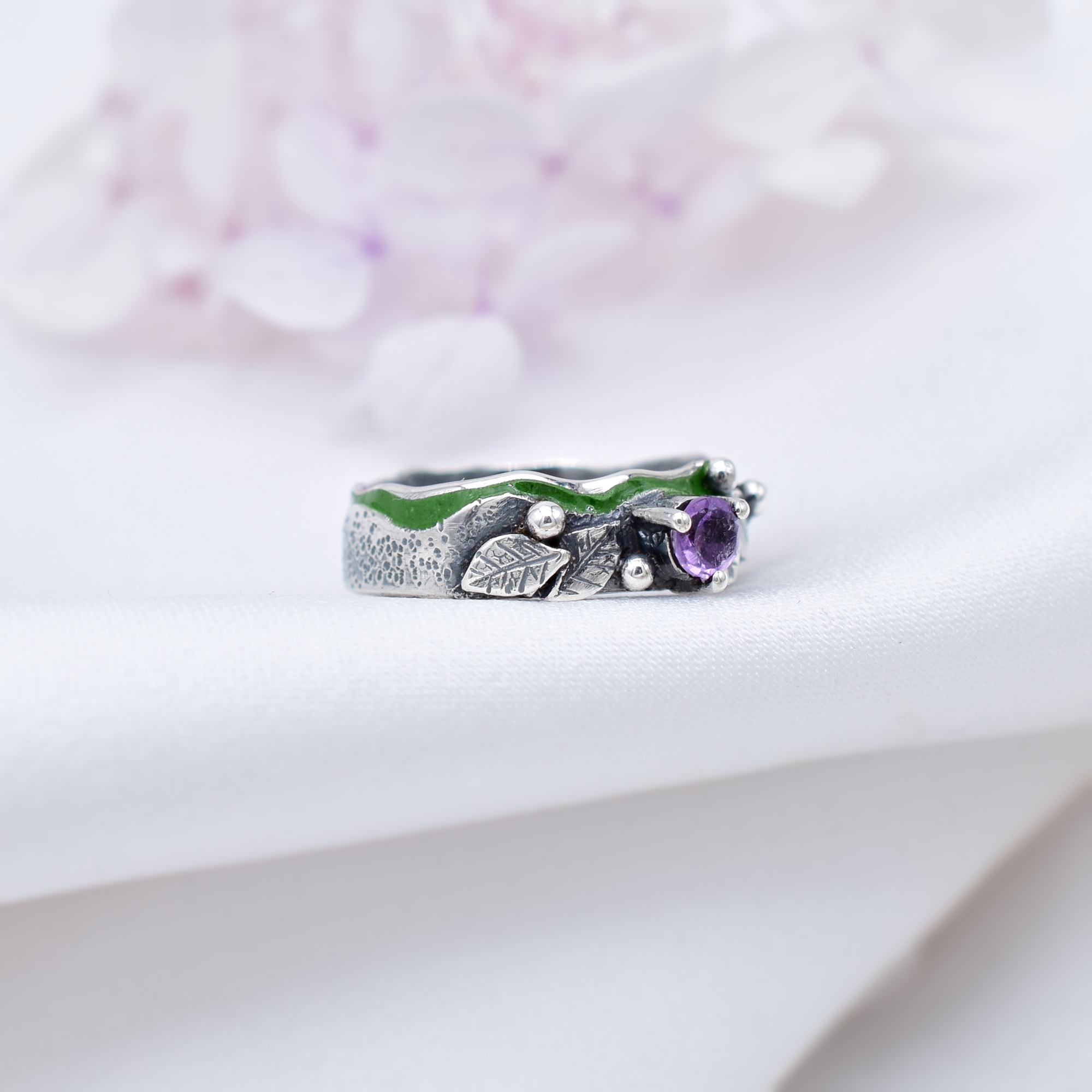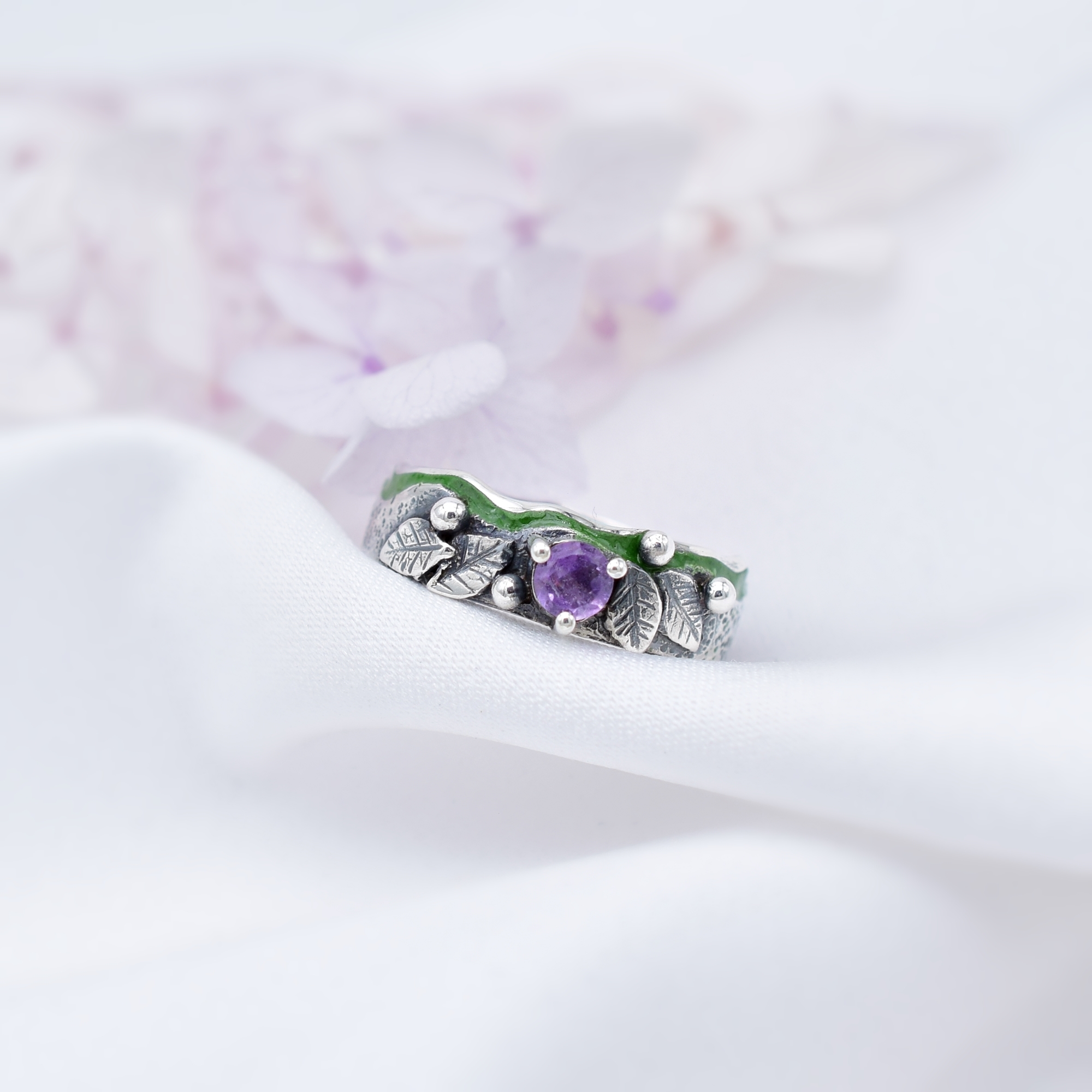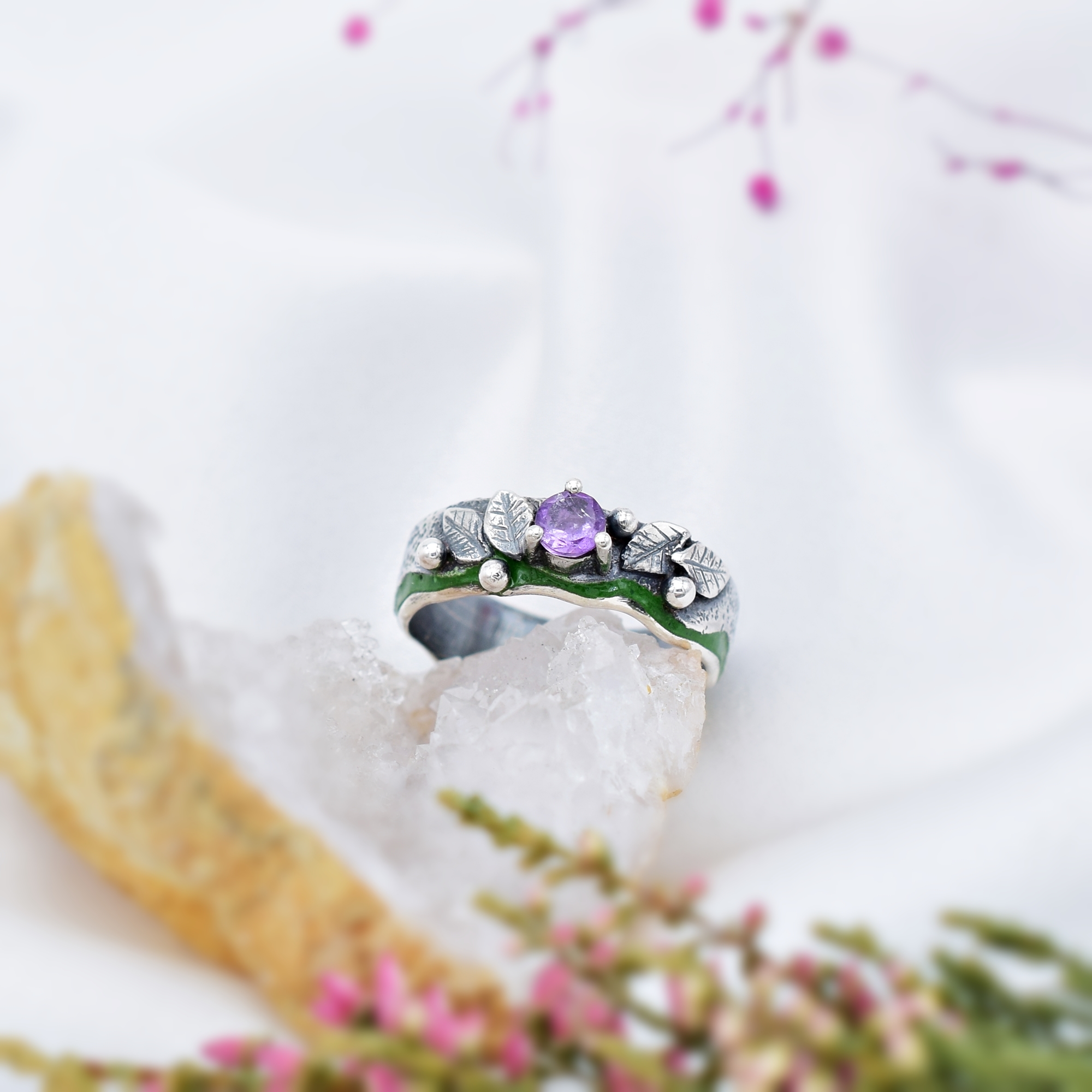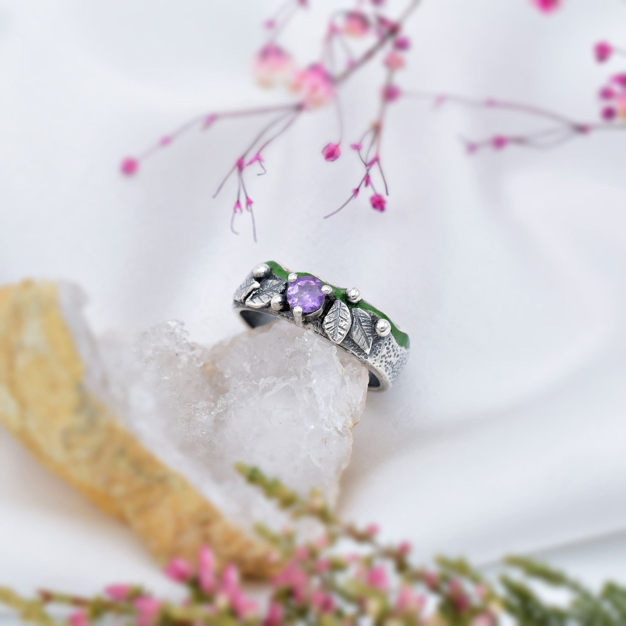 Delikatne listki i srebrne detale tworzą wyjątkową kompozycję, w której centralne miejsce zajmuje piękny, fioletowy ametyst.