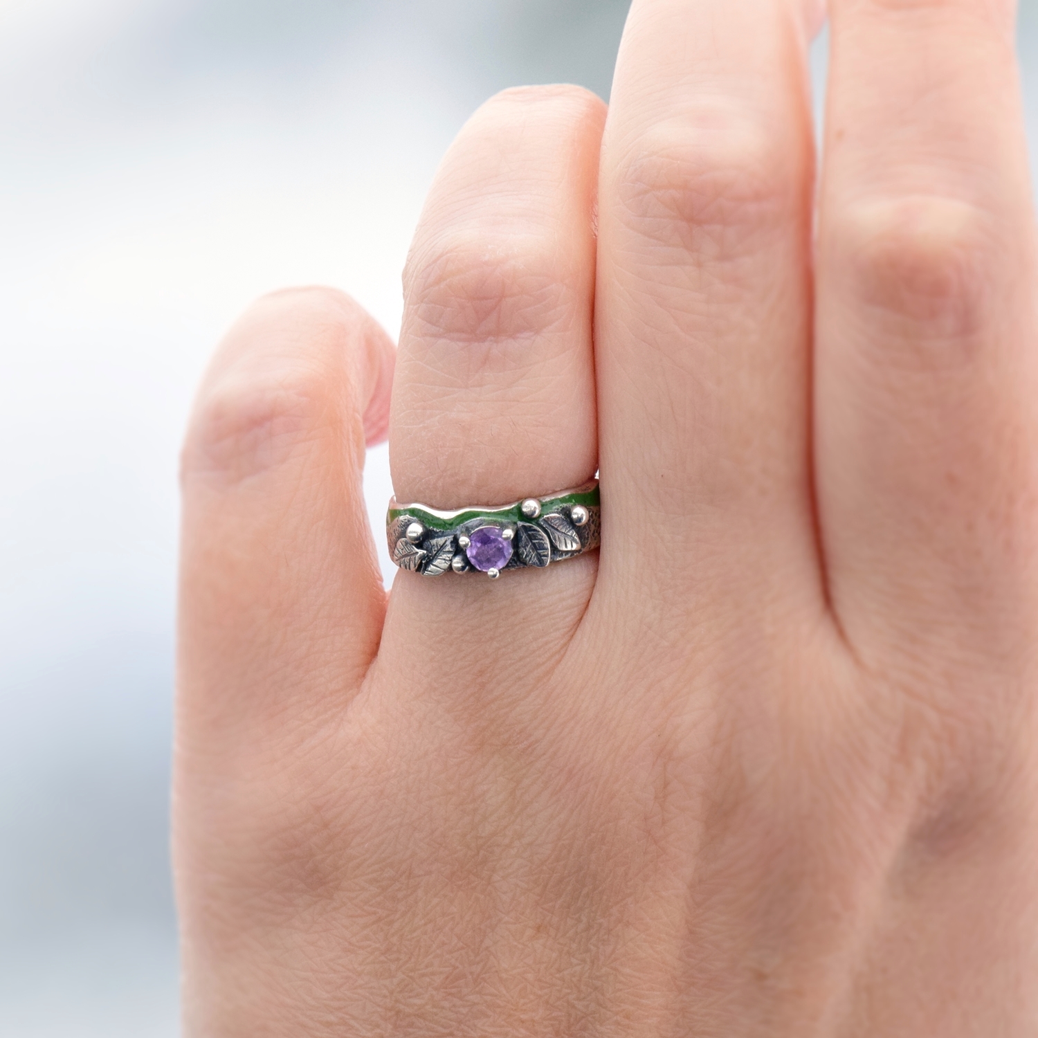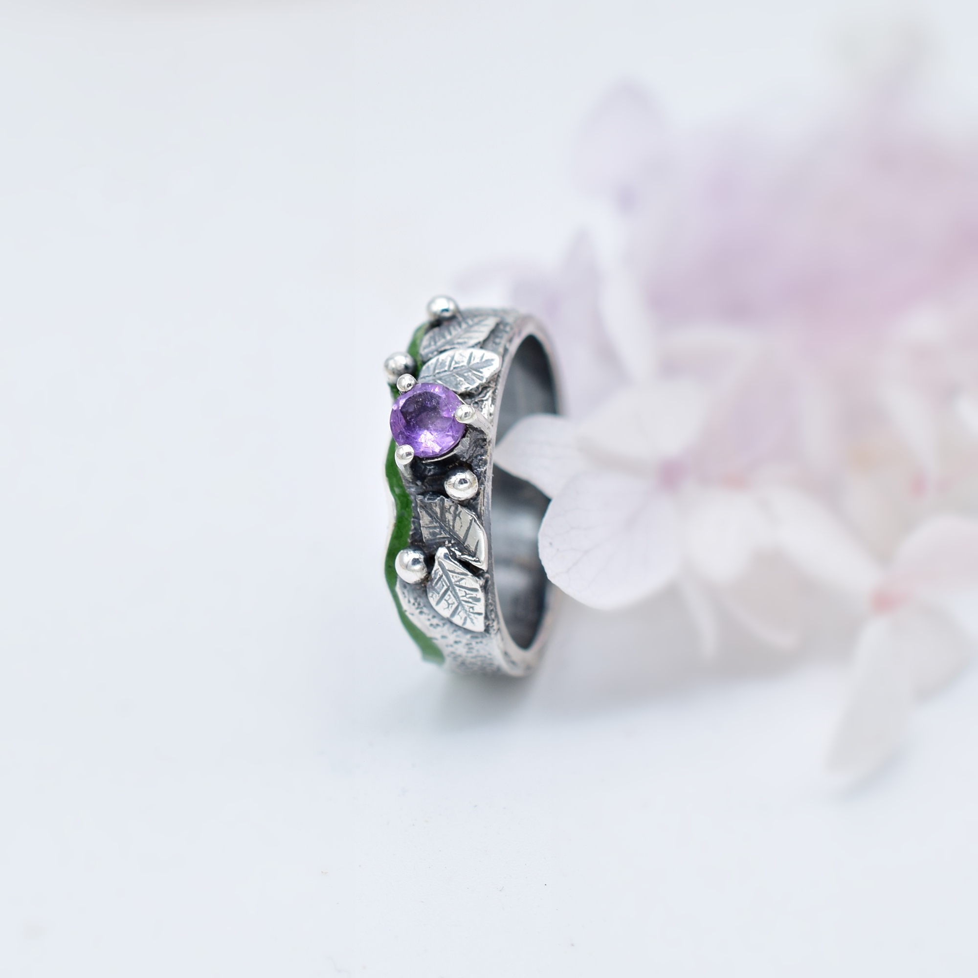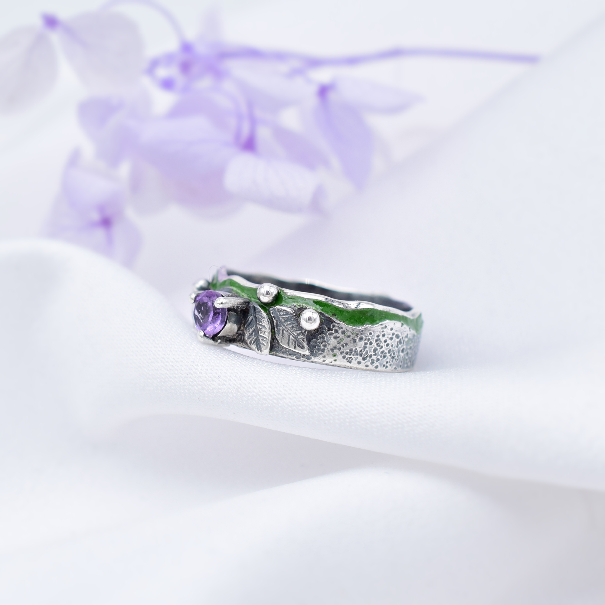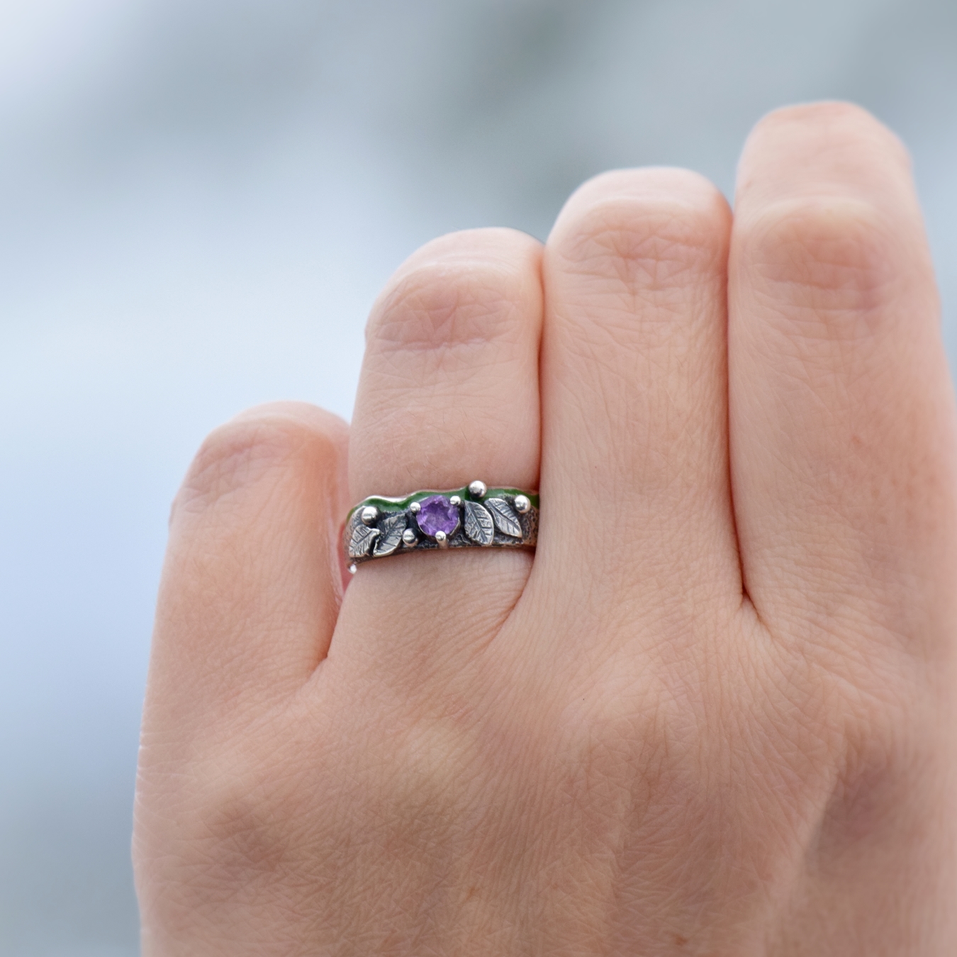 Delikatne listki i srebrne detale tworzą wyjątkową kompozycję, w której centralne miejsce zajmuje piękny, fioletowy ametyst.