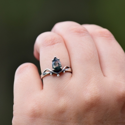 Srebrny pierścionek zwieńczony łezką agatu mszystego. Obrączka pierścionka ma kształt eleganckiego chevronu, ozdobionego pojedynczymi, srebrnymi kuleczkami.