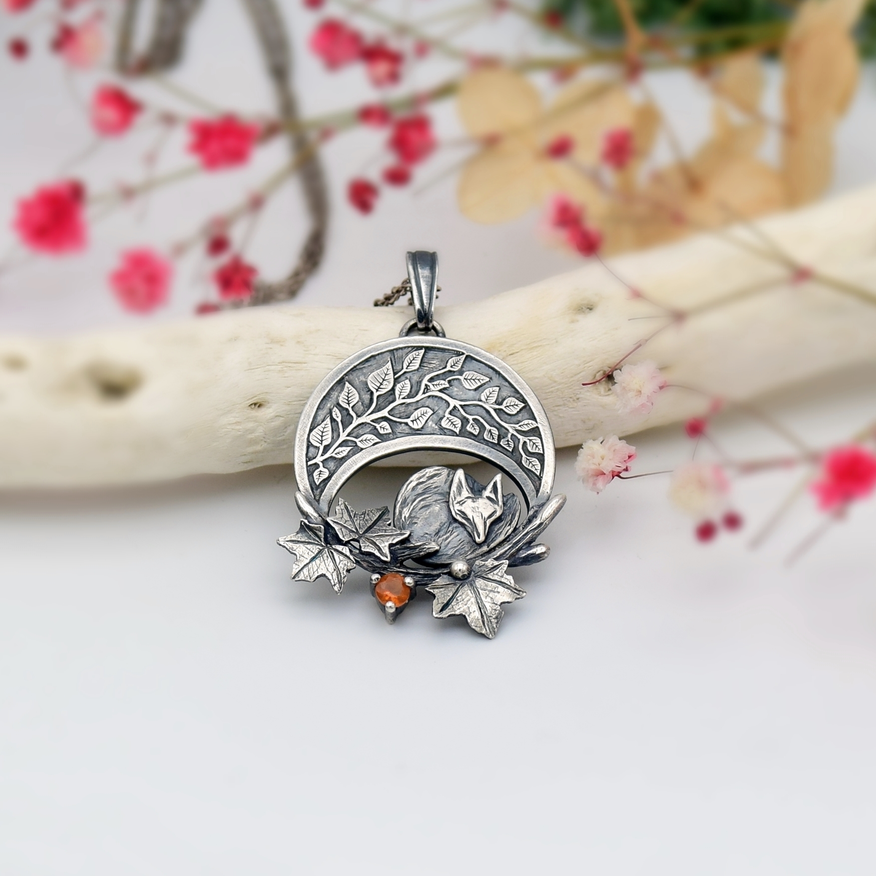 Wisiorek przywodzi na myśl zaczarowaną scenerię rodem z bajki. Śpiącego w jamie lisa otula srebrny półksiężyc ozdobiony ręcznie grawerowanymi listkami. Od spodu osłania go gałązka udekorowana listkami klonu i drobnym opalem ognistym, którego kolor odzwierciedla rude umaszczenie lisa.