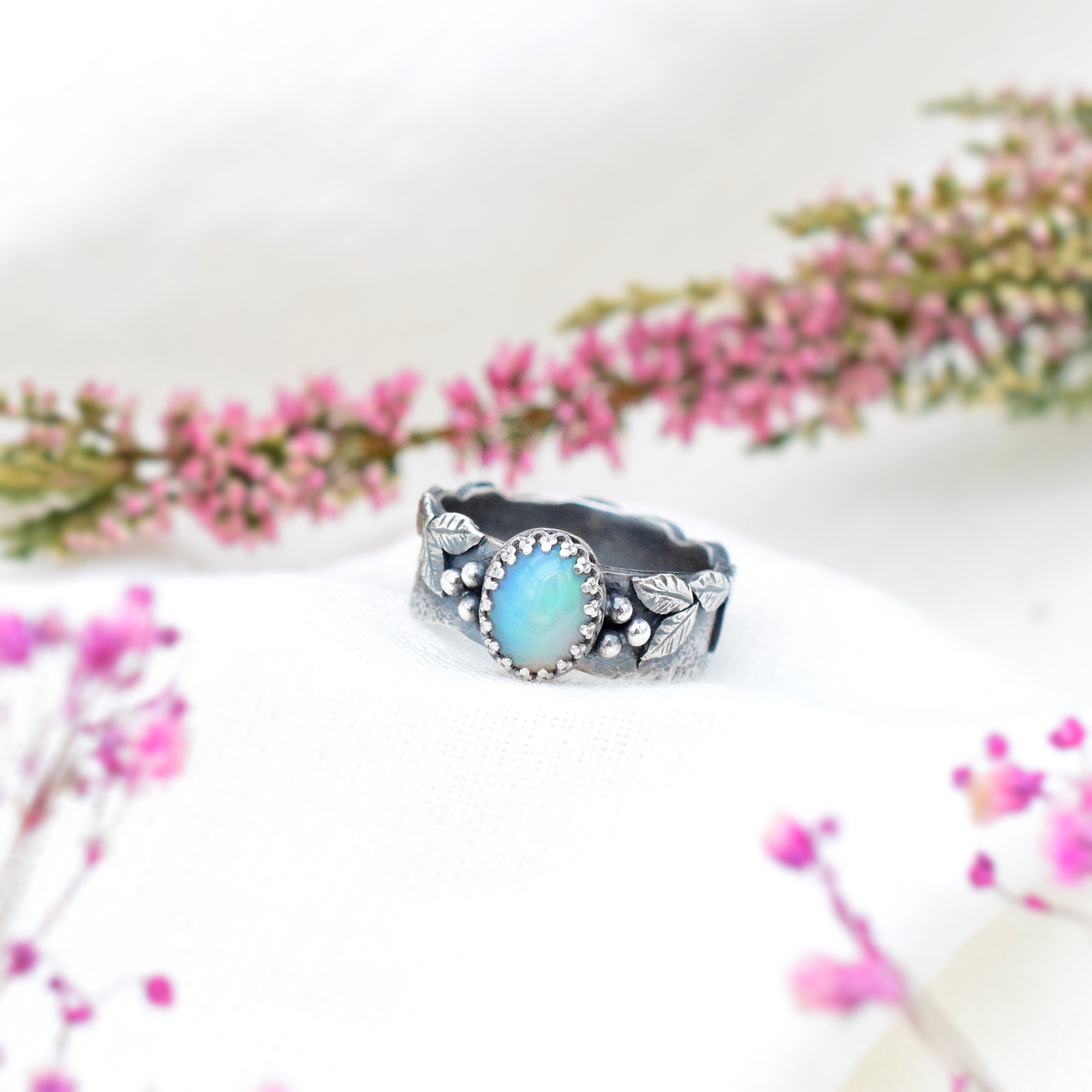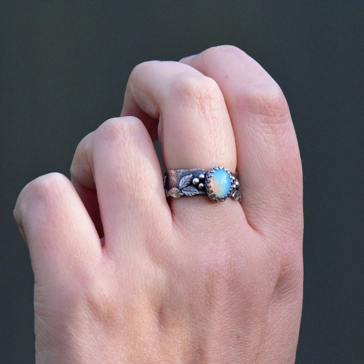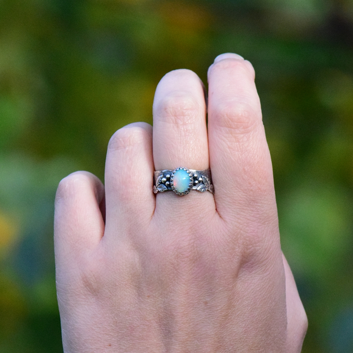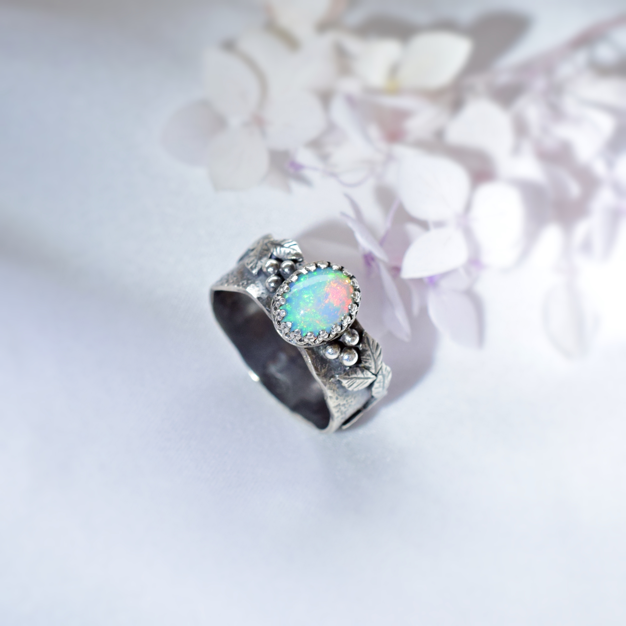 Szeroka obrączka z przyciemnionego srebra, o subtelnie falującym, nieregularnym brzegu, tworzy intrygujący kontrast dla eterycznego piękna opalu, podkreślając jego niezwykły blask.