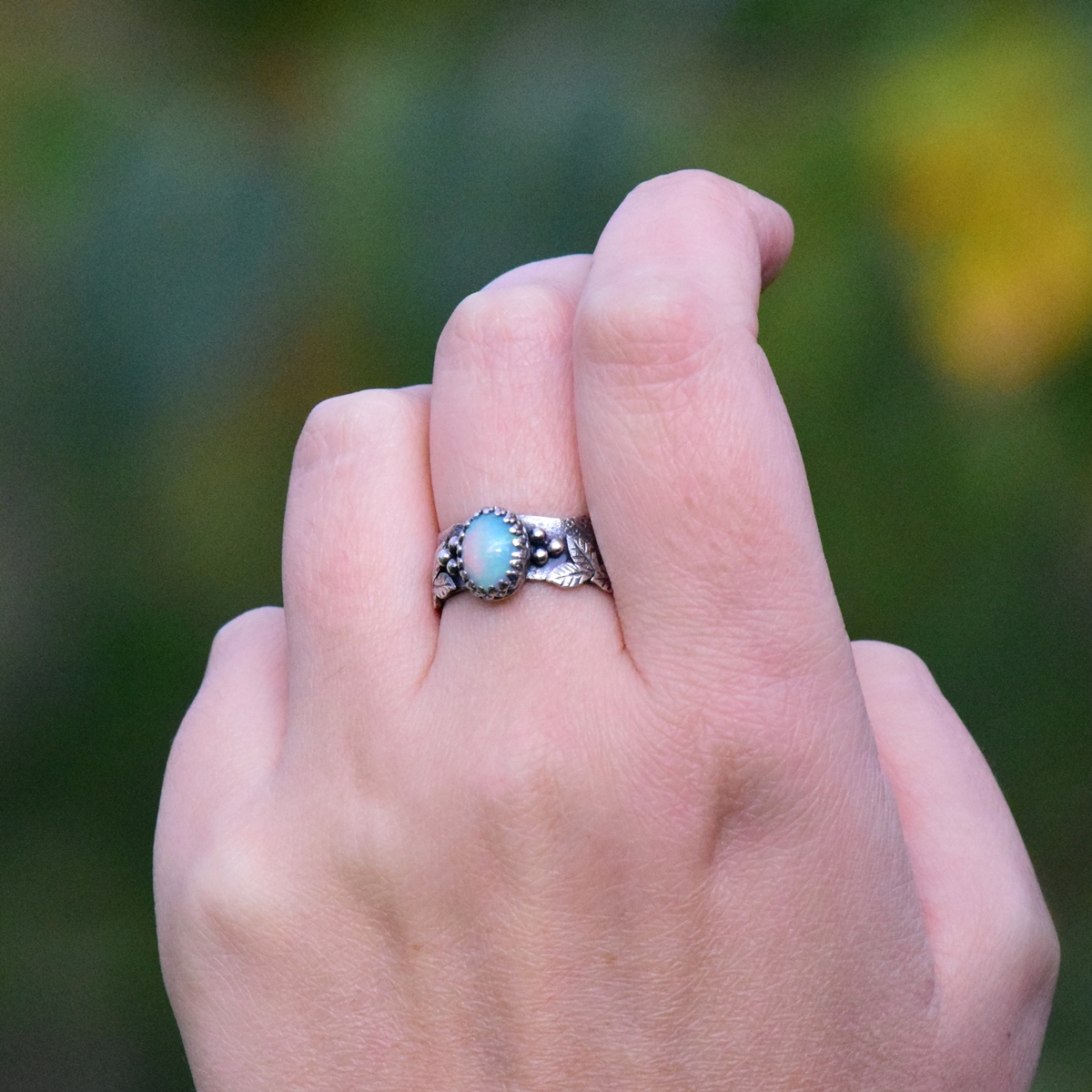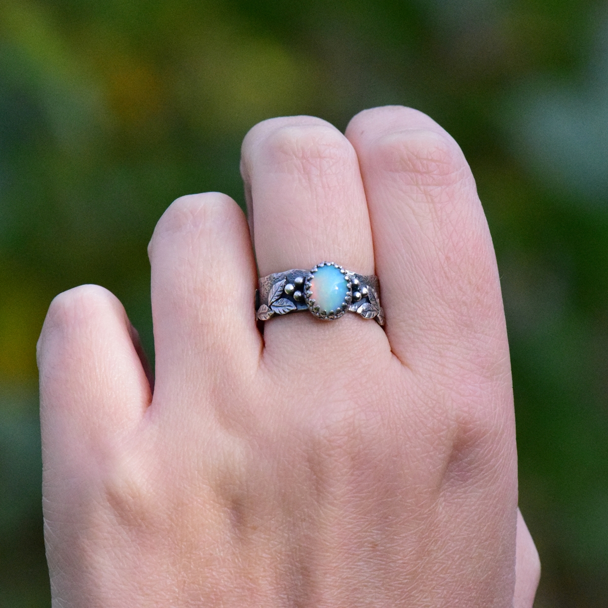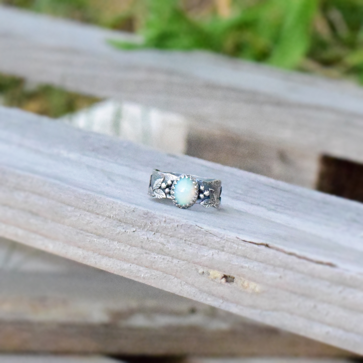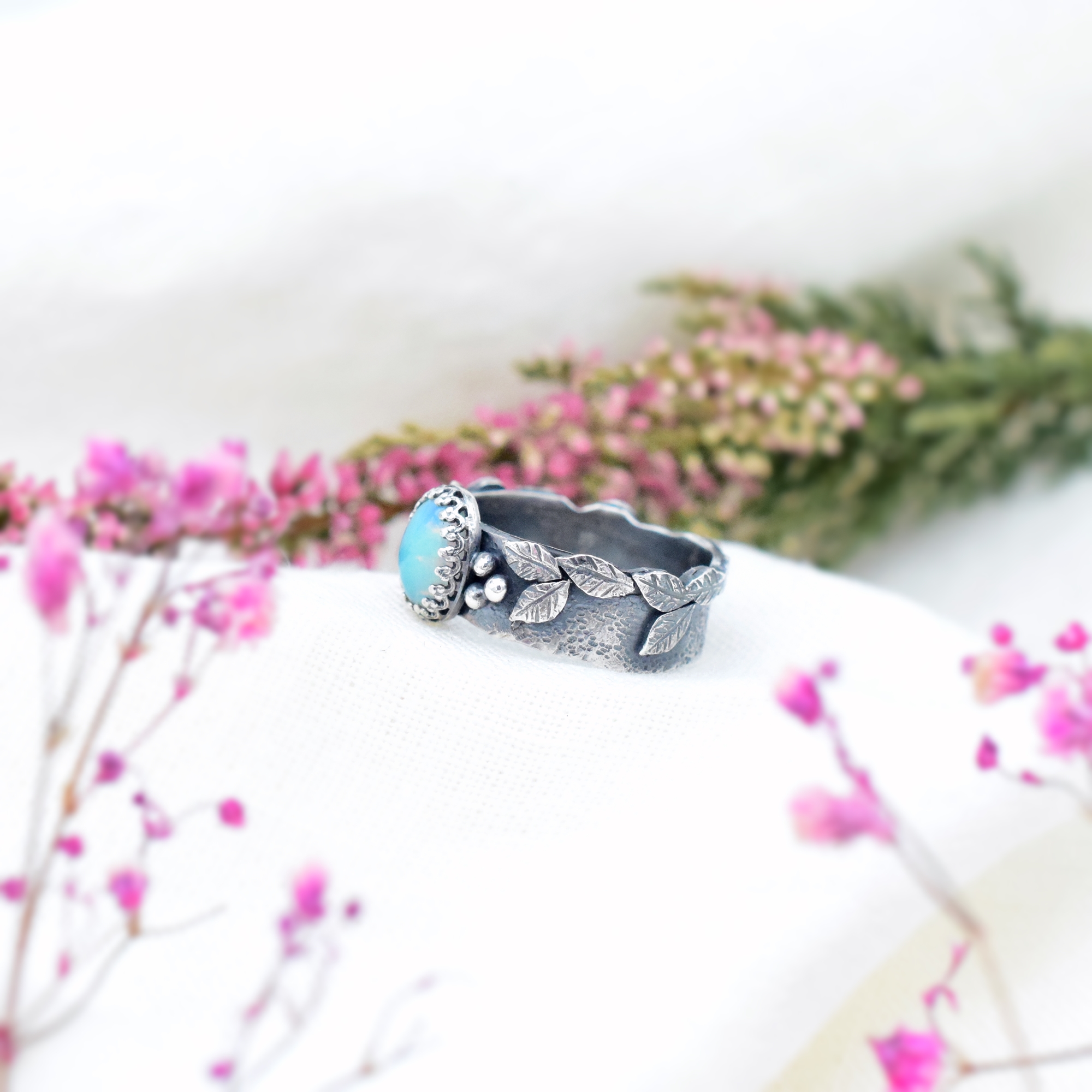 Szeroka obrączka z przyciemnionego srebra, o subtelnie falującym, nieregularnym brzegu, tworzy intrygujący kontrast dla eterycznego piękna opalu, podkreślając jego niezwykły blask.