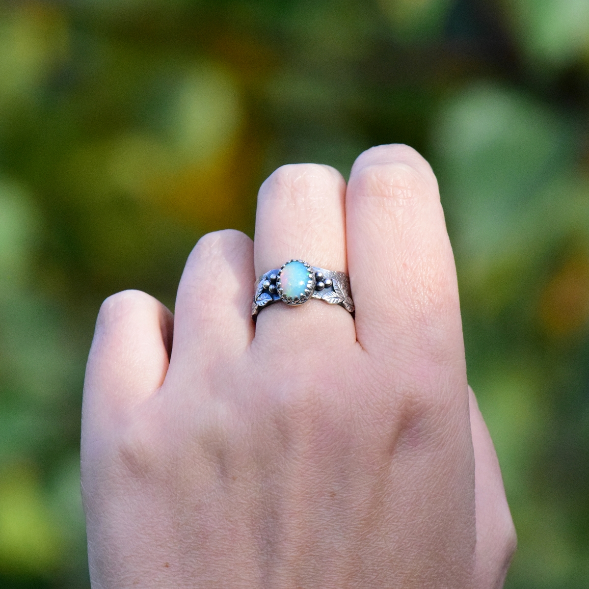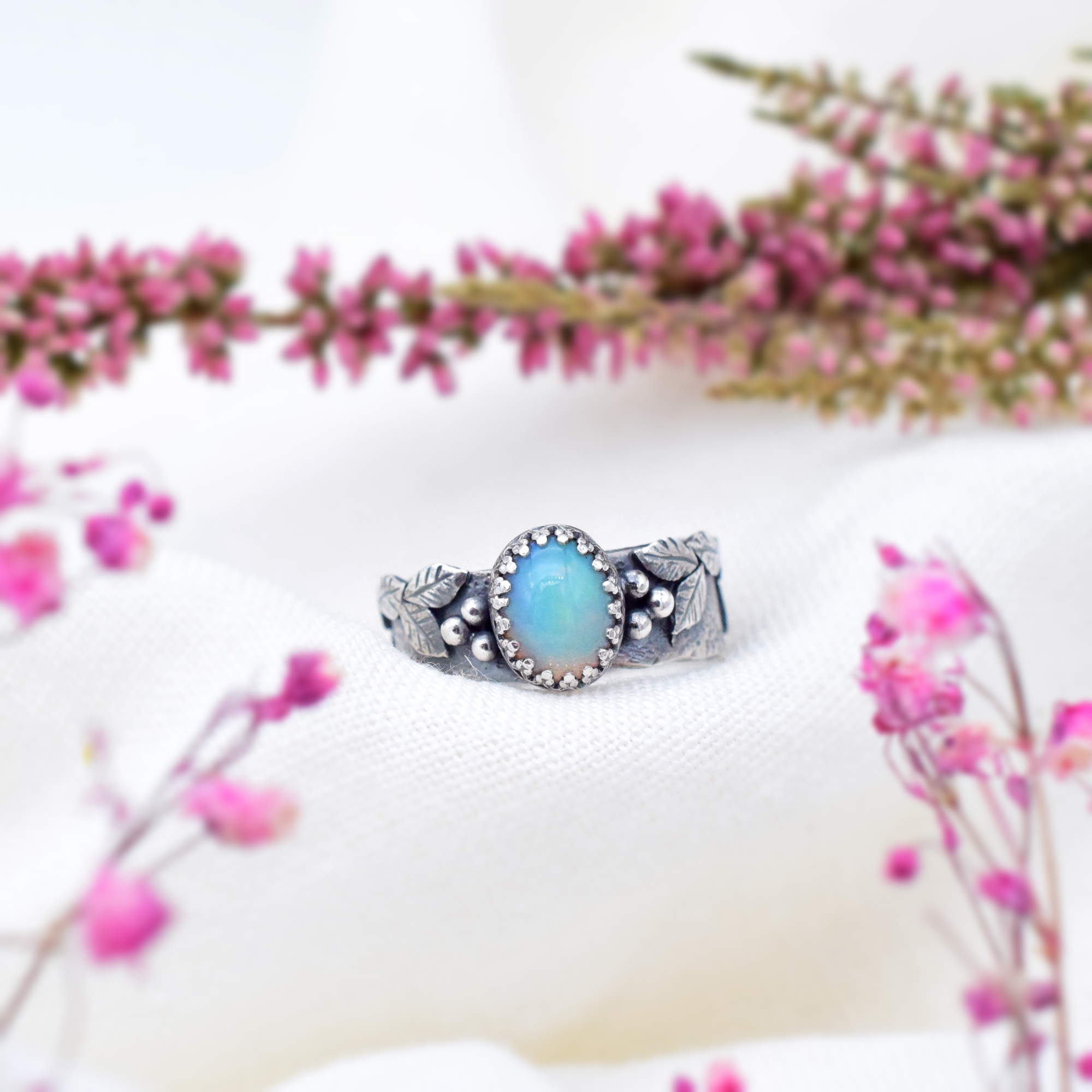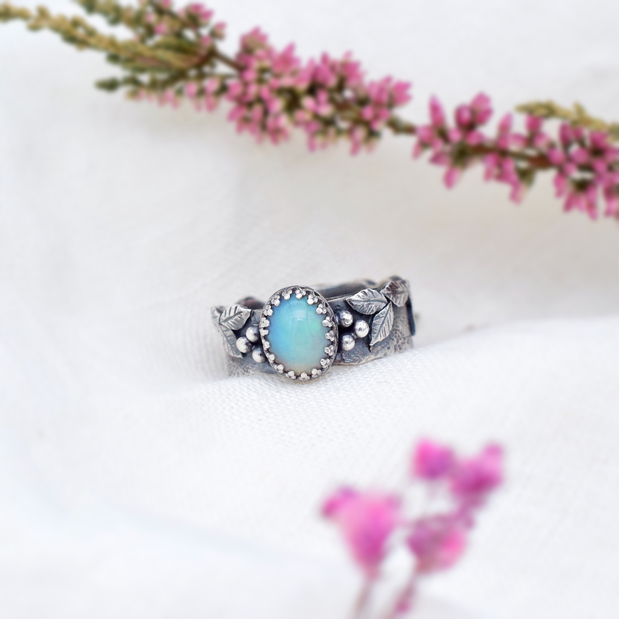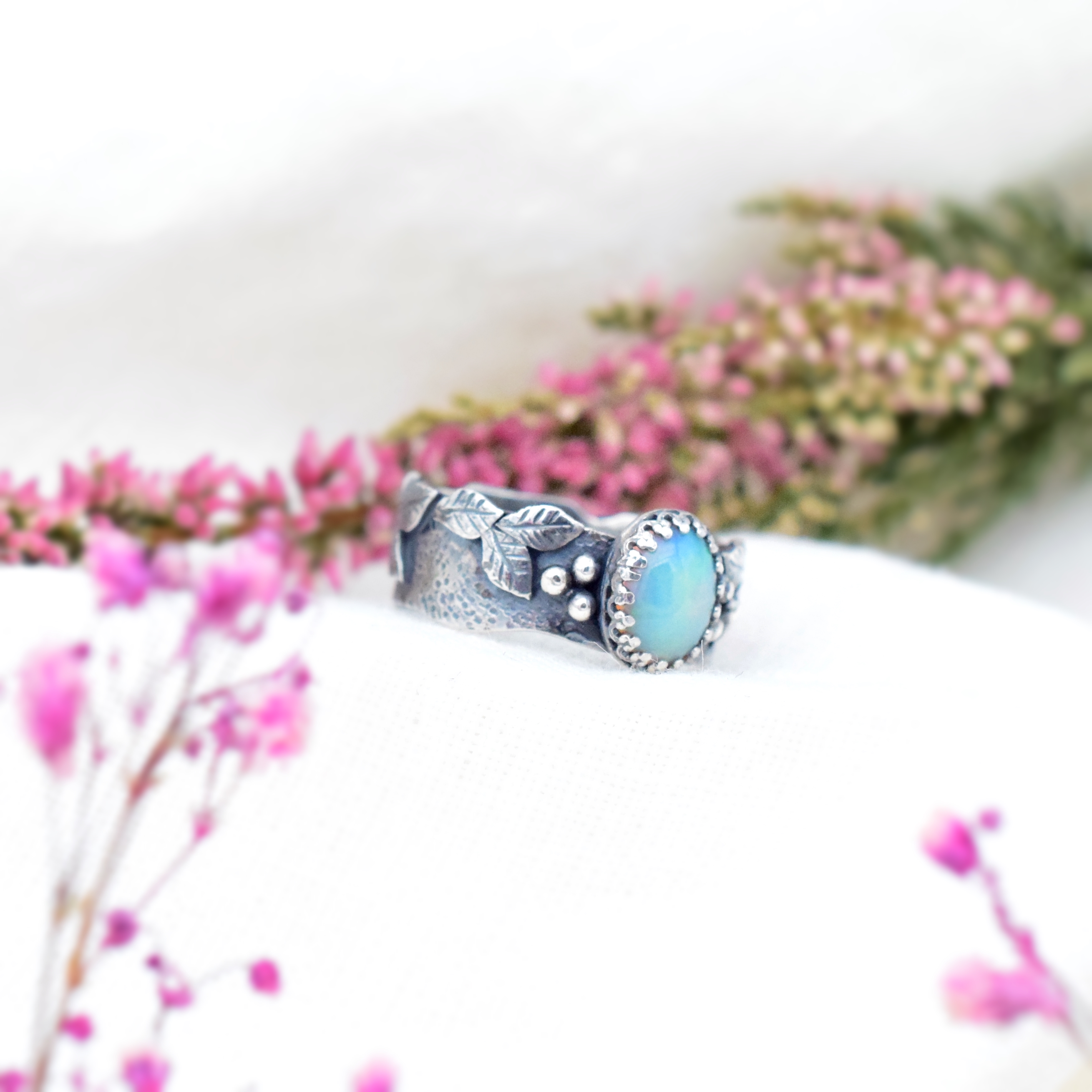 Wyjątkowy, artystyczny pierścionek z naturalnym opalem etiopskim o trójwymiarowej głębi, mieniącym się feerią migotliwych barw, które ożywają w blasku światła.