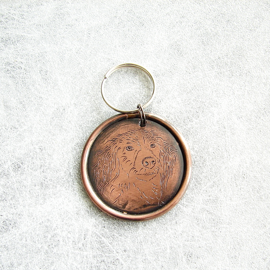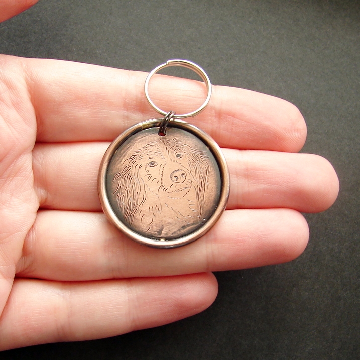 Dwustronnie grawerowany ręcznie identyfikator (adresówka) dla psa (tekst oraz rysunek wizerunku psa), wykonana z grubej blaszki miedzianej, odpornej na zagięcia. Na ostatniej fotografii widoczny jest przykładowy tekst umieszczony na rewersie adresówki, który może być dowolnie modyfikowany według życzenia klienta.