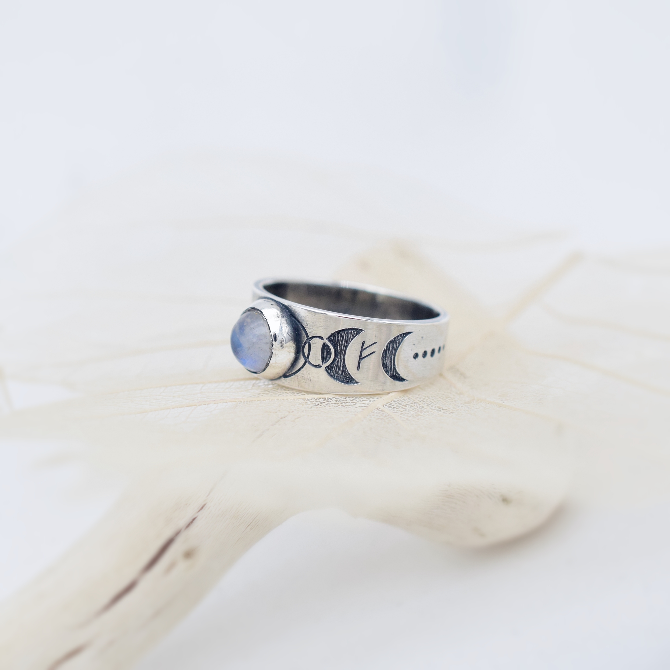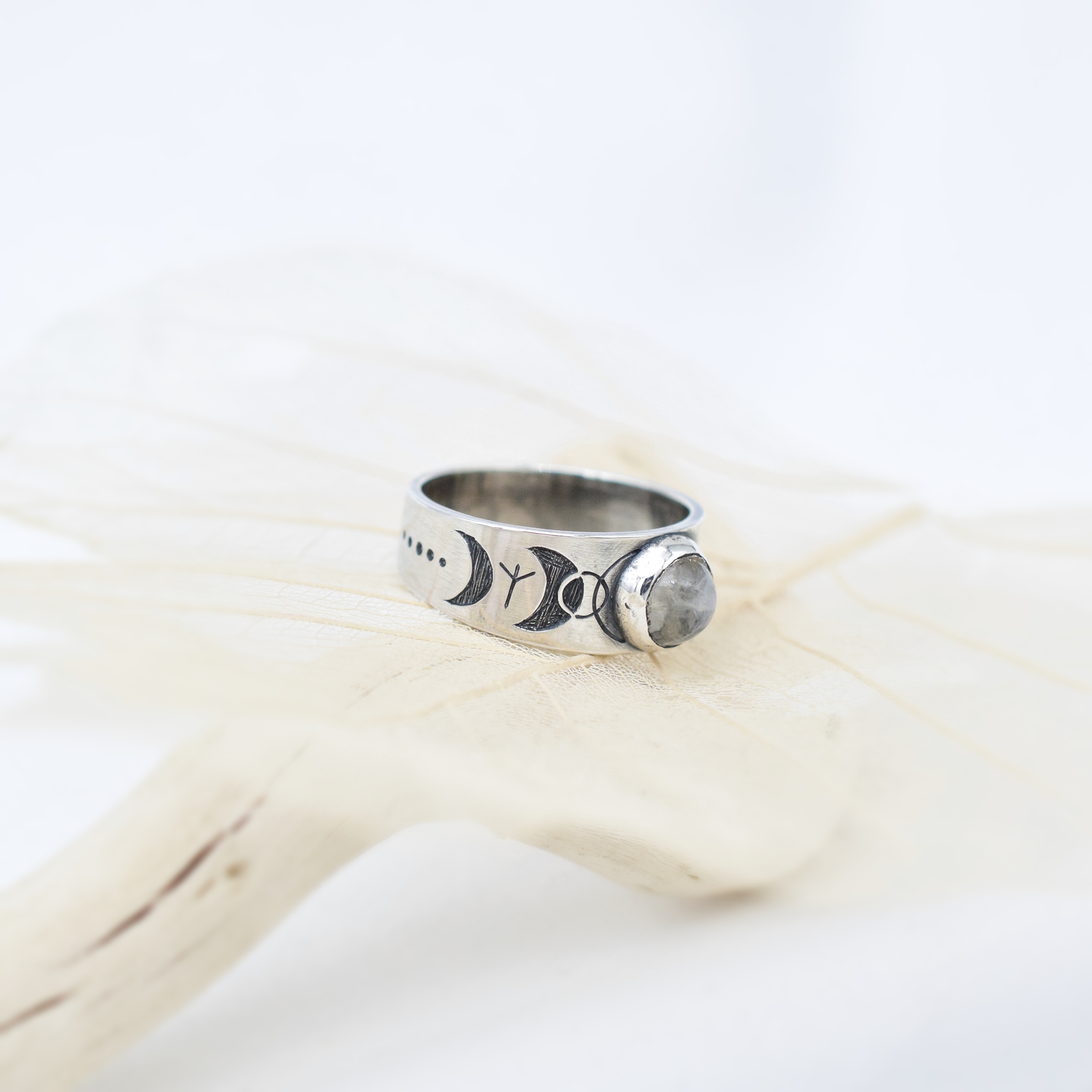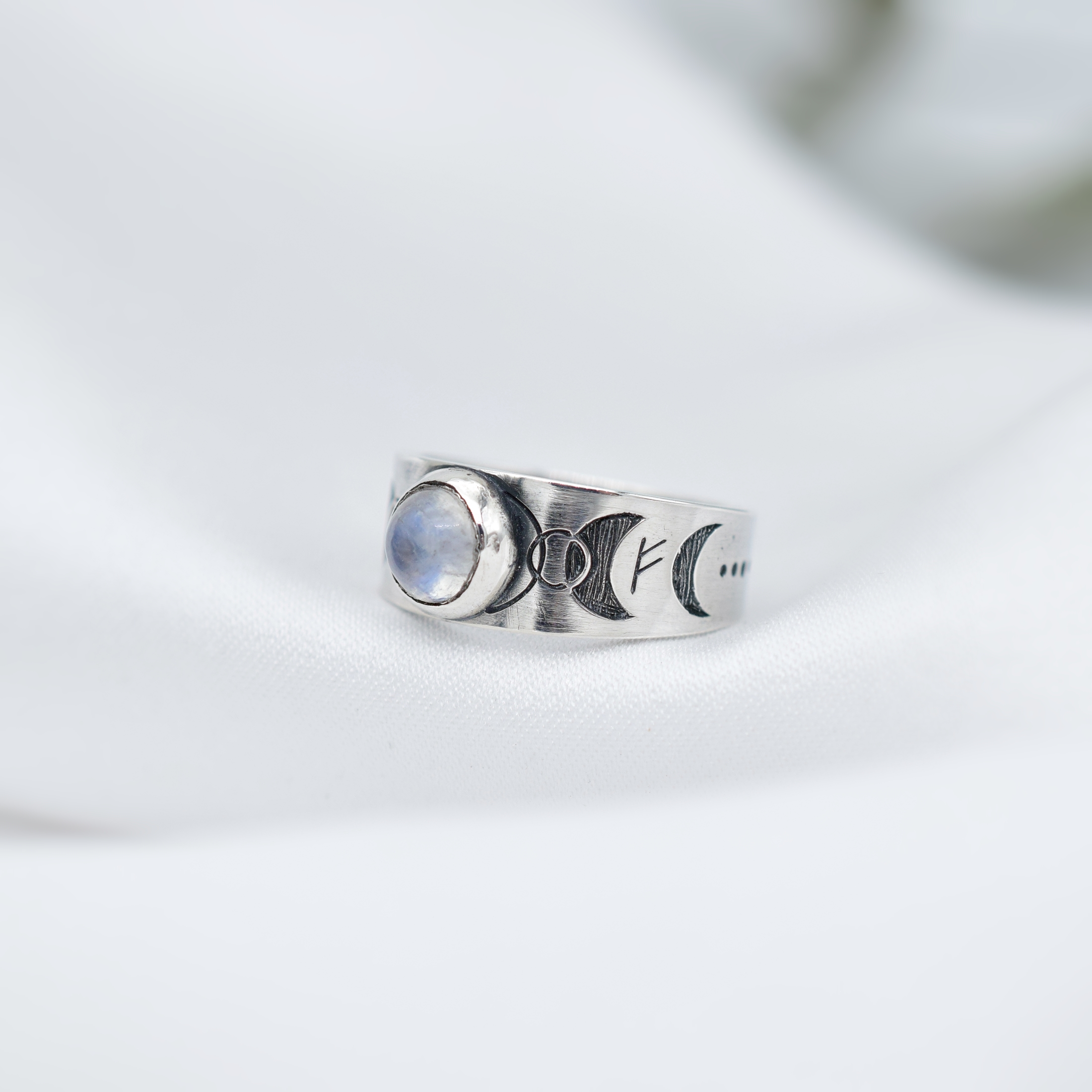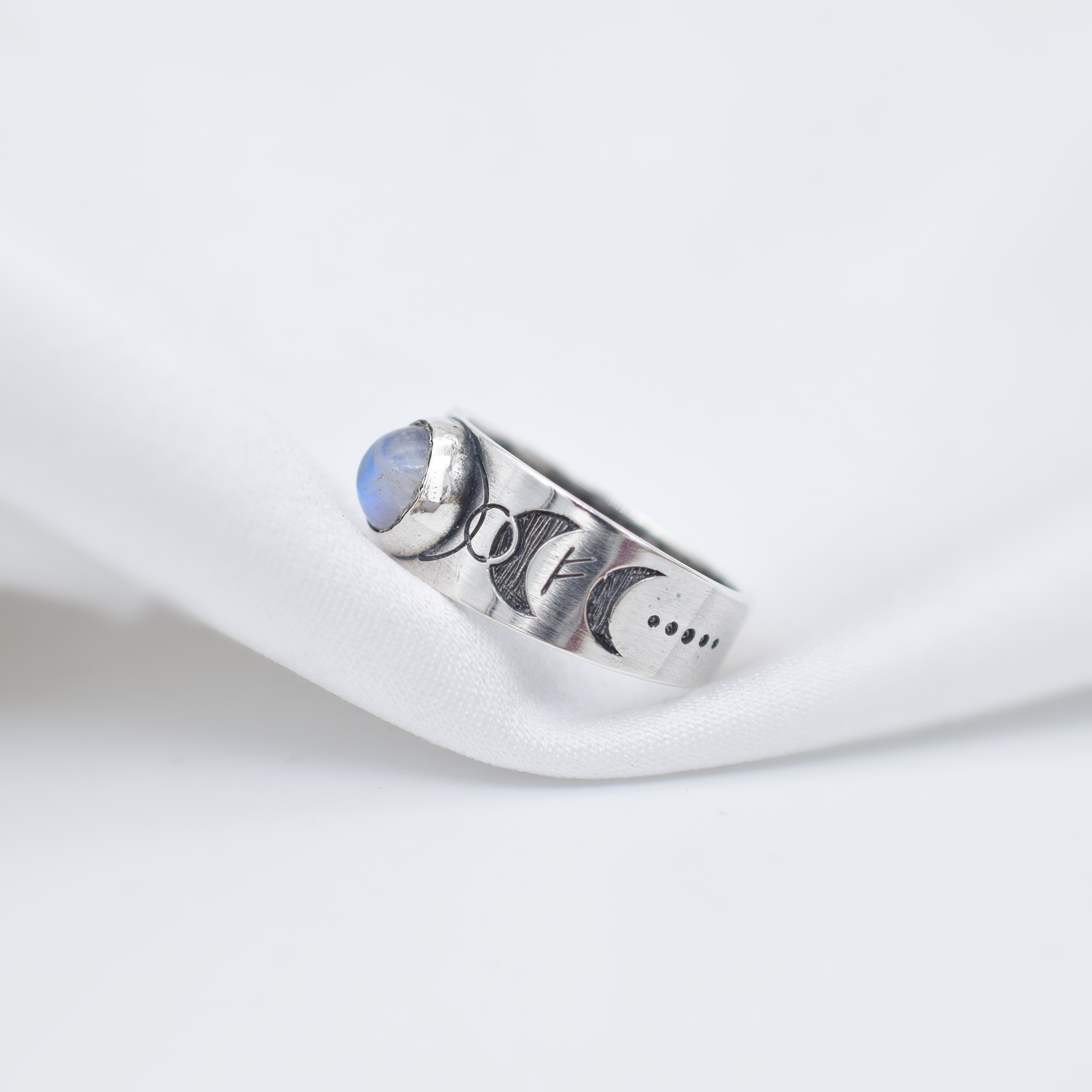 Wyjątkowy pierścionek z ręcznie wykonanym grawerem ilustrującym zmieniające się fazy księżyca oraz znaki runiczne. Styl wykonania pierścionka odzwierciedla tajemniczą, magiczną aurę, którą emanuje Srebrny Glob. Kompozycję dopełnia osadzony w pierścionku kamień księżycowy mieniący się pięknymi odcieniami błękitu.