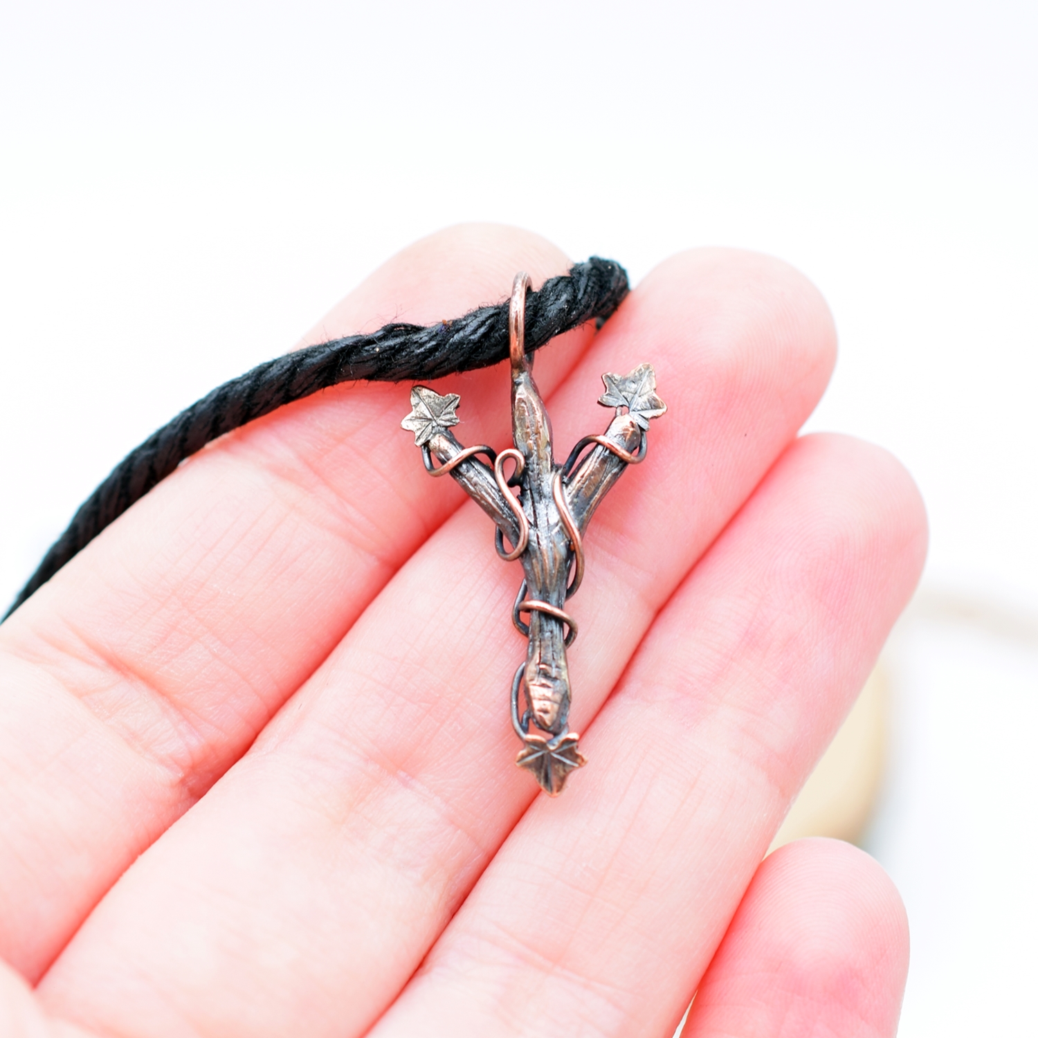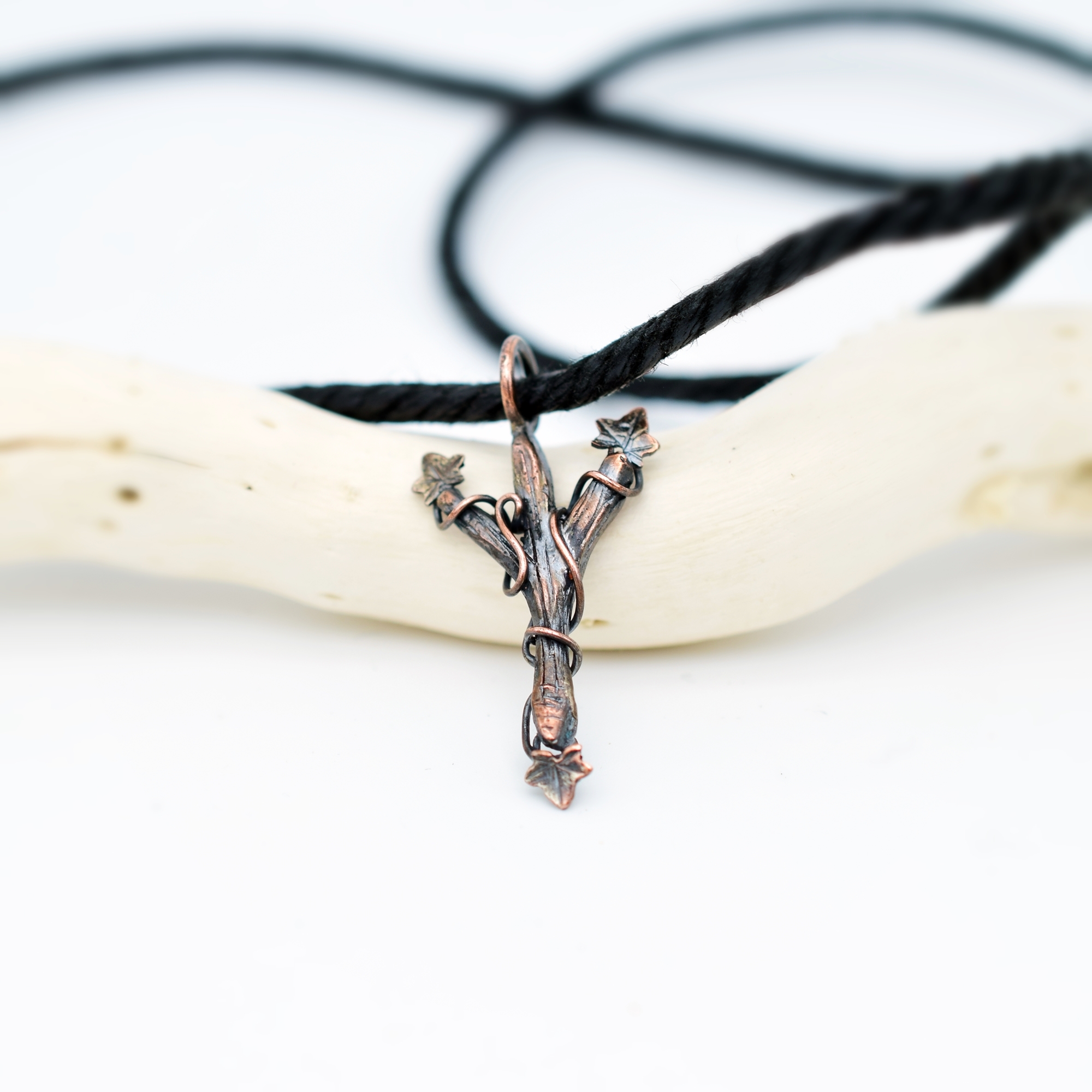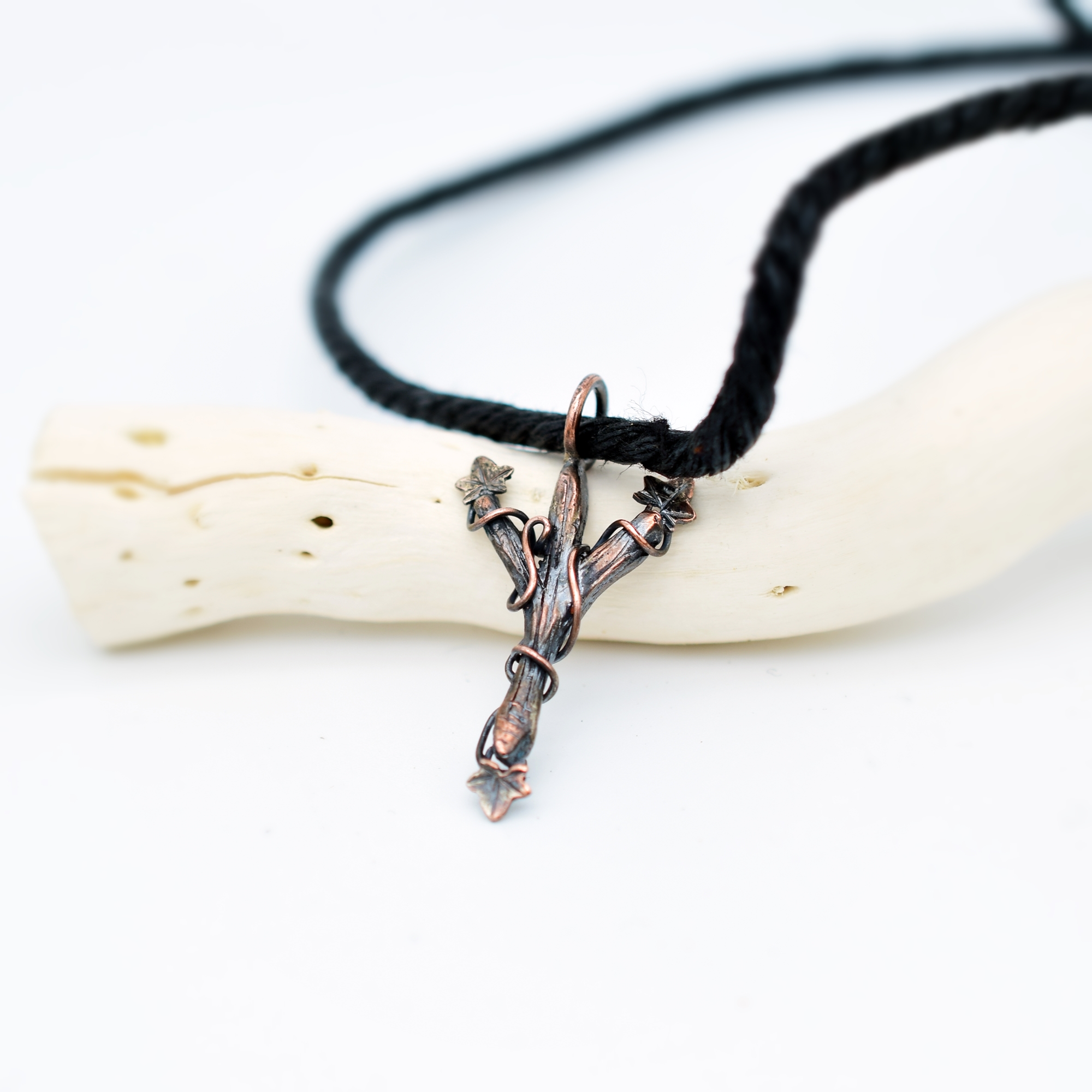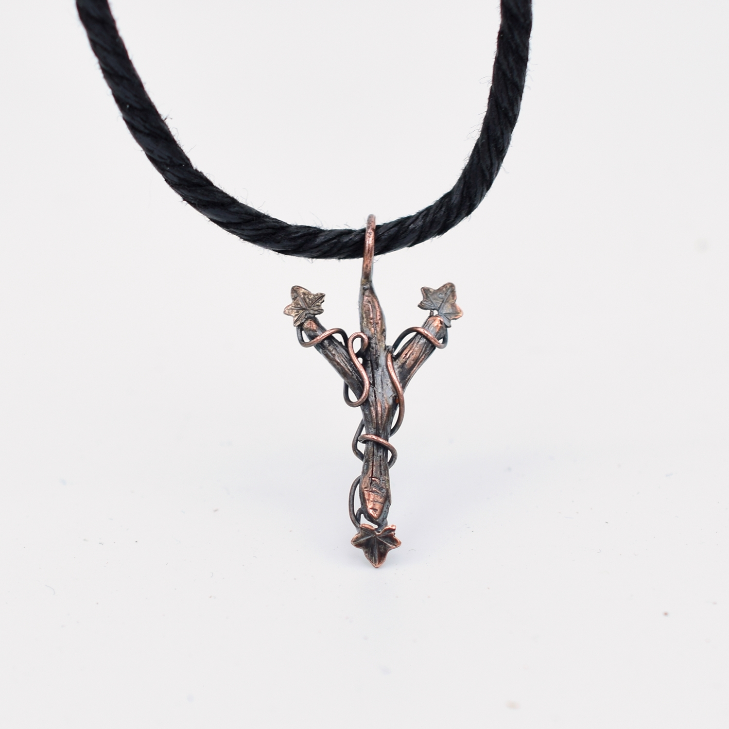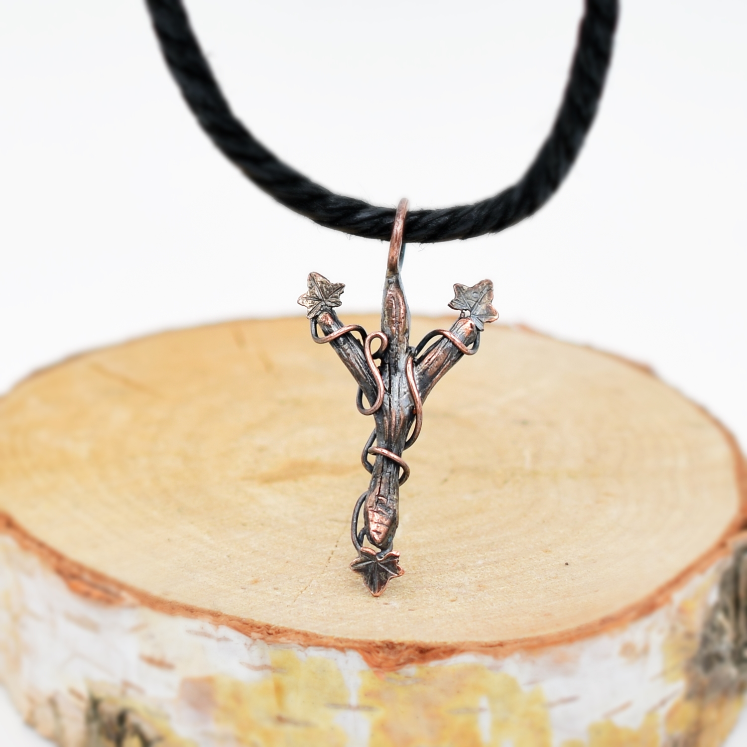 Uformowana z miedzi zawieszka nawiązuje swym wyglądem do gałązki drzewa oplecionej bluszczem.