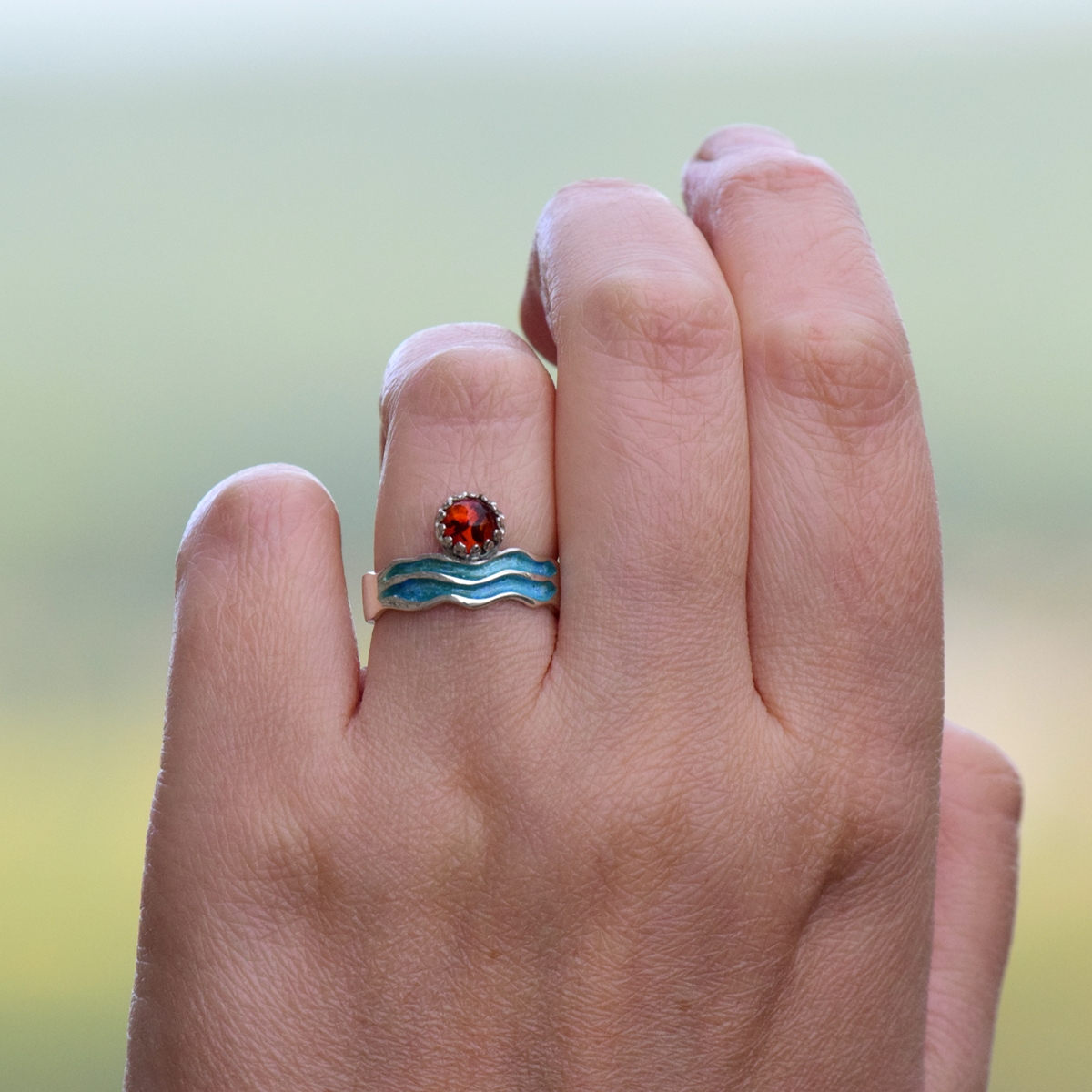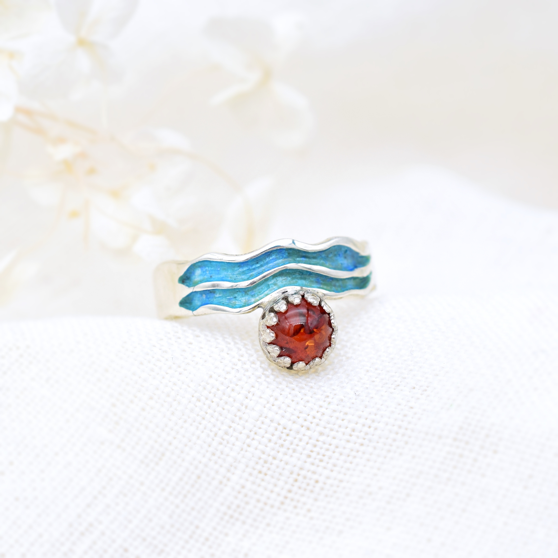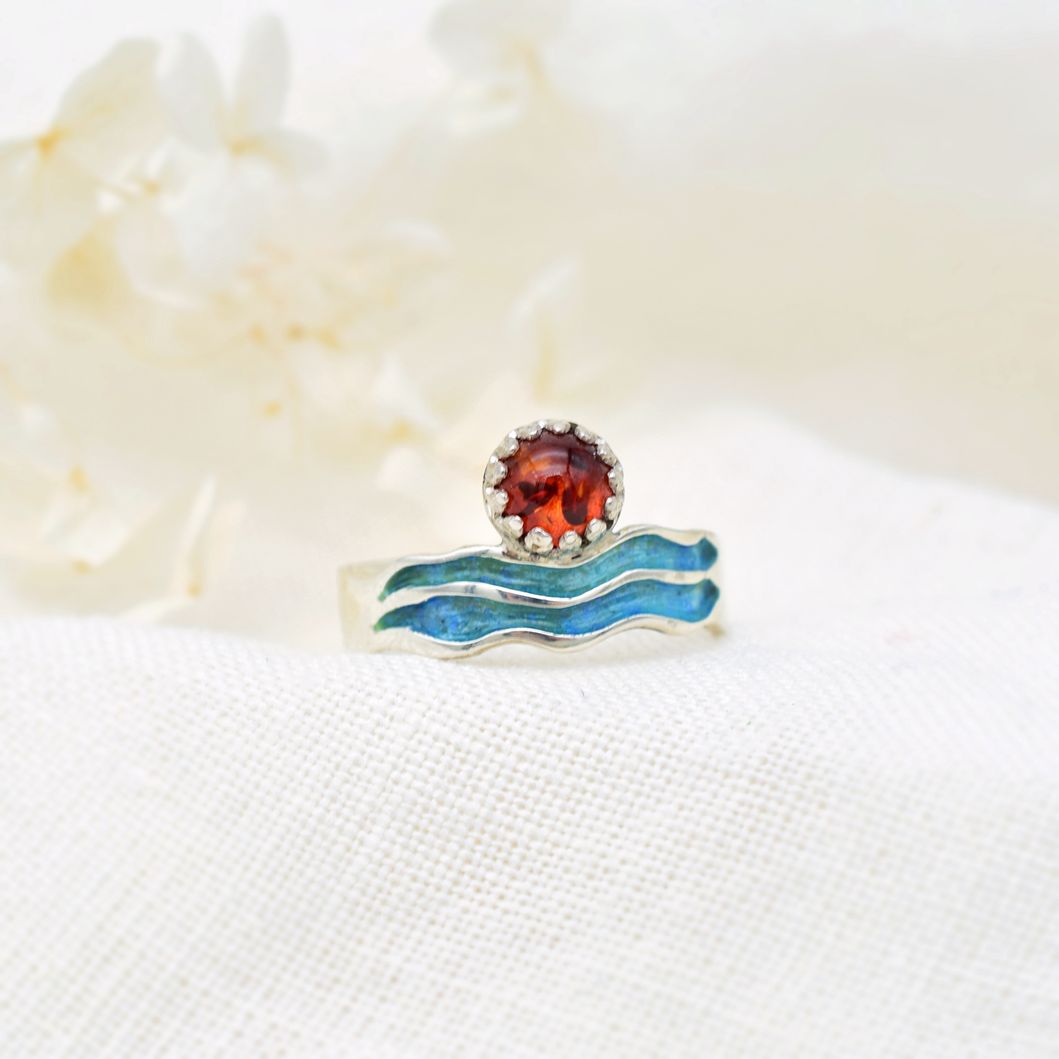 Przednią część obrączki zdobi dekoracja, uzyskana dzięki szlachetnym emaliom. Jej kształt wraz z odcieniami błękitu i zieleni, przywodzi na myśl ruch morskich fal. Kompozycję wieńczy bursztyn o barwie ciemnego miodu. Unoszący się lekko nad falującą linią obrączki, przywołuje obraz ognistego zachodu słońca nad wodami Bałtyku.