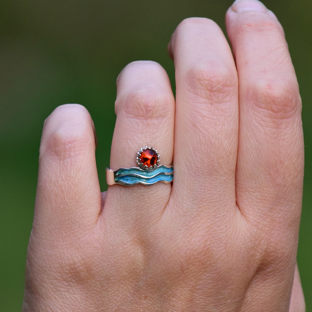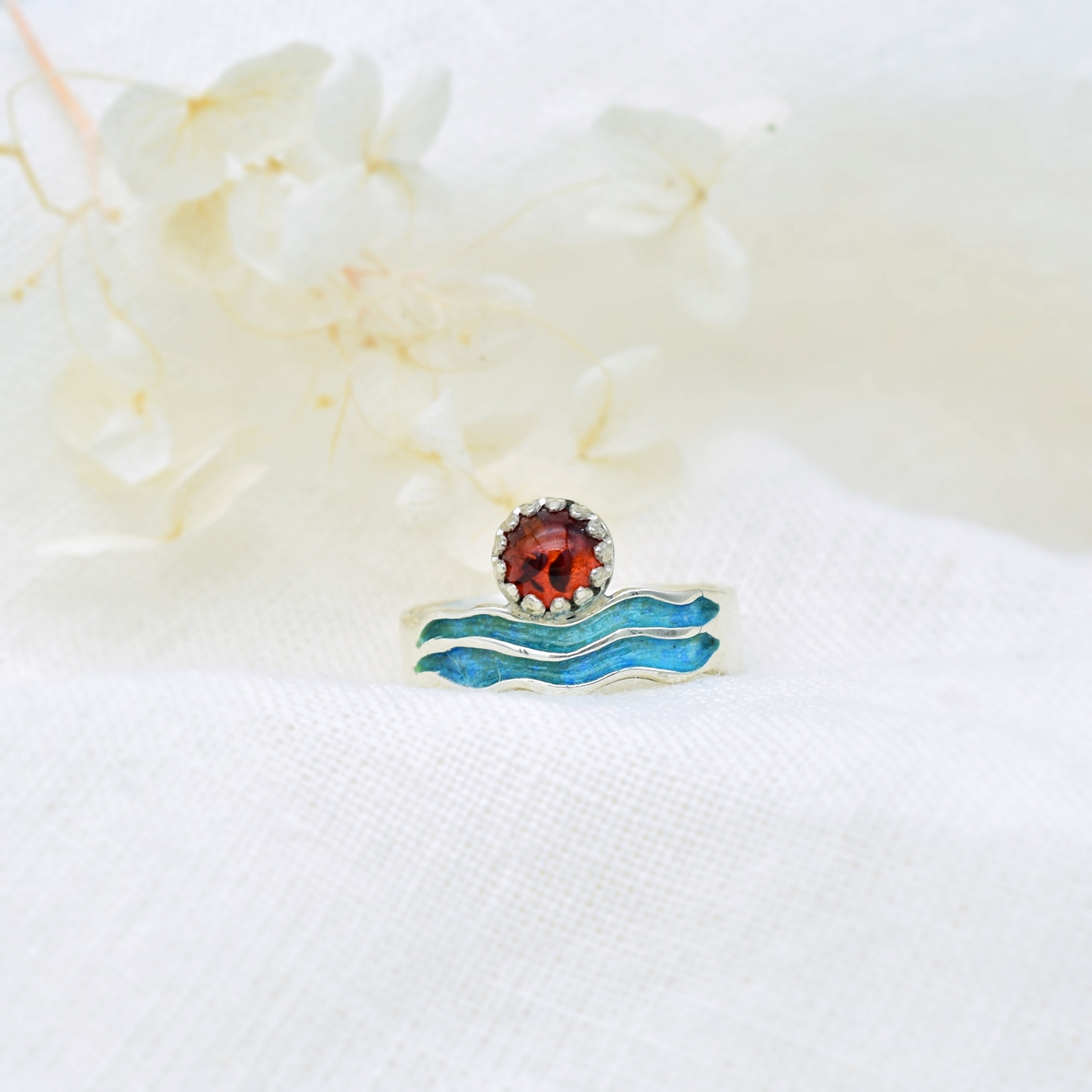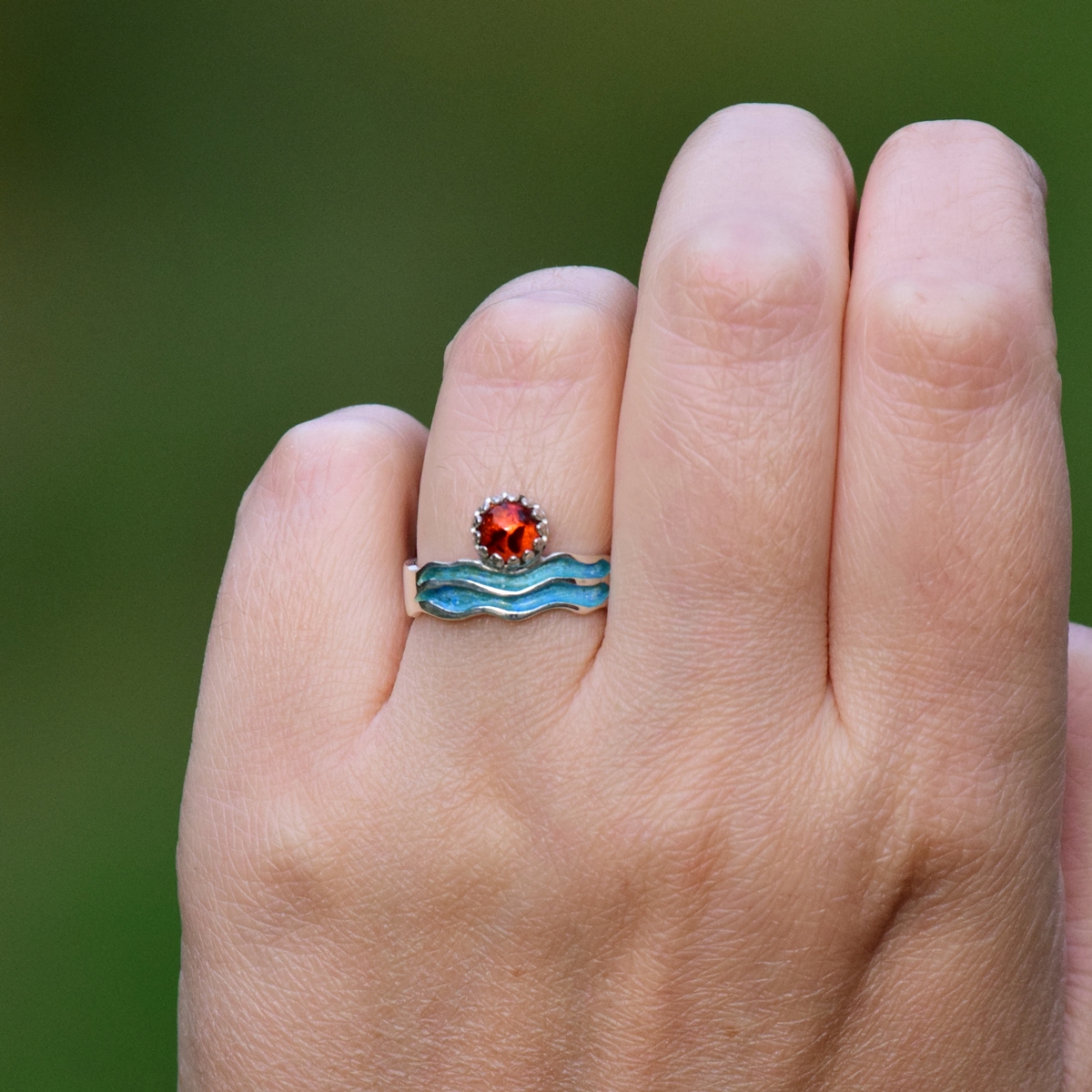 Przednią część obrączki zdobi dekoracja, uzyskana dzięki szlachetnym emaliom. Jej kształt wraz z odcieniami błękitu i zieleni, przywodzi na myśl ruch morskich fal. Kompozycję wieńczy bursztyn o barwie ciemnego miodu. Unoszący się lekko nad falującą linią obrączki, przywołuje obraz ognistego zachodu słońca nad wodami Bałtyku.