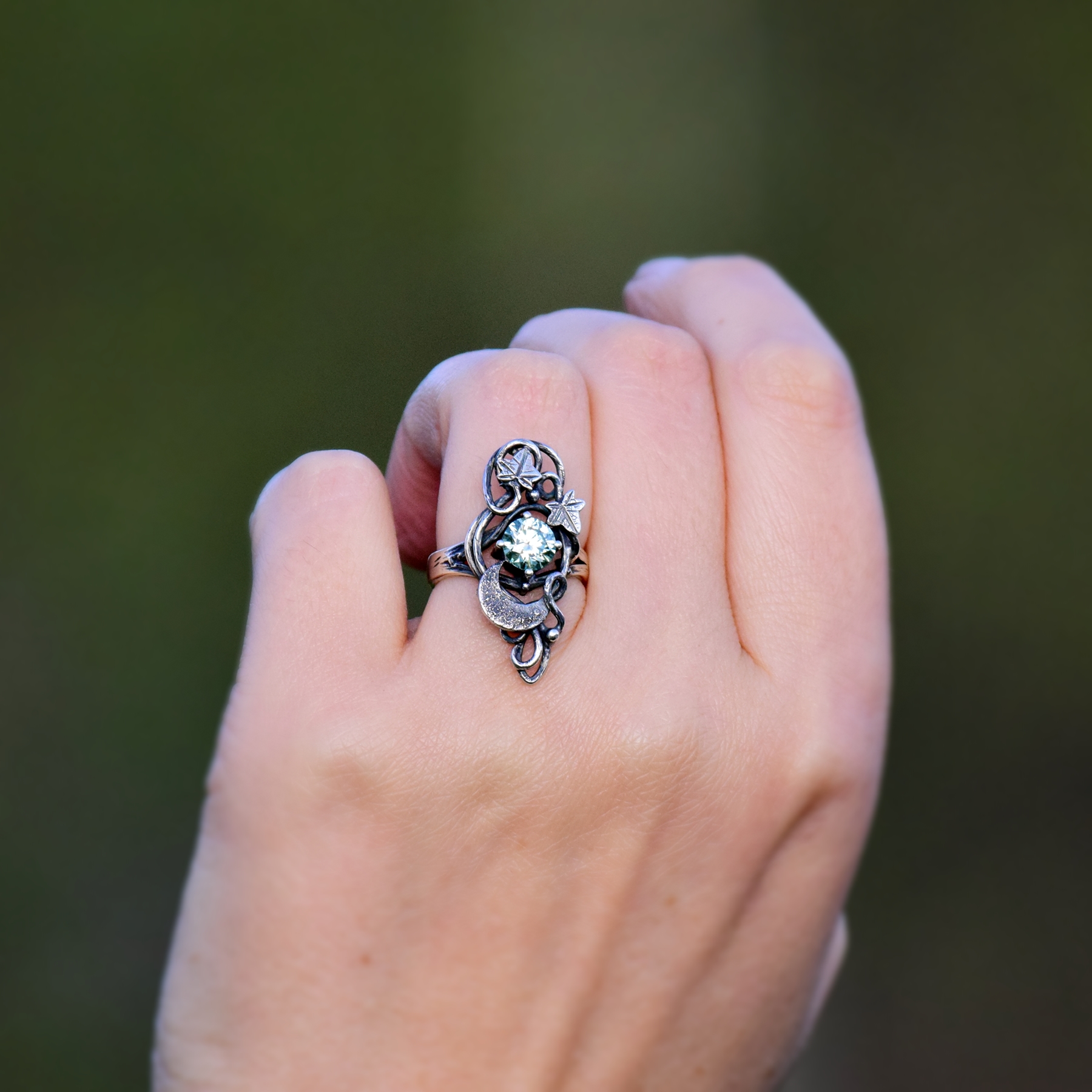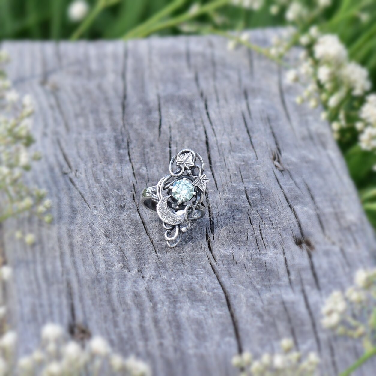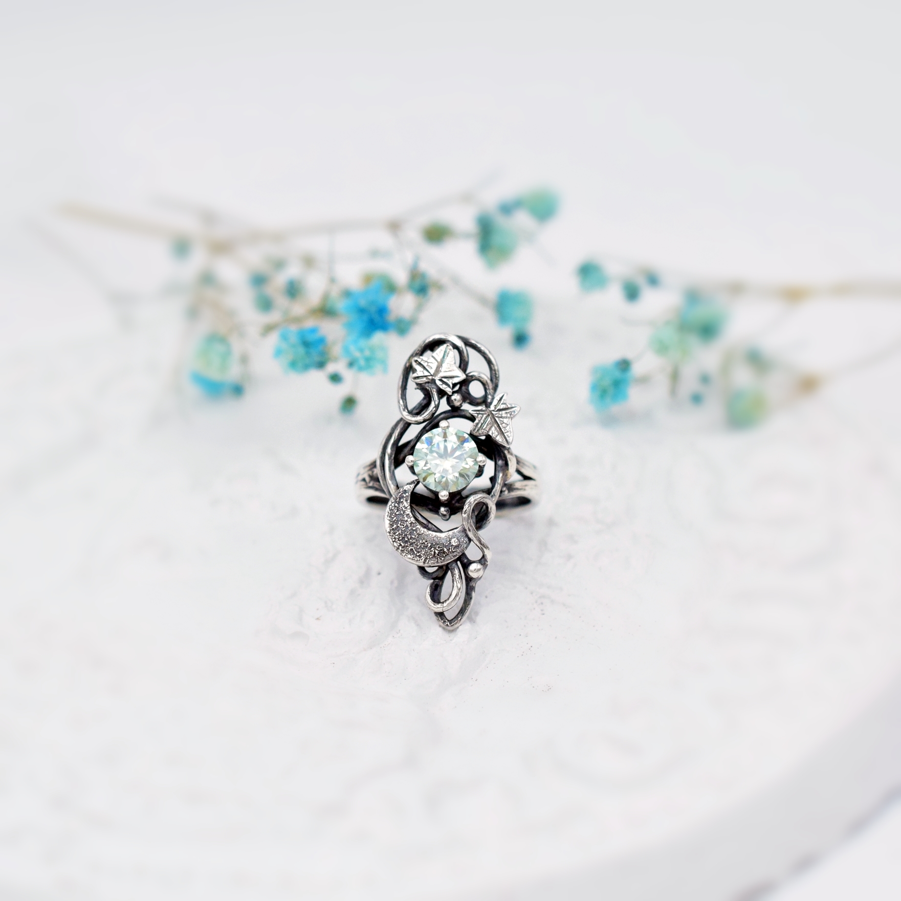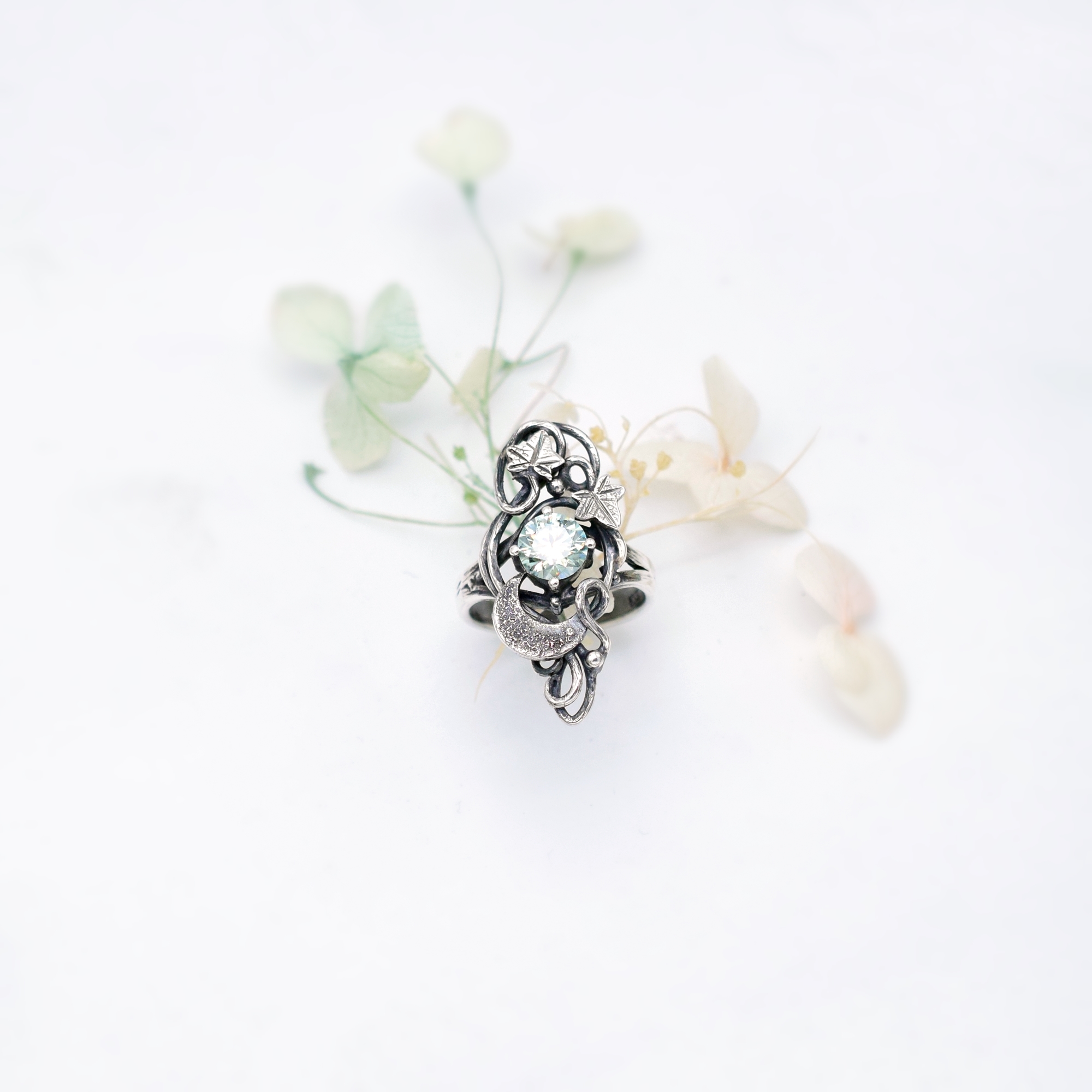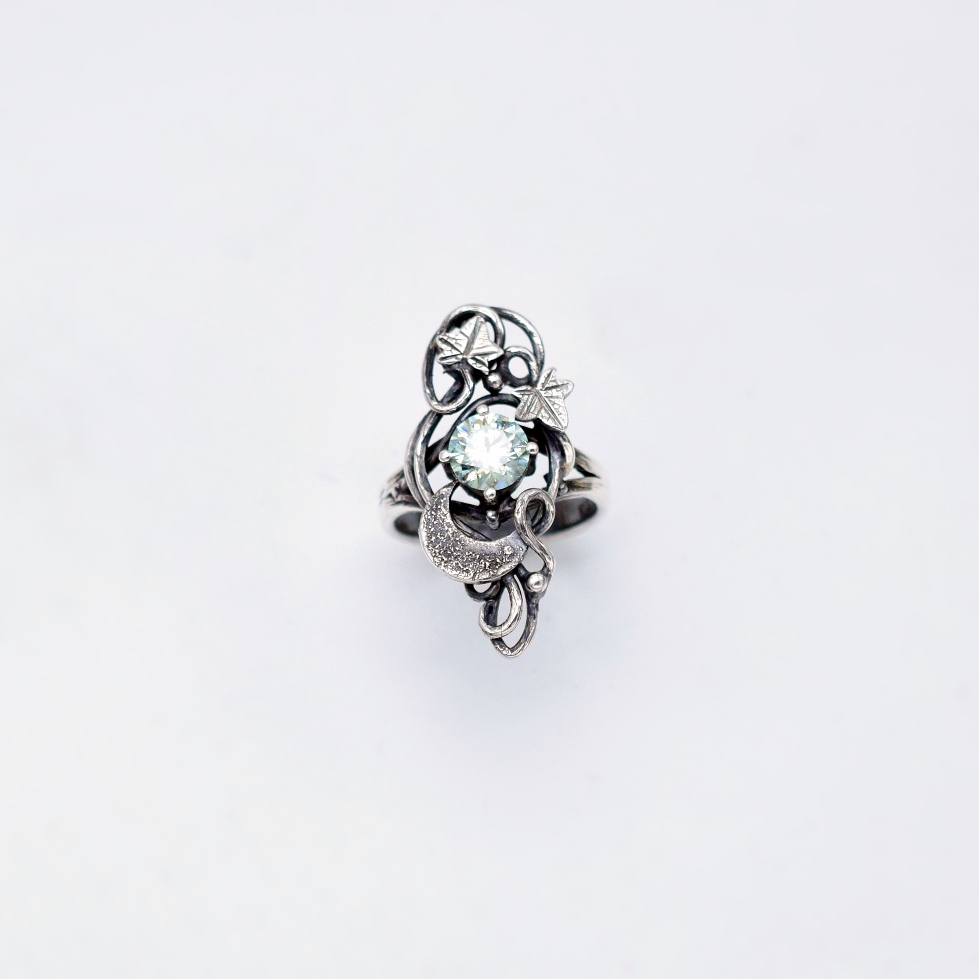 Księżycowy Pierścionek z Bluszczem i Moissanitem