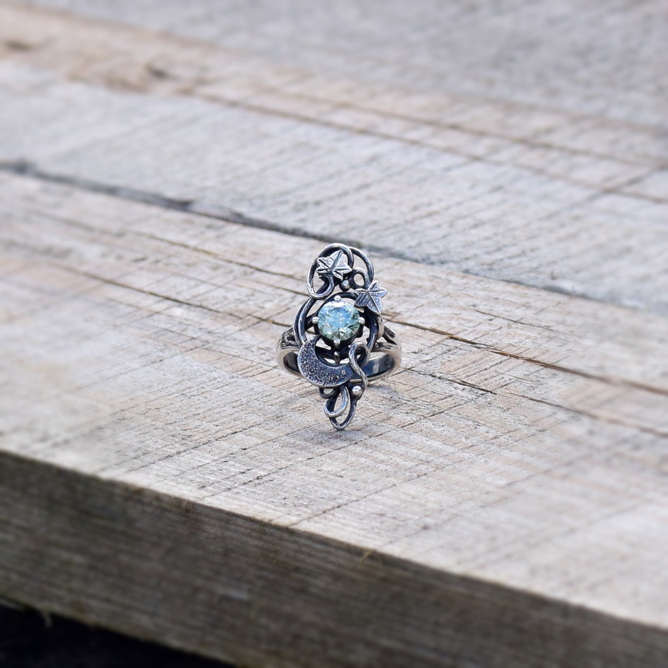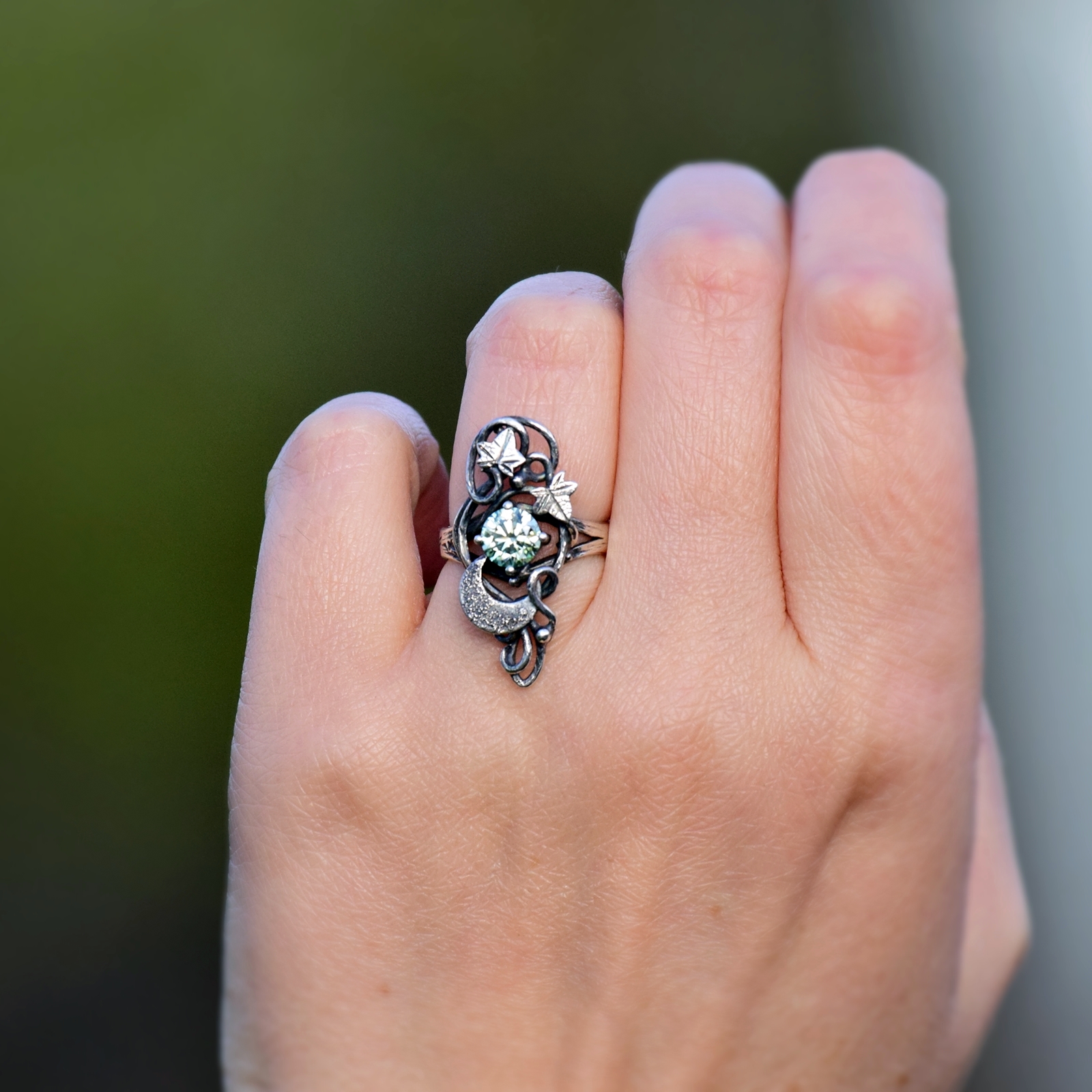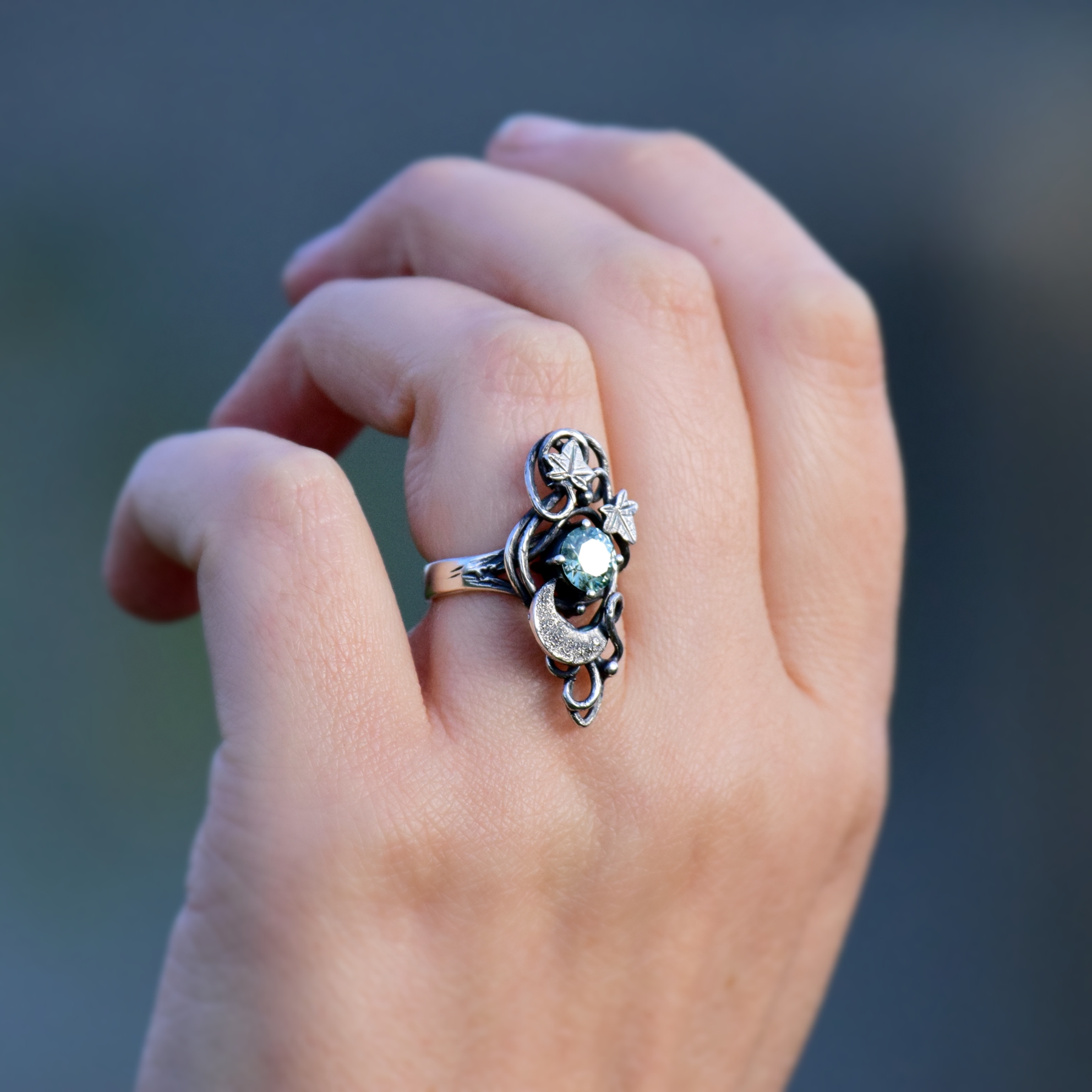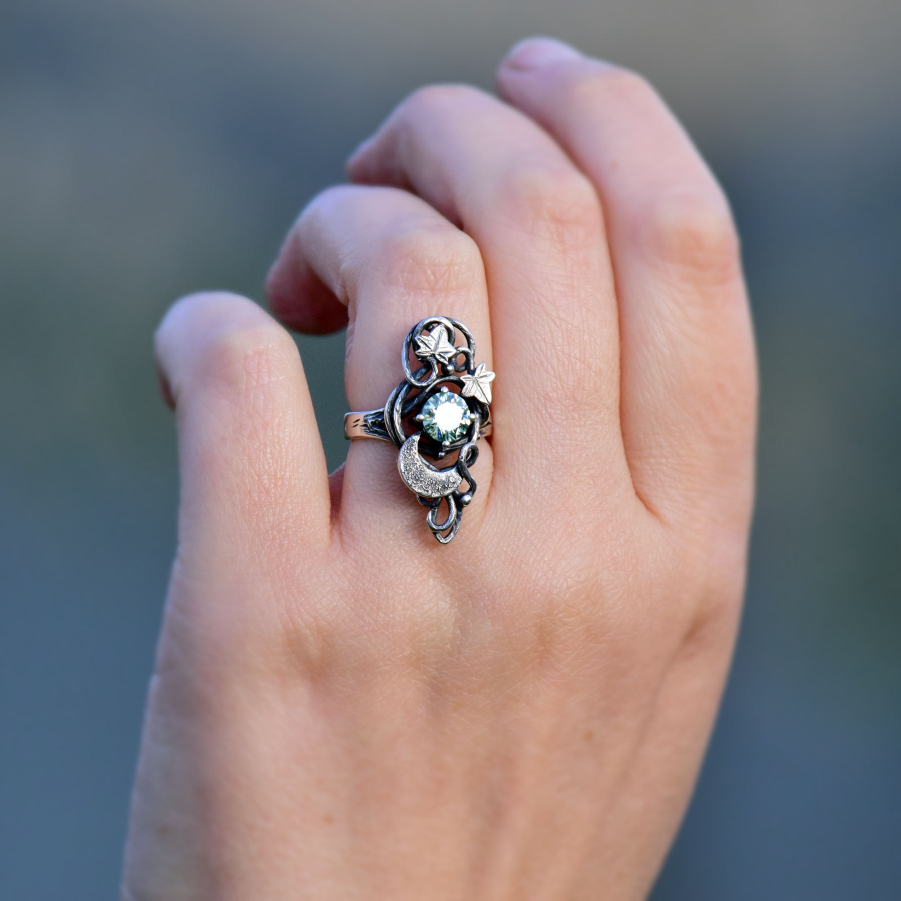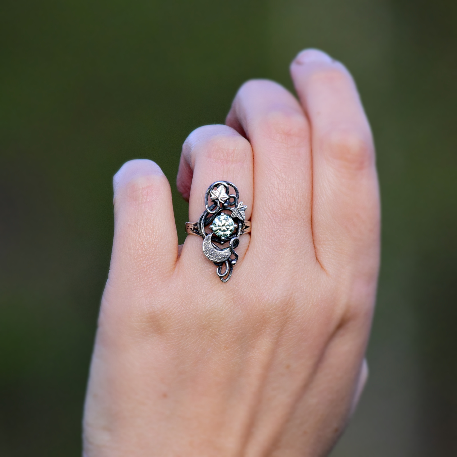 Lśniący moissanit przeplata się w magicznym tańcu z księżycem i bluszczem.