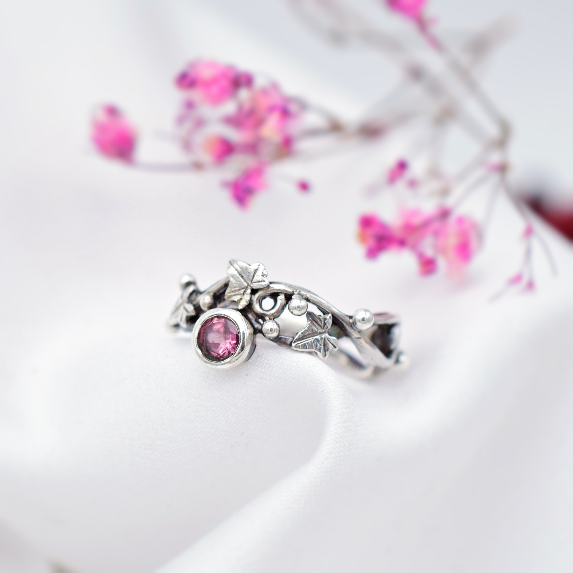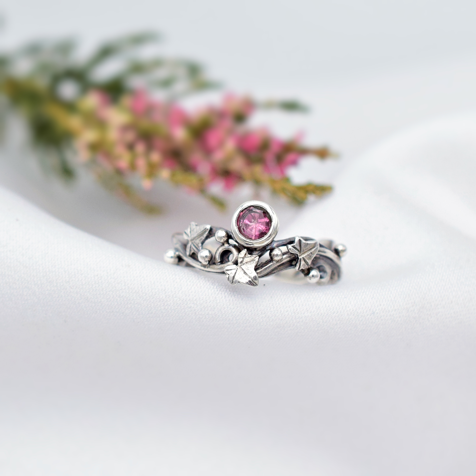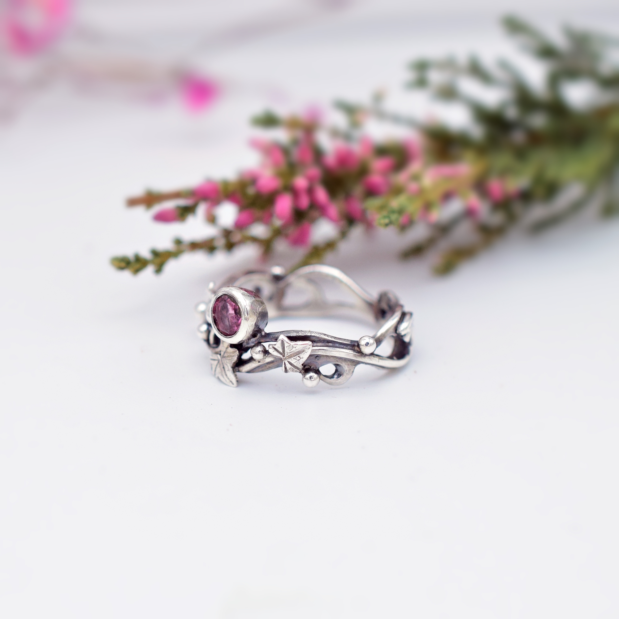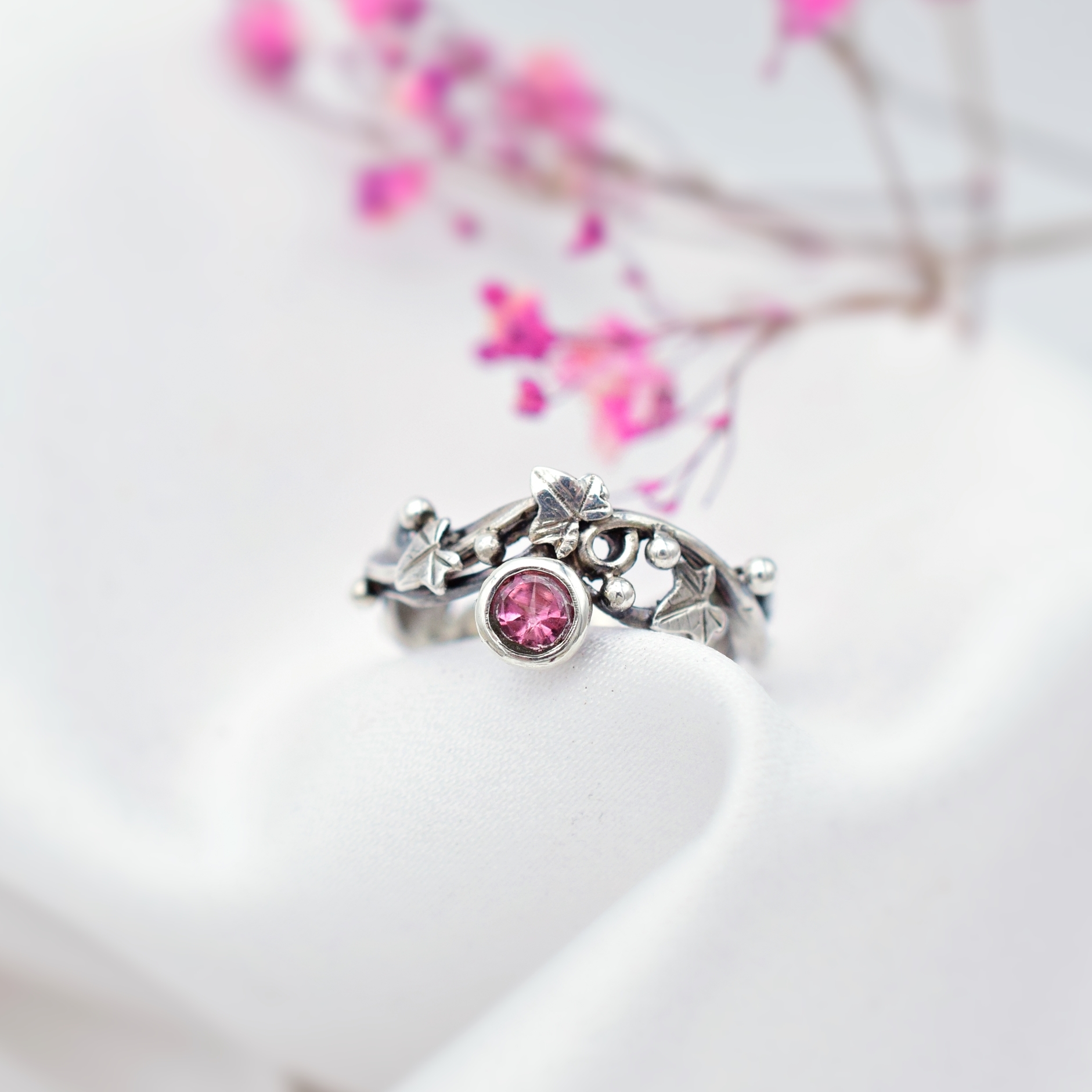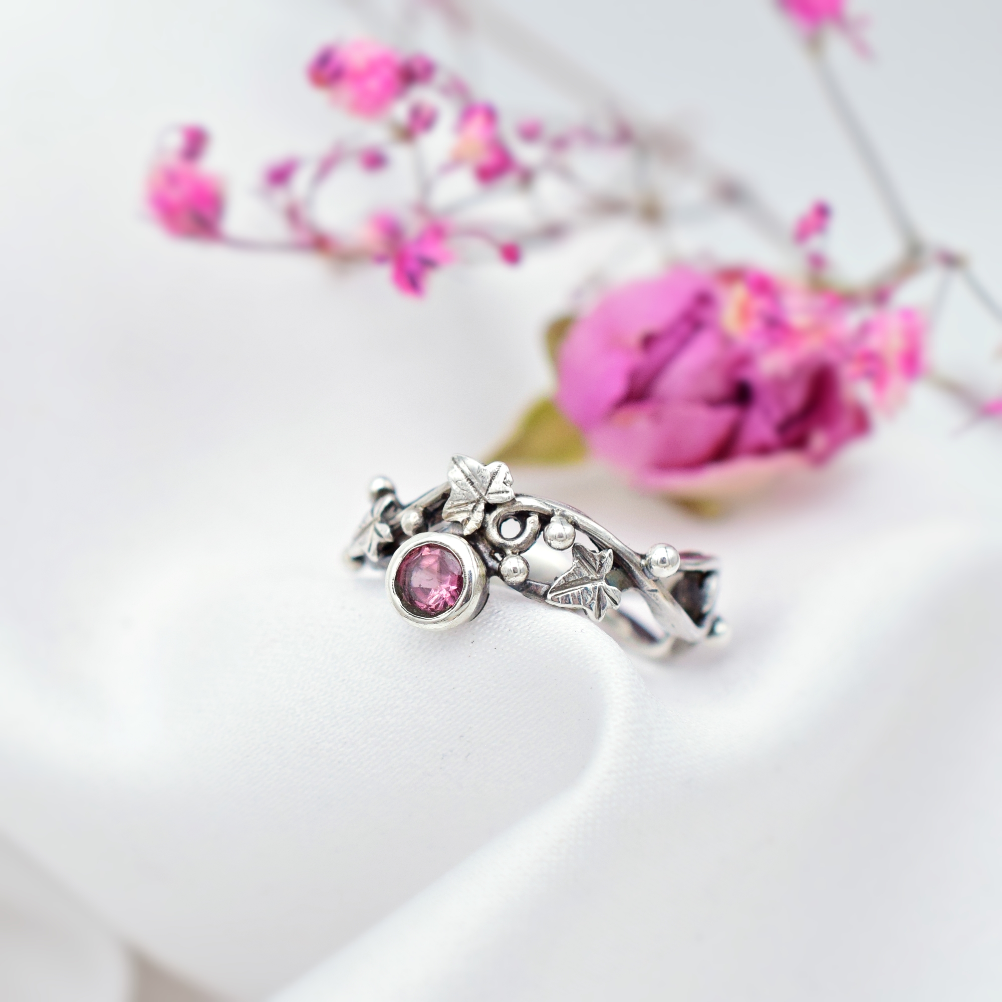 Jego delikatną, ażurową budowę oraz kobiecy wdzięk podkreśla wysmakowany, słodko-różowy turmalin królujący w blasku srebrnej kompozycji z finezyjnym motywem bluszczu.