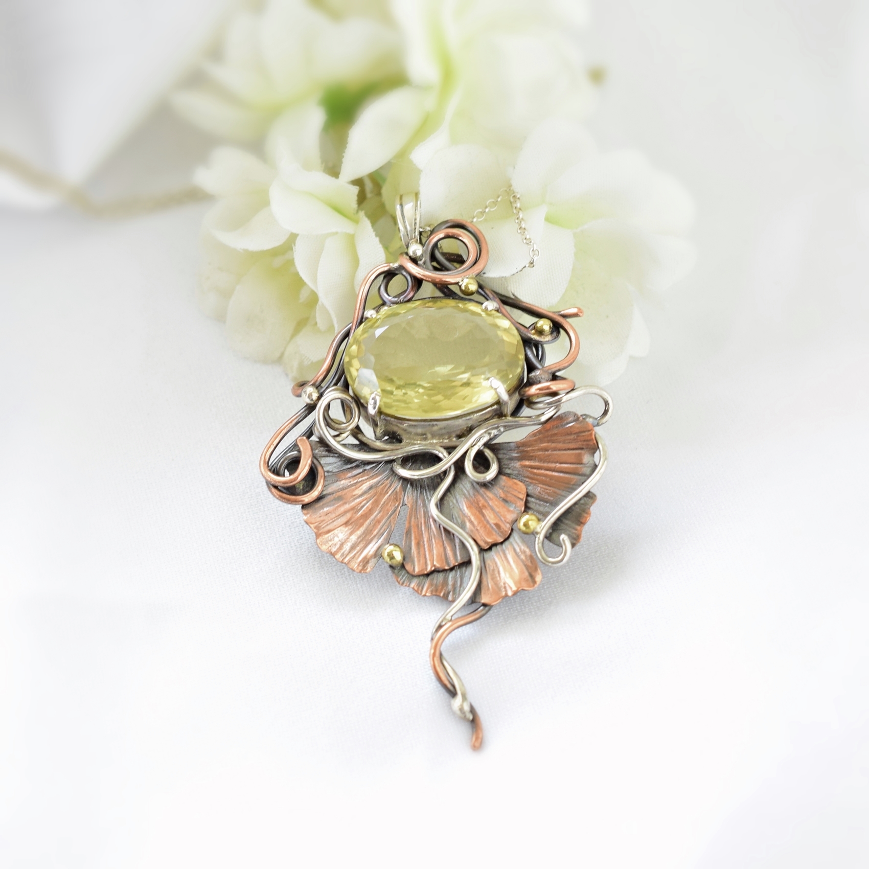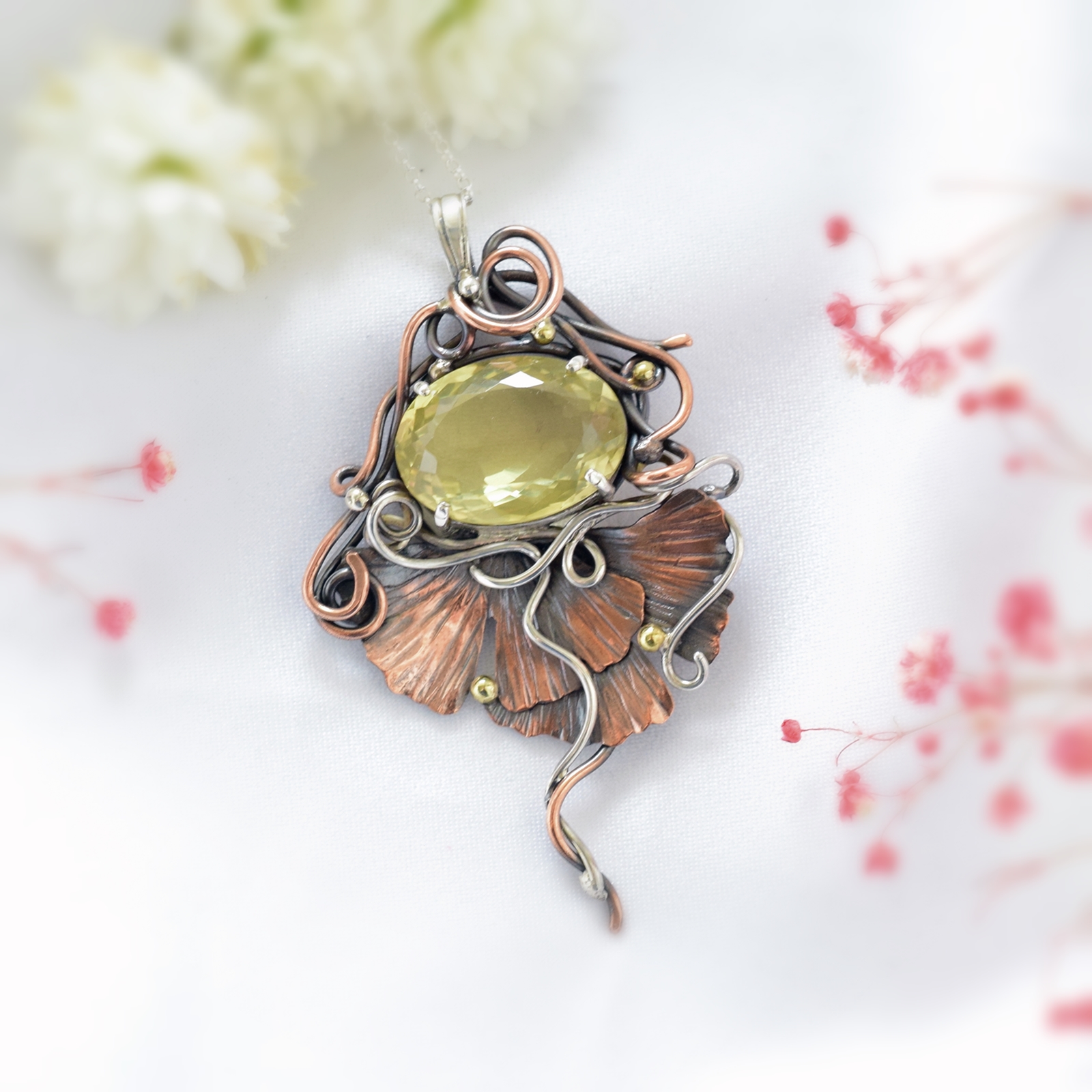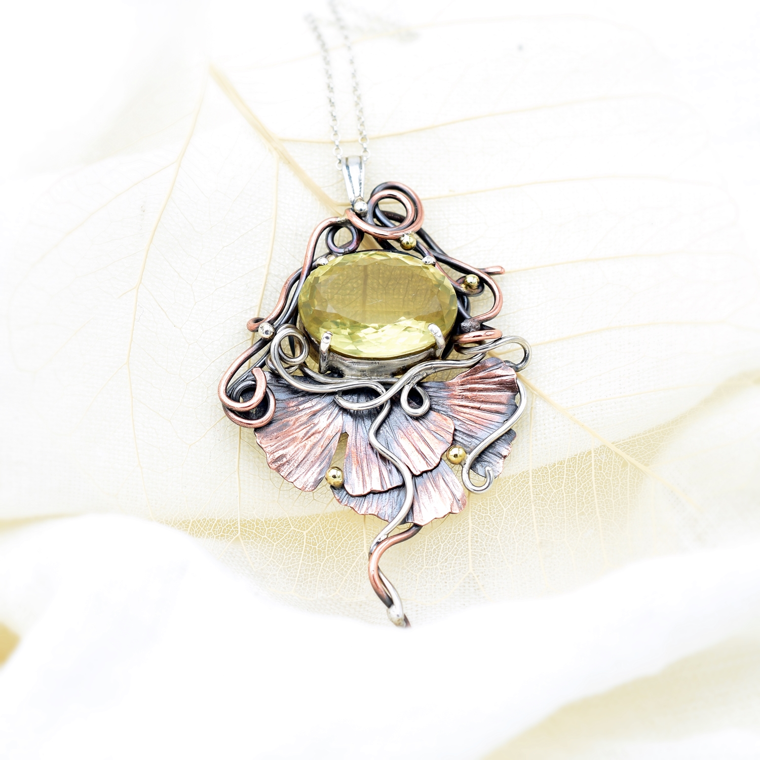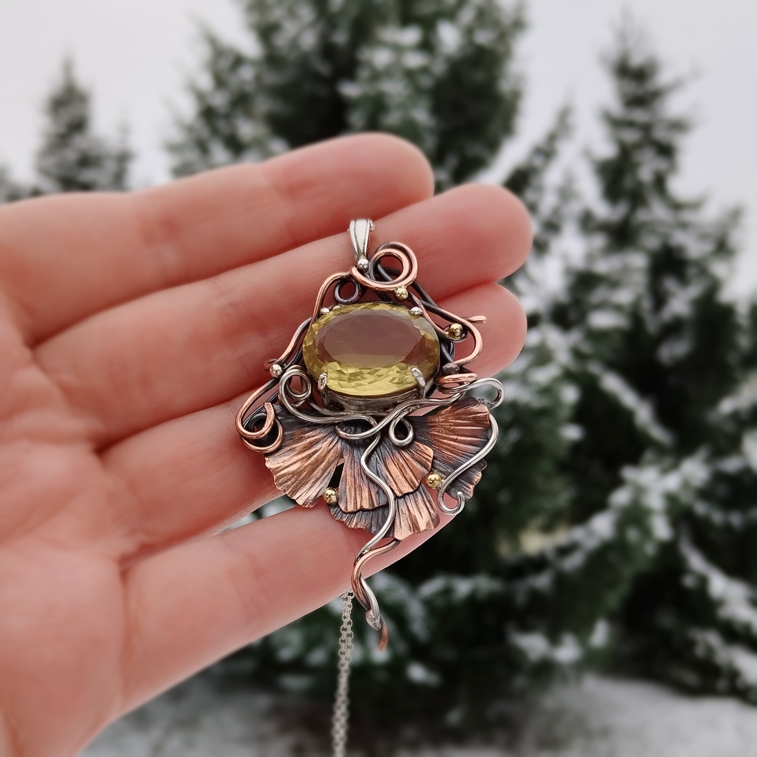 Wisiorek o niezwykłej, artystycznej urodzie z nutą secesji. W centrum kompozycji lśni jasnożółty kwarc cytrynowy, którego słoneczny blask współgra z ciepłymi tonami miedzi i chłodnym połyskiem oksydowanego srebra. Dekoracyjne linie oplatają oprawę niczym roślinne pnącza, prowadząc wzrok ku finezyjnie ukształtowanym liściom miłorzębu. Złote akcenty dodają całości elegancji, podkreślając grę kolorów.