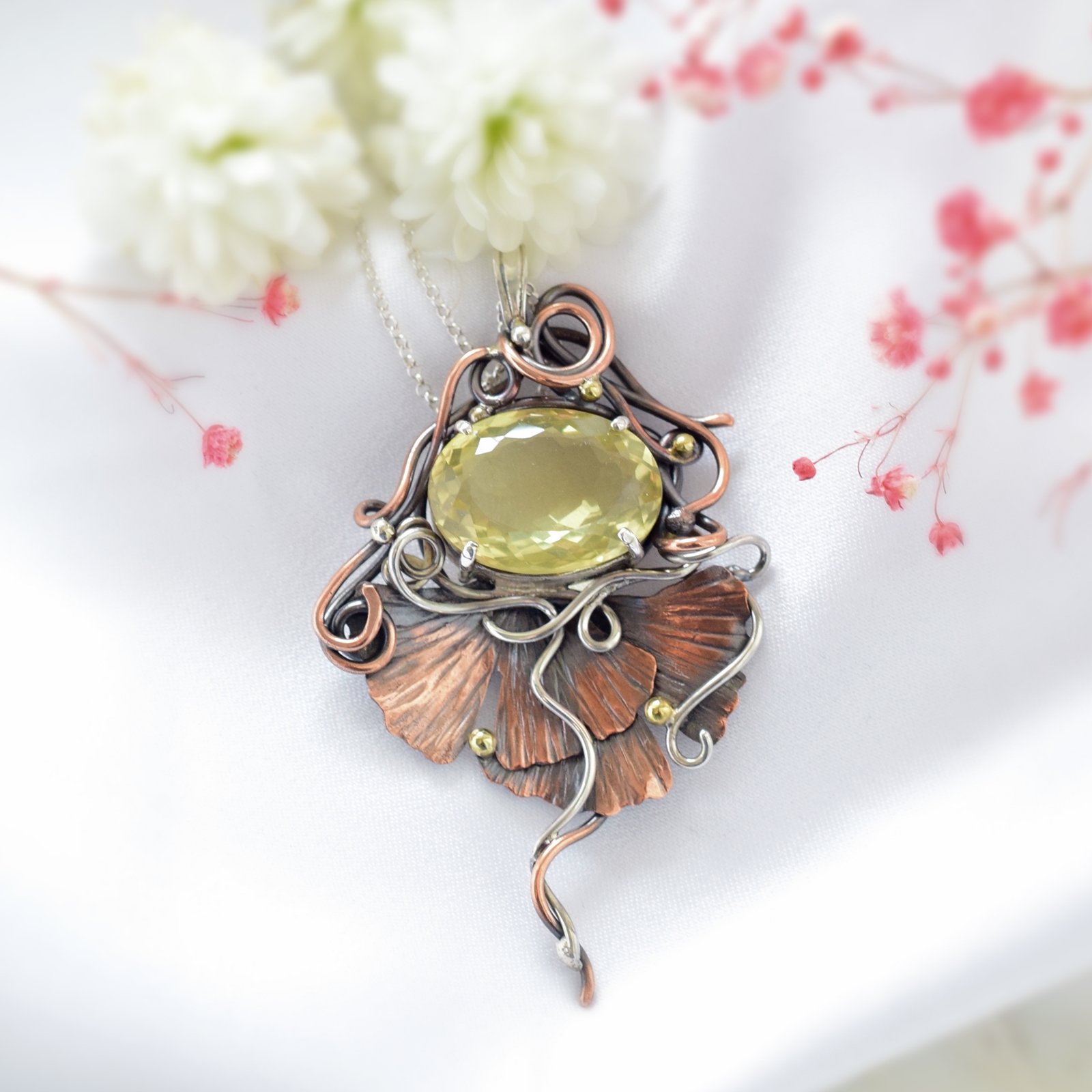 Artystyczny wisiorek z miłorzębem i kwarcem cytrynowym