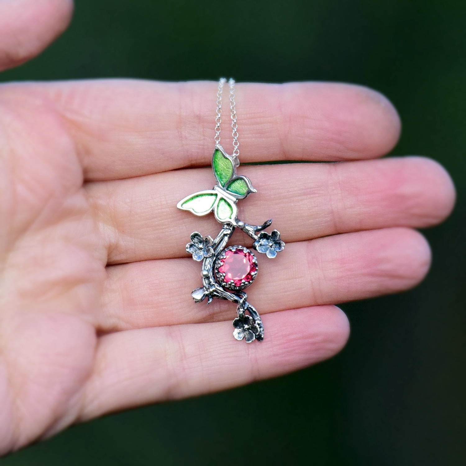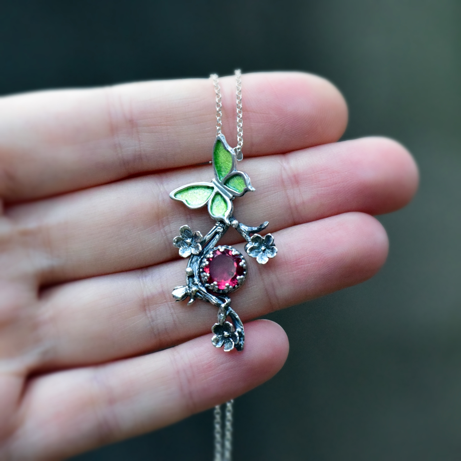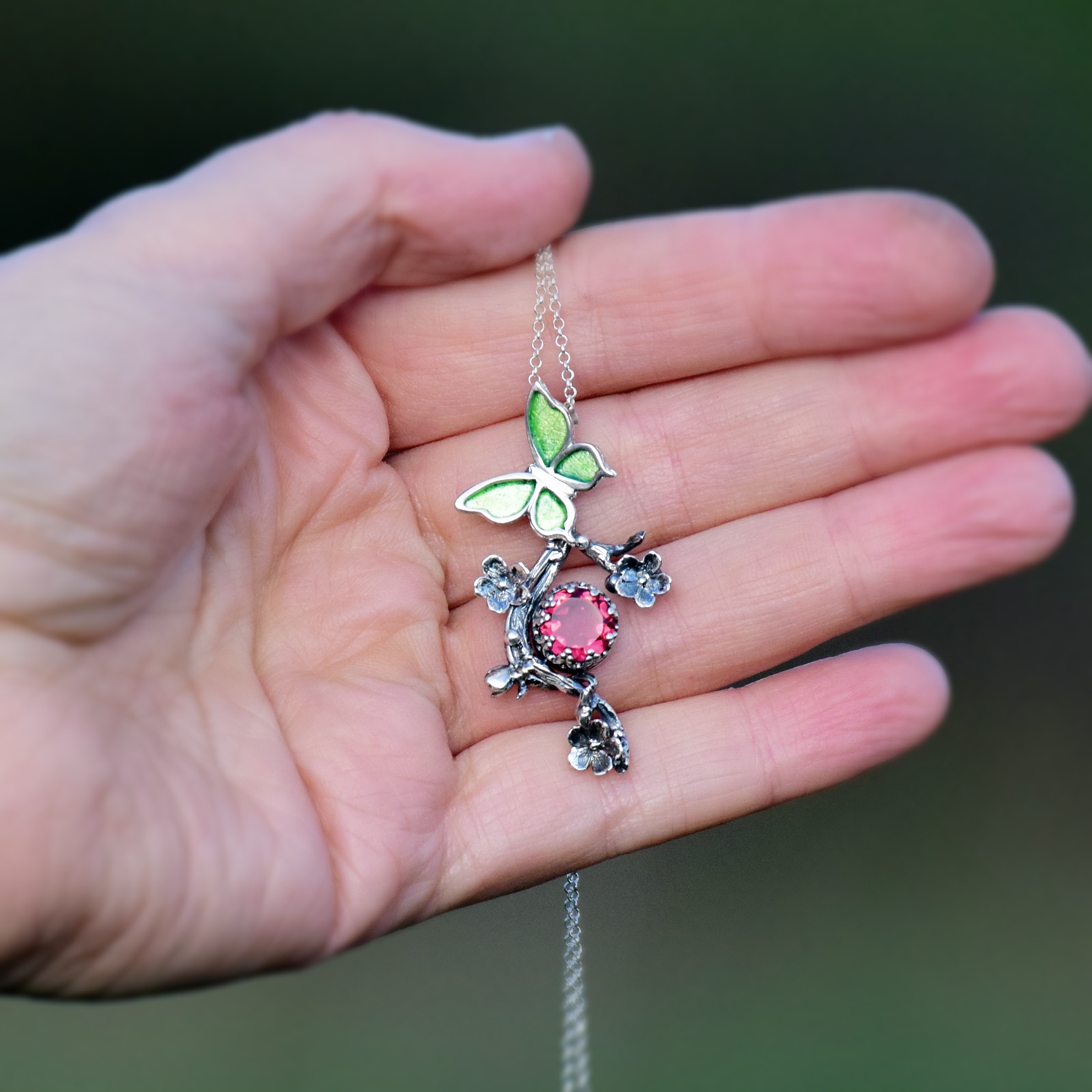Słodki jak landrynka turmalin i soczyście zielony motylek zapraszają do zanurzenia się w atmosferze wiosennej łąki wypełnionej słońcem i subtelną wonią kwiatów.