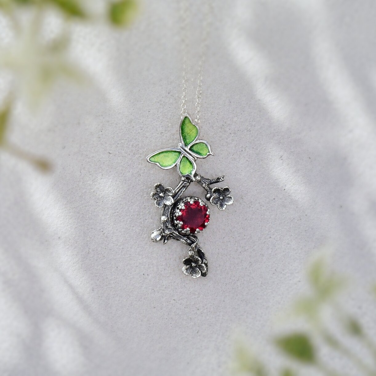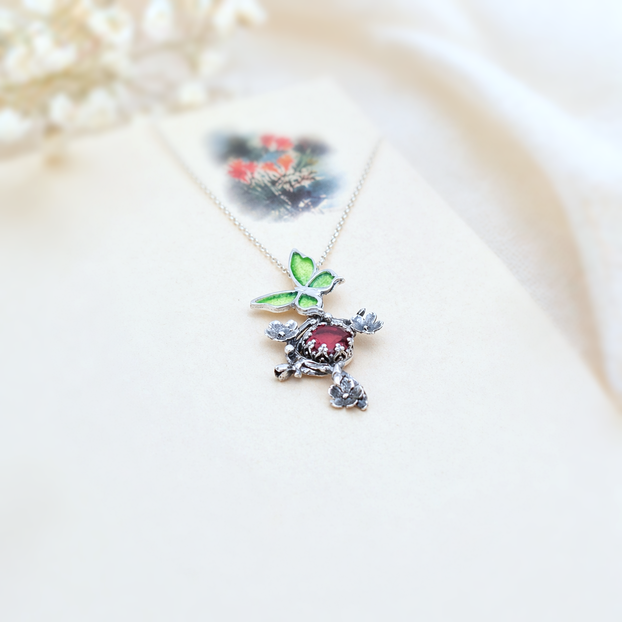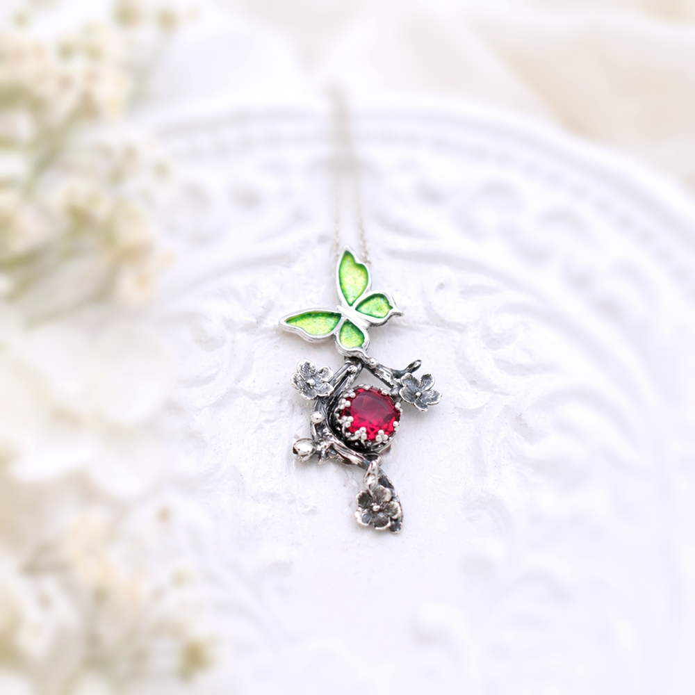Słodki jak landrynka turmalin i soczyście zielony motylek zapraszają do zanurzenia się w atmosferze wiosennej łąki wypełnionej słońcem i subtelną wonią kwiatów.