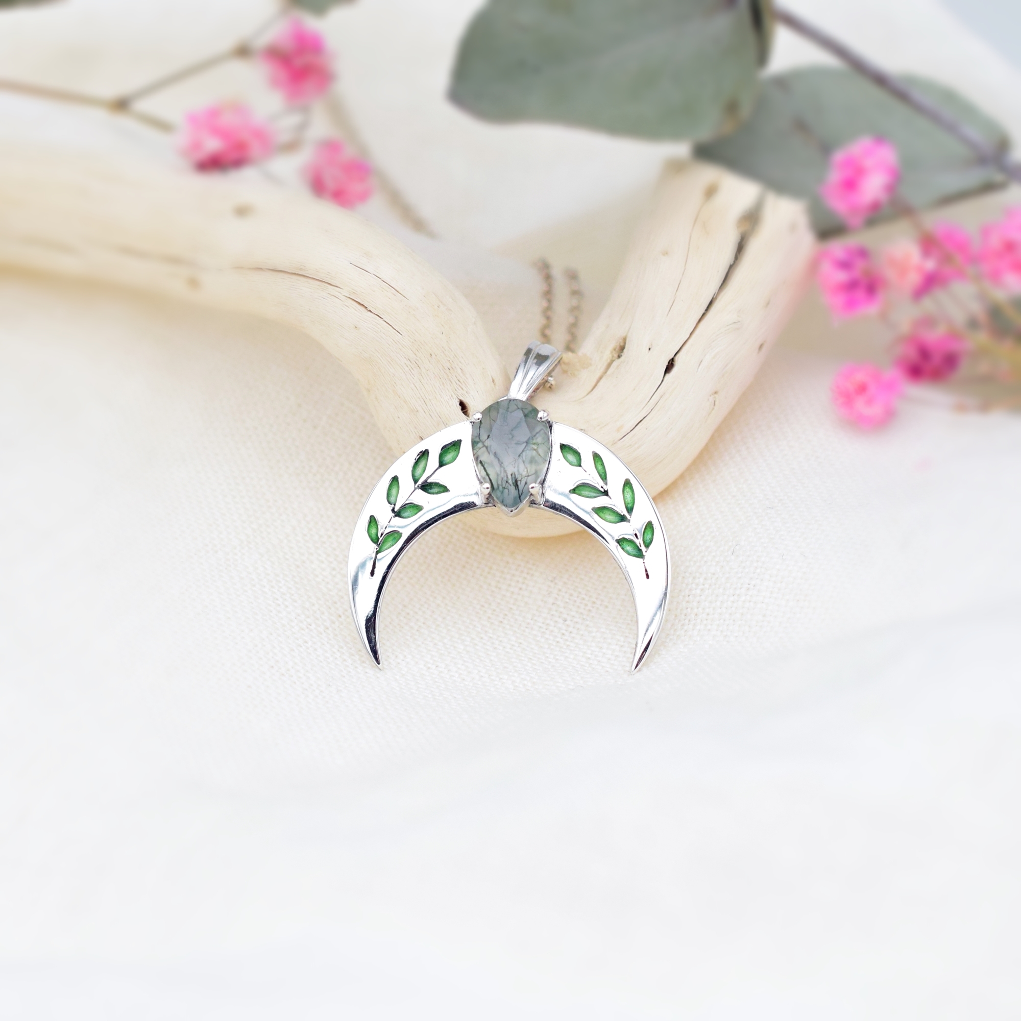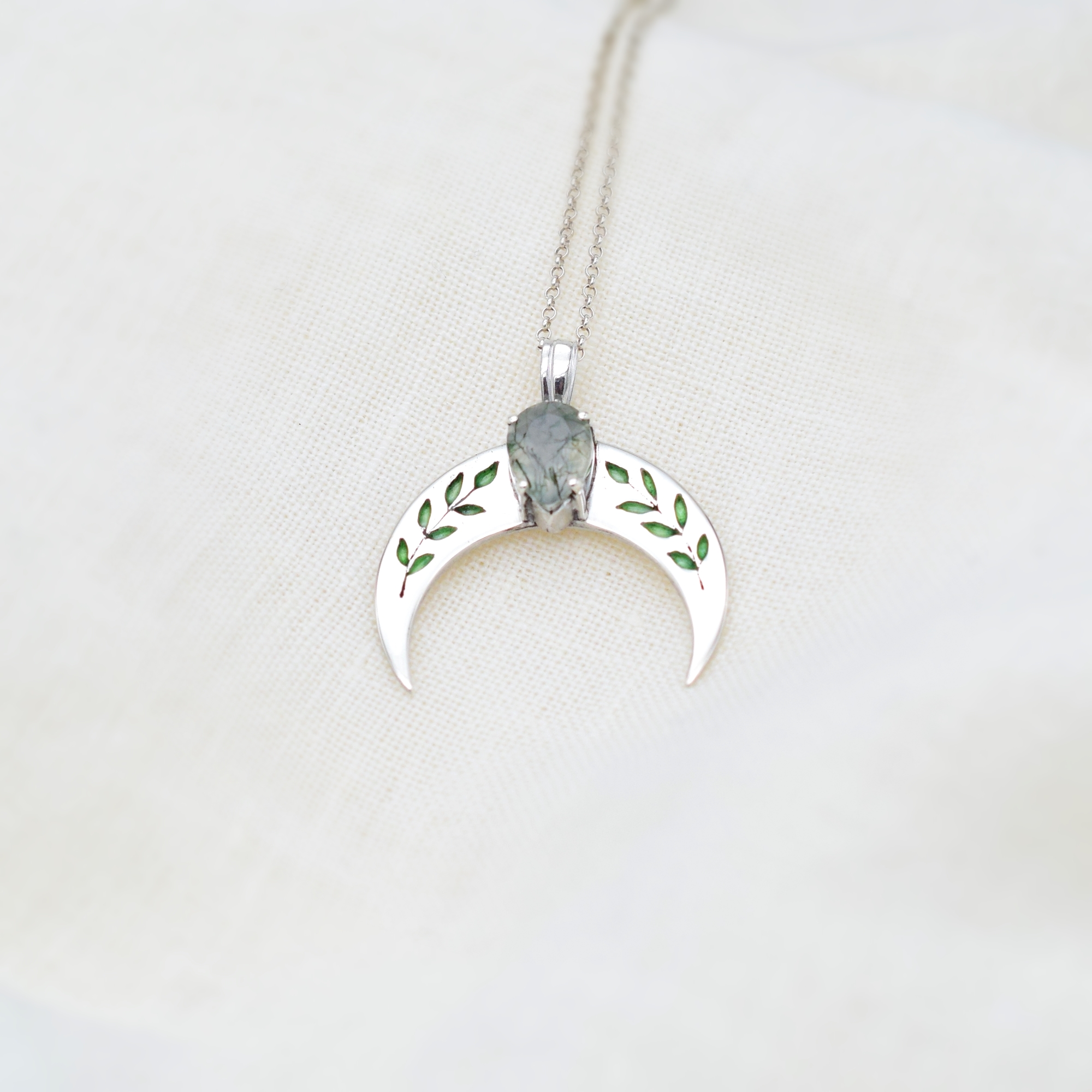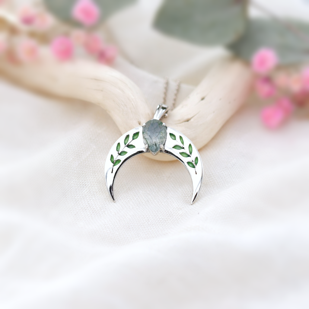 Srebrna Lunula z wiosenno zielonymi listkami, ozdobiona łezką naturalnego agatu mszystego.