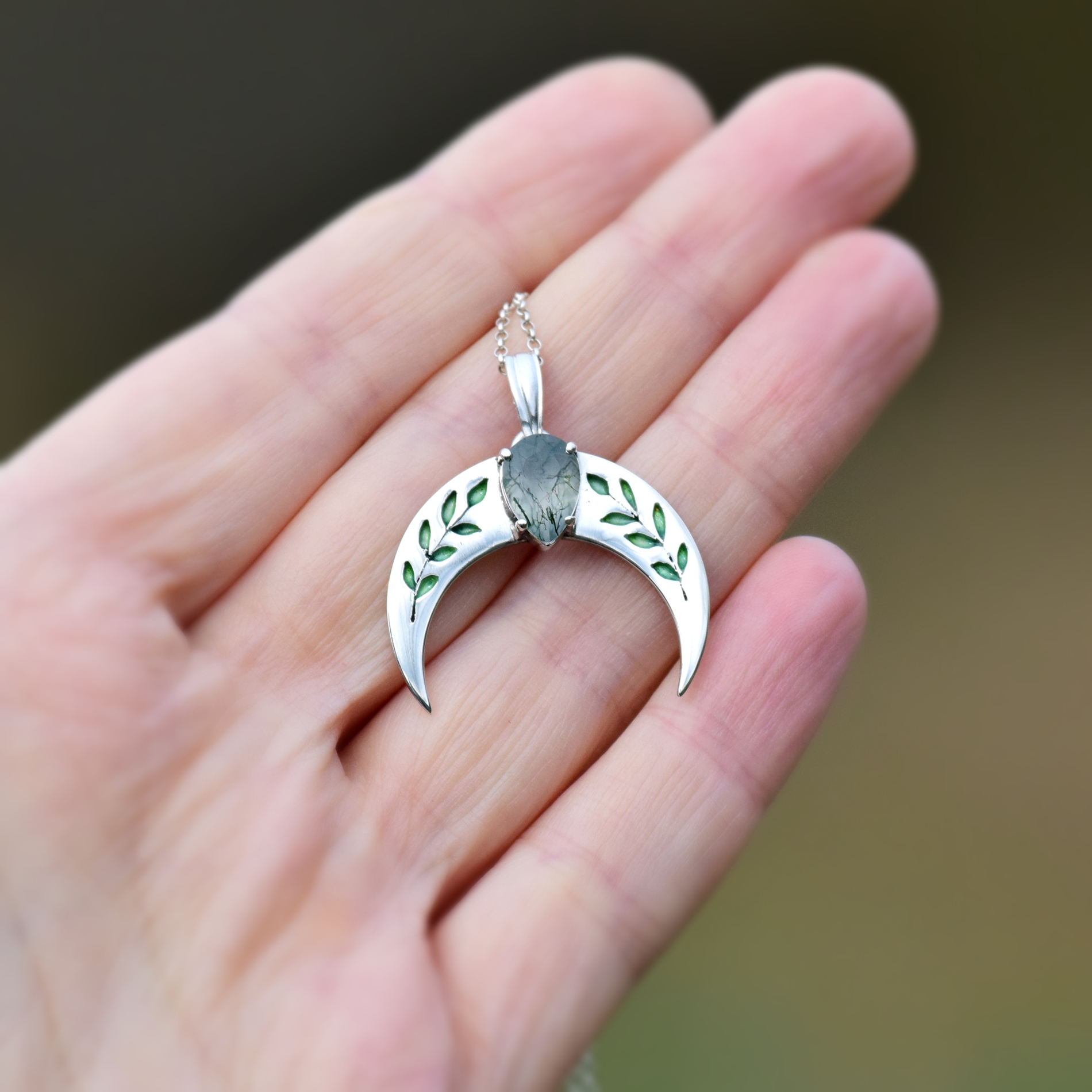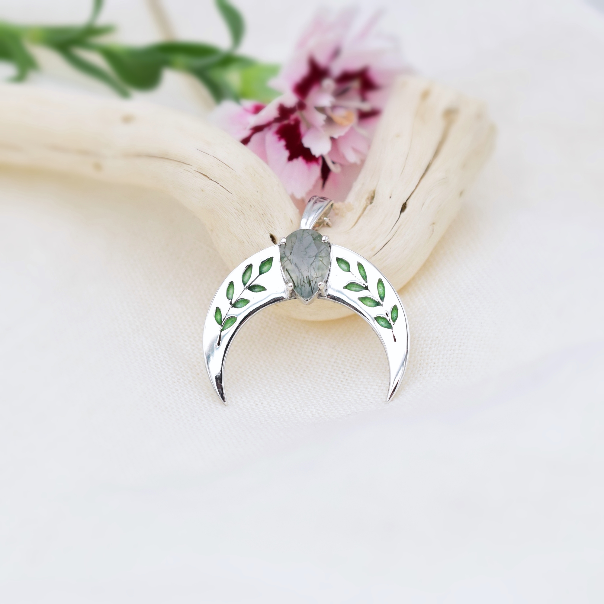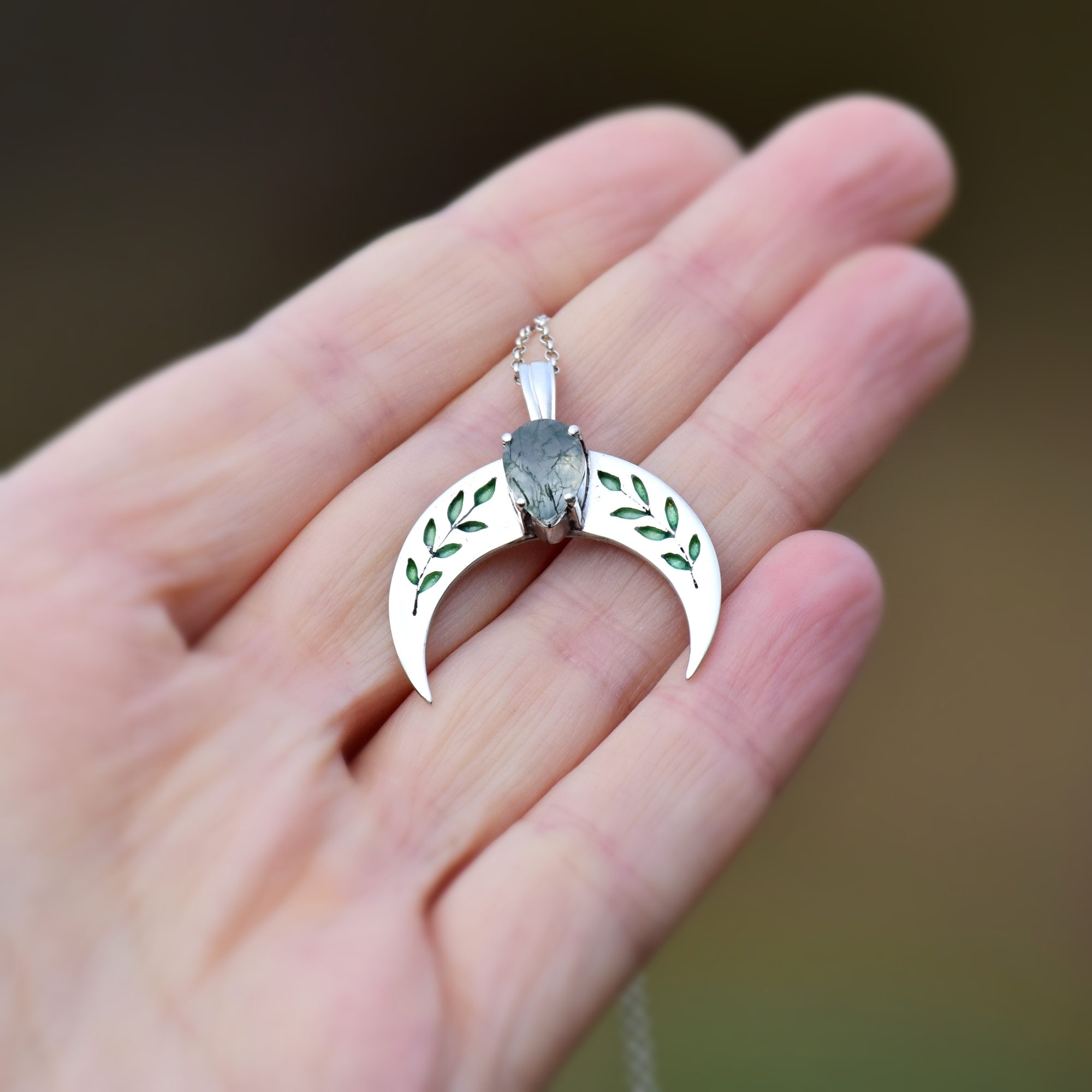 Srebrna Lunula z wiosenno zielonymi listkami, ozdobiona łezką naturalnego agatu mszystego.