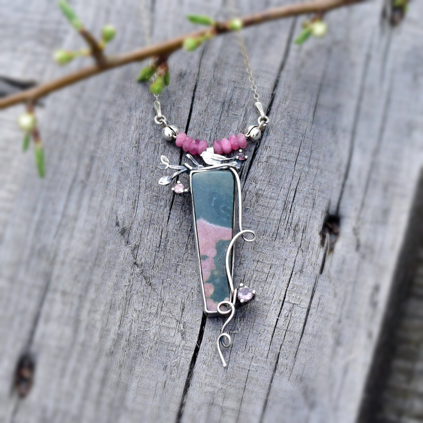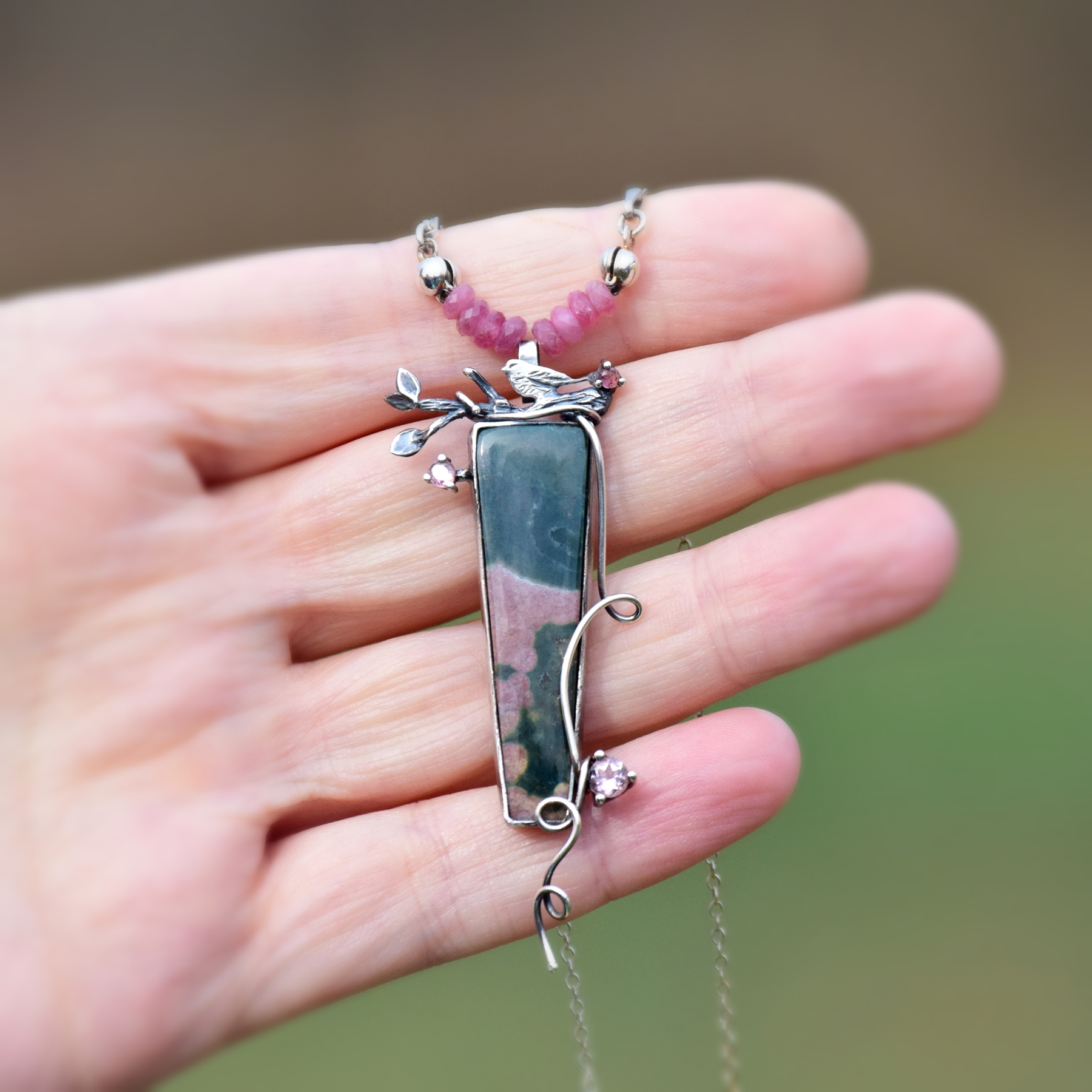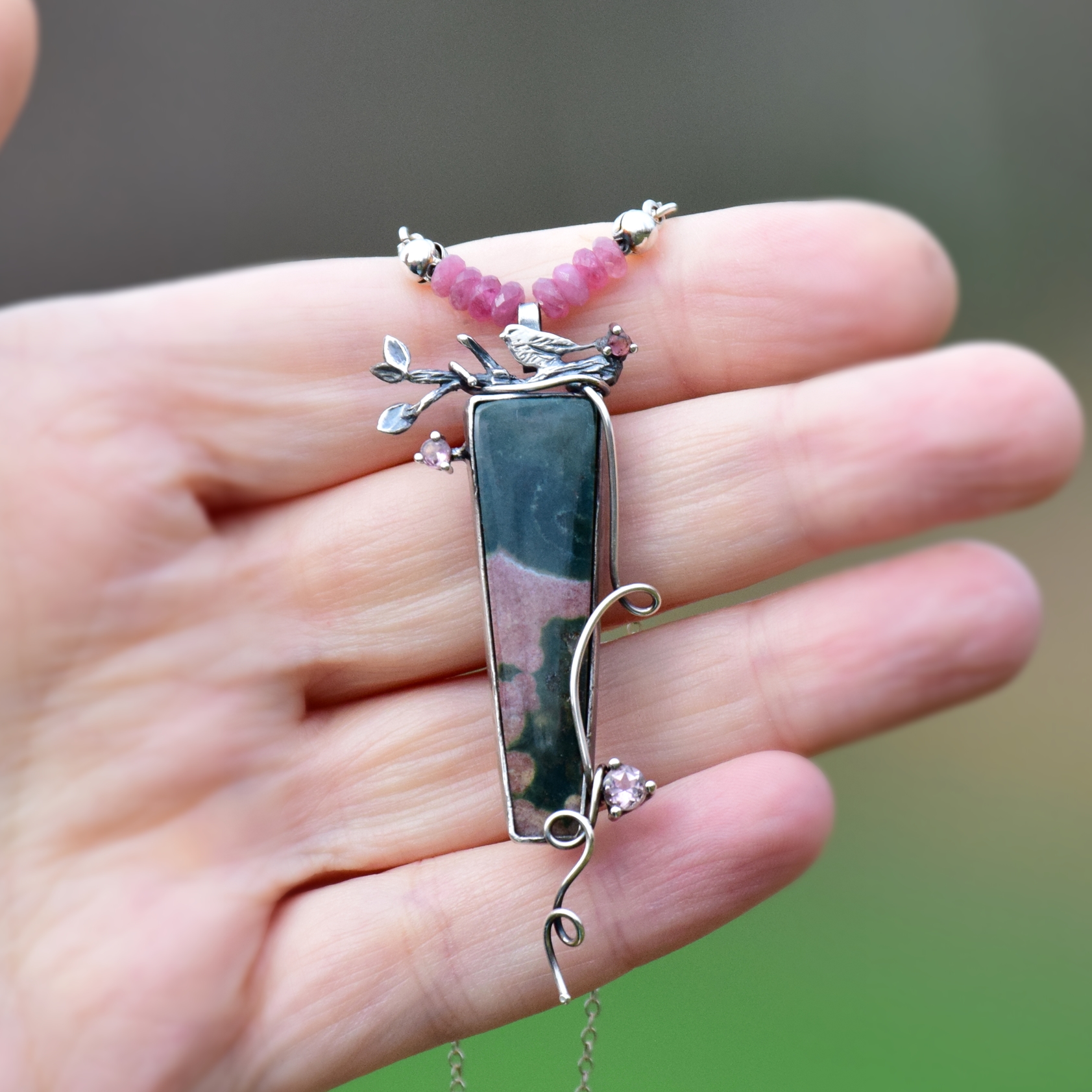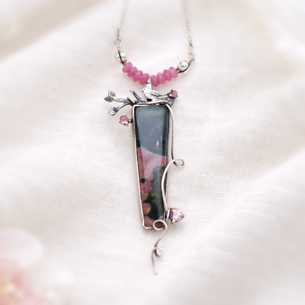 Przy zawieszce znajduje się rządek oponek różowych turmalinów, kolorystycznie nawiązujących do różowych tonów kamienia. Dalej przechodzą one w delikatny srebrny łańcuszek.